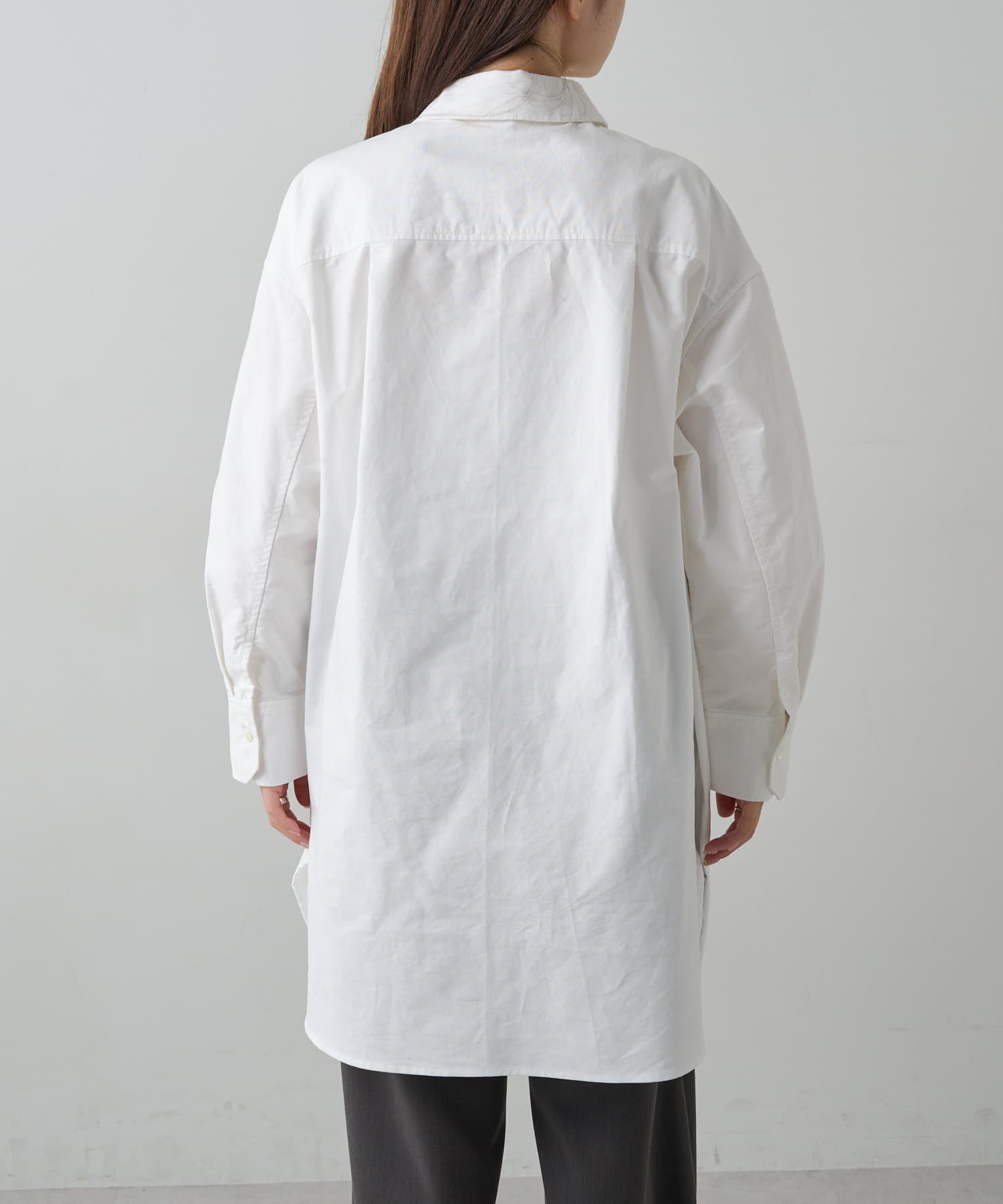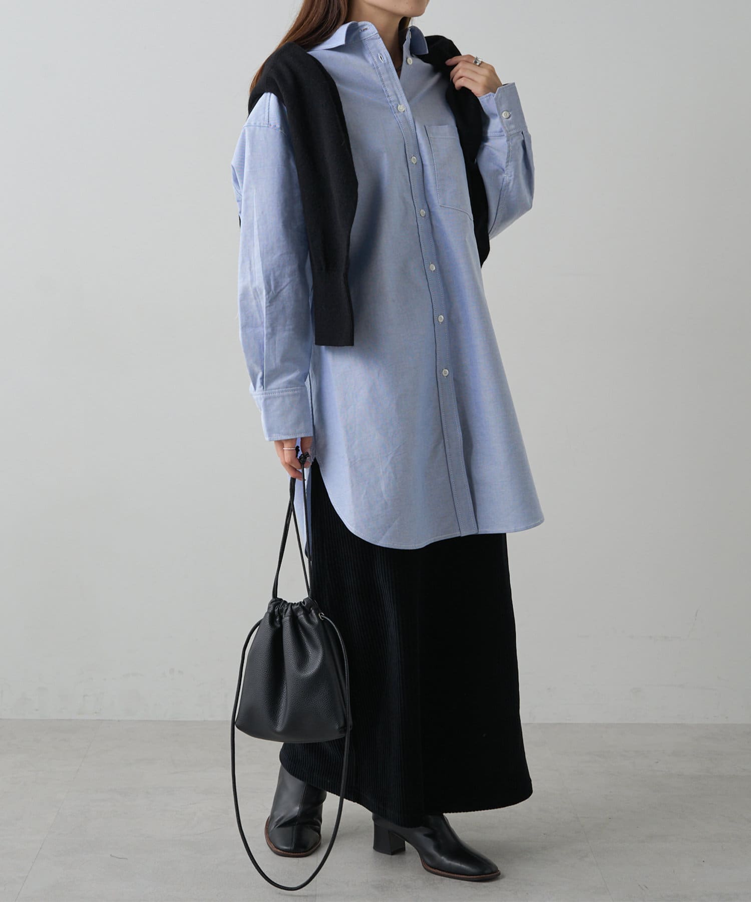 着用感:太ももまですっぽり覆うオーバーサイズ。厚みのあるシャツなので、ロングシーズン着回せそうです。
