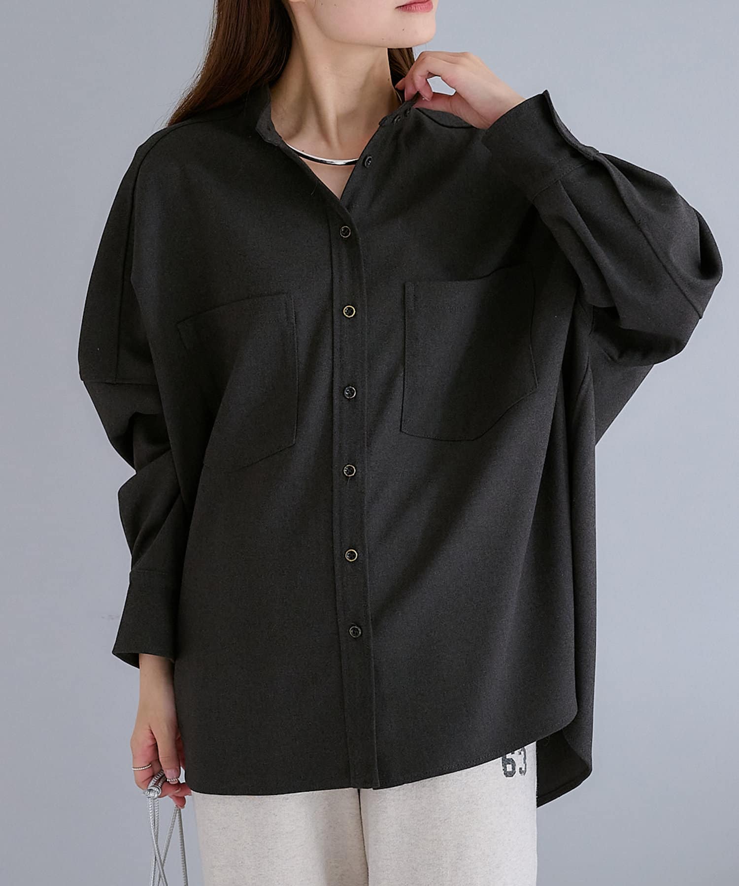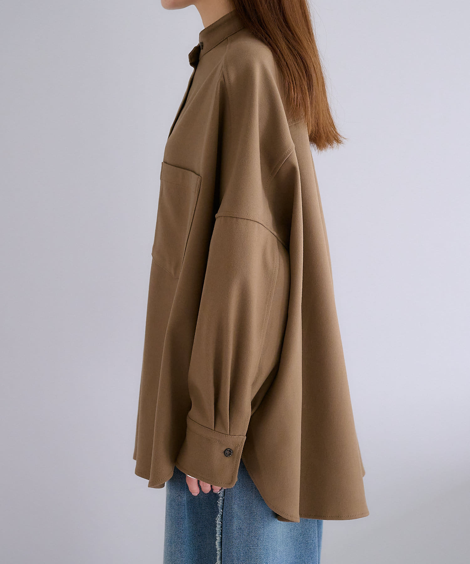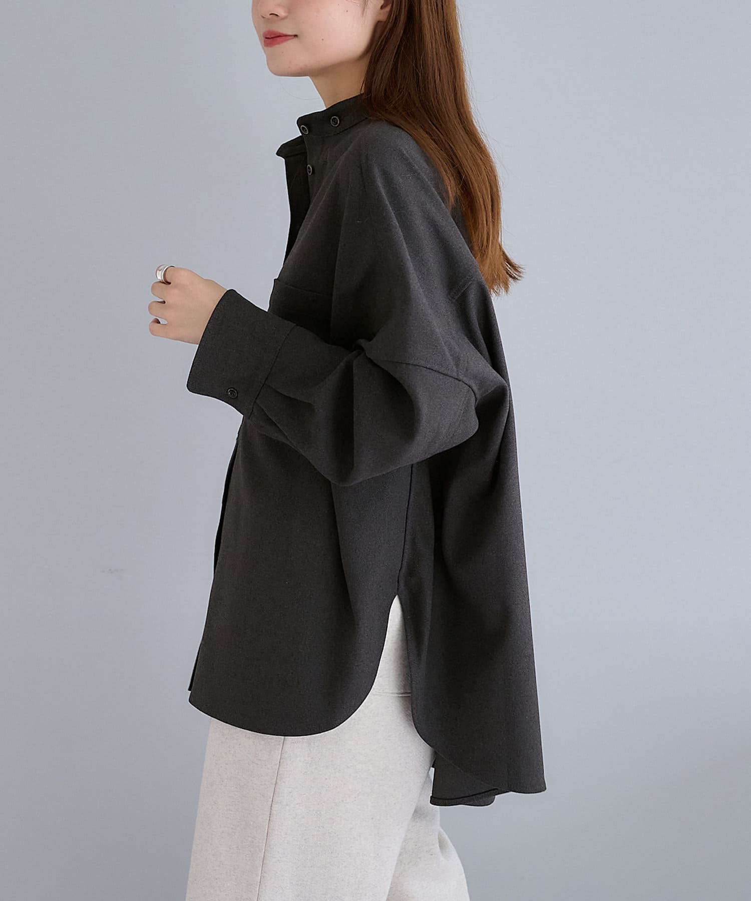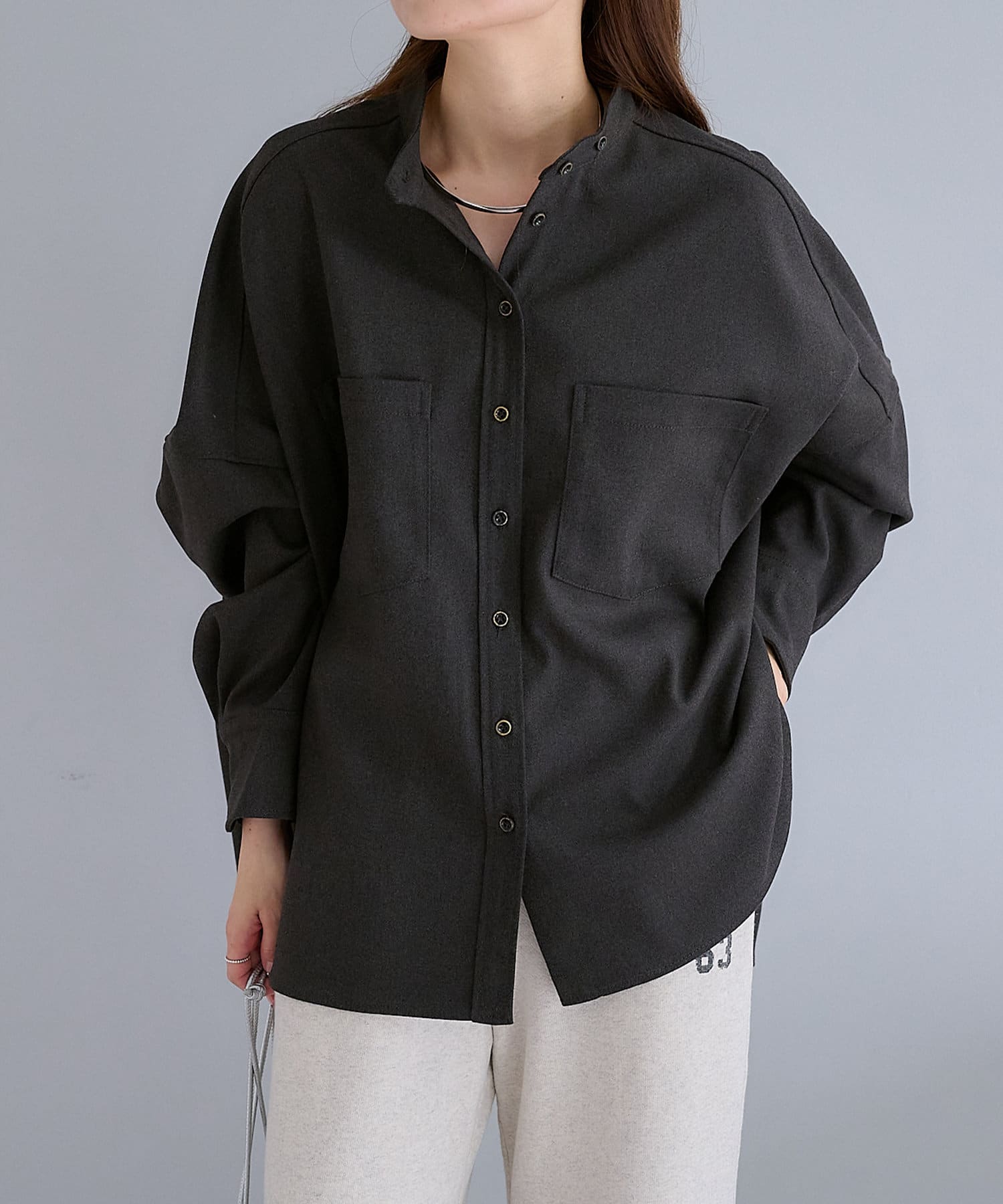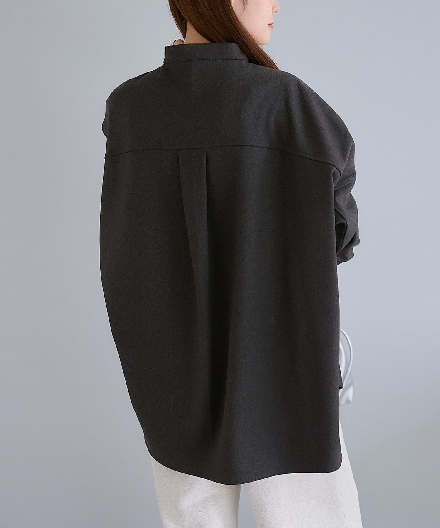 ややオーバーなサイズ感のバンドカラーシャツ。