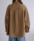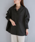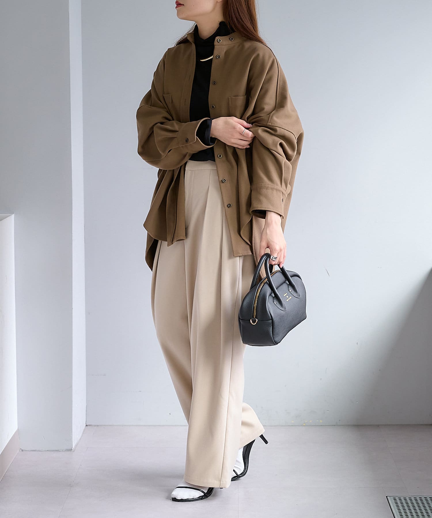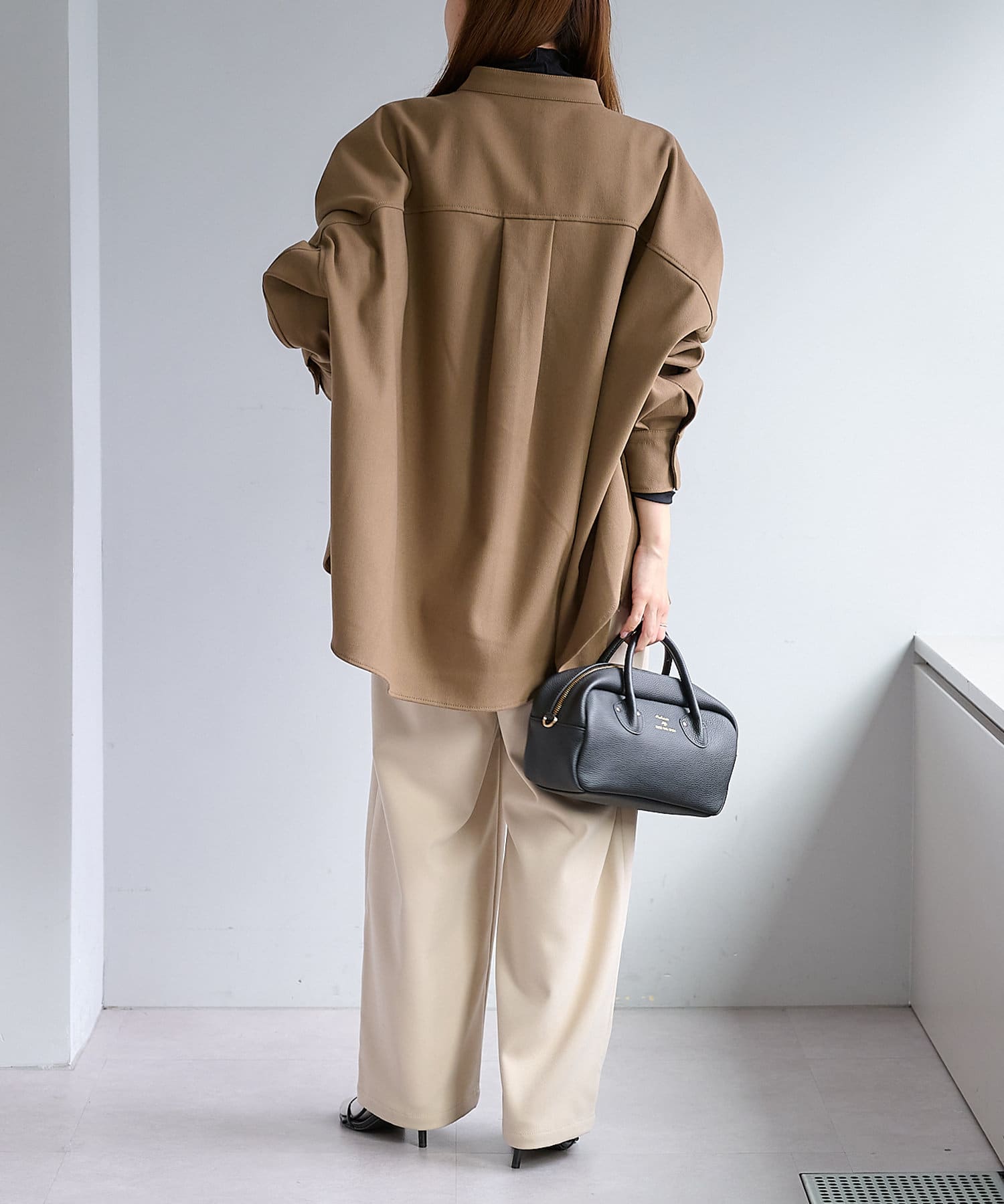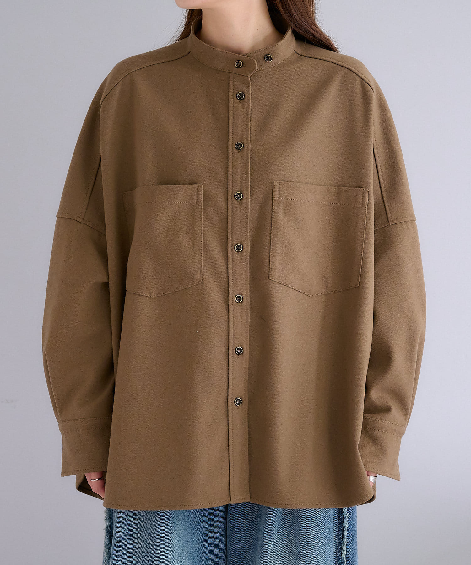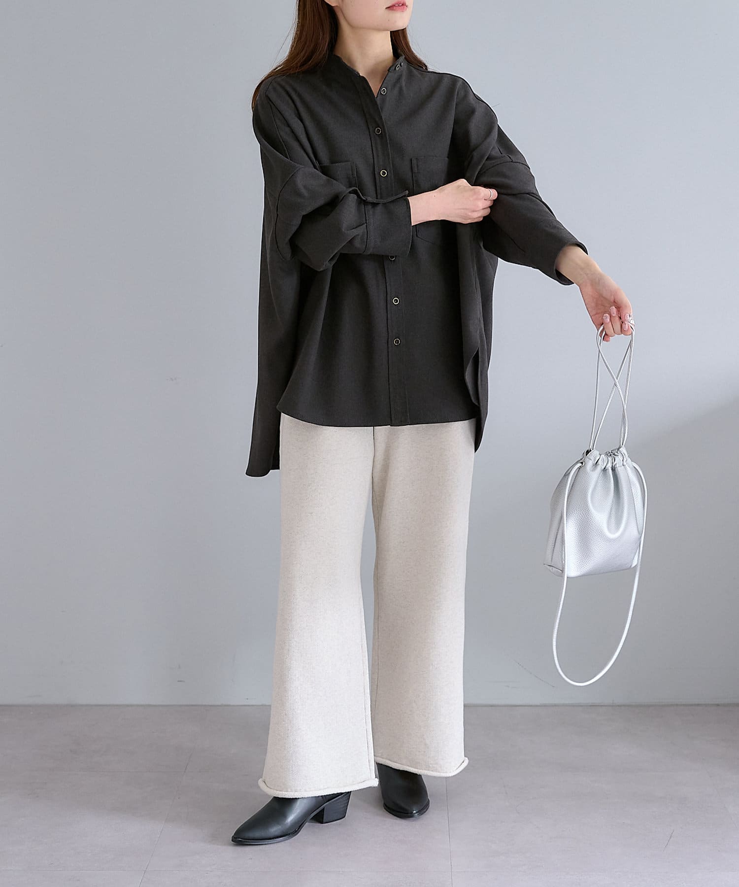 ややオーバーなサイズ感のバンドカラーシャツ。