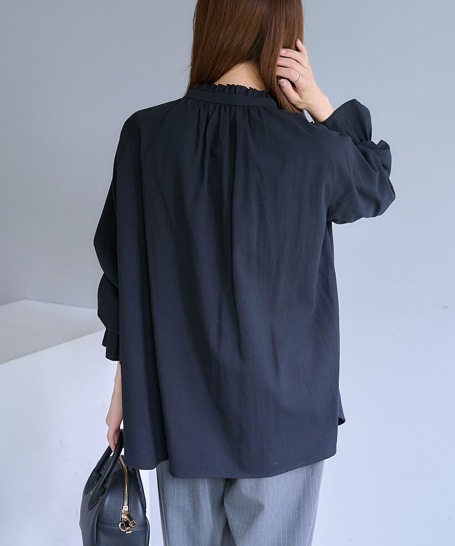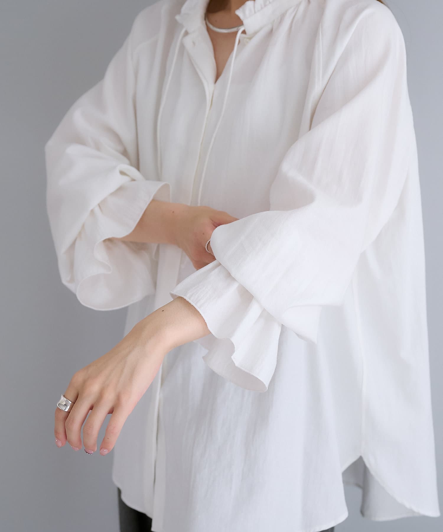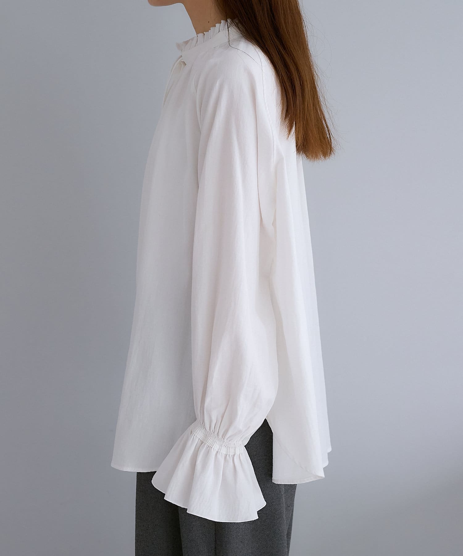 襟フリルや袖のフレアデザインが可愛らしい印象ながらも、控えめなフリルを施したバンドカラーが大人も着やすいクラシカルな1枚に仕上げました。
