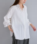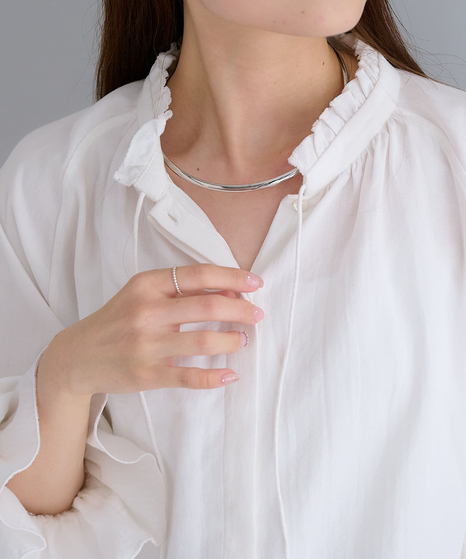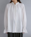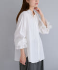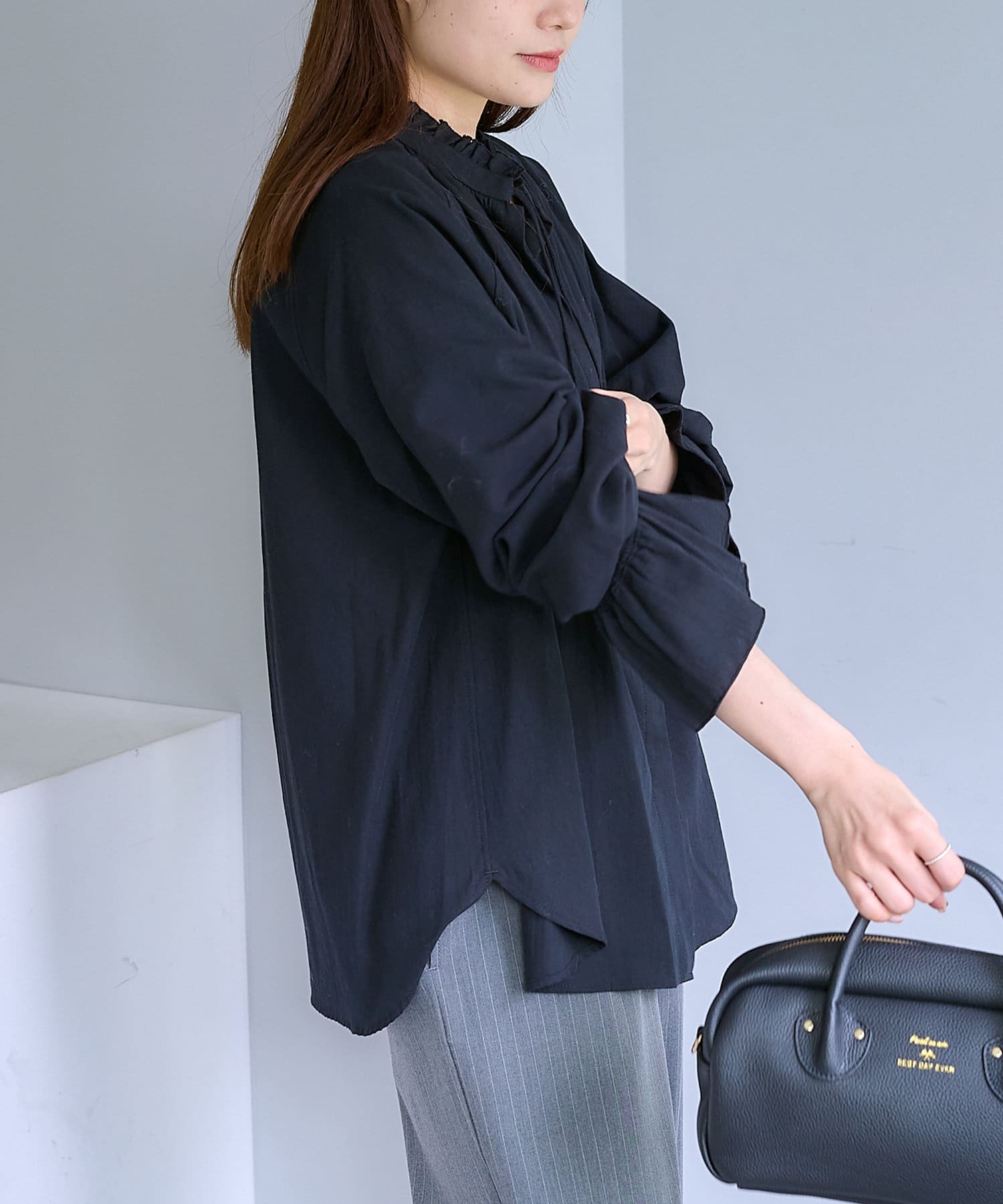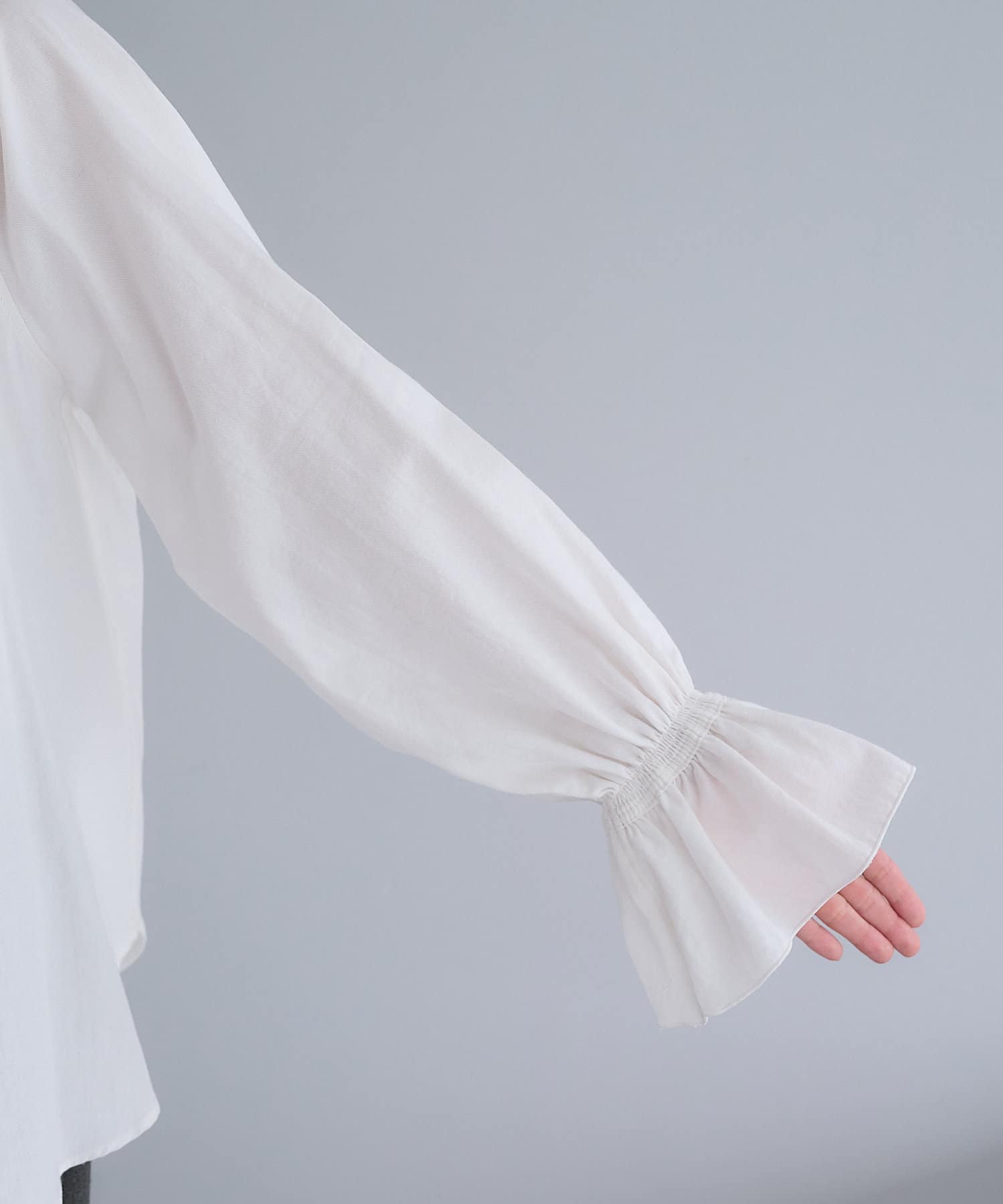 襟フリルや袖のフレアデザインが可愛らしい印象ながらも、控えめなフリルを施したバンドカラーが大人も着やすいクラシカルな1枚に仕上げました。