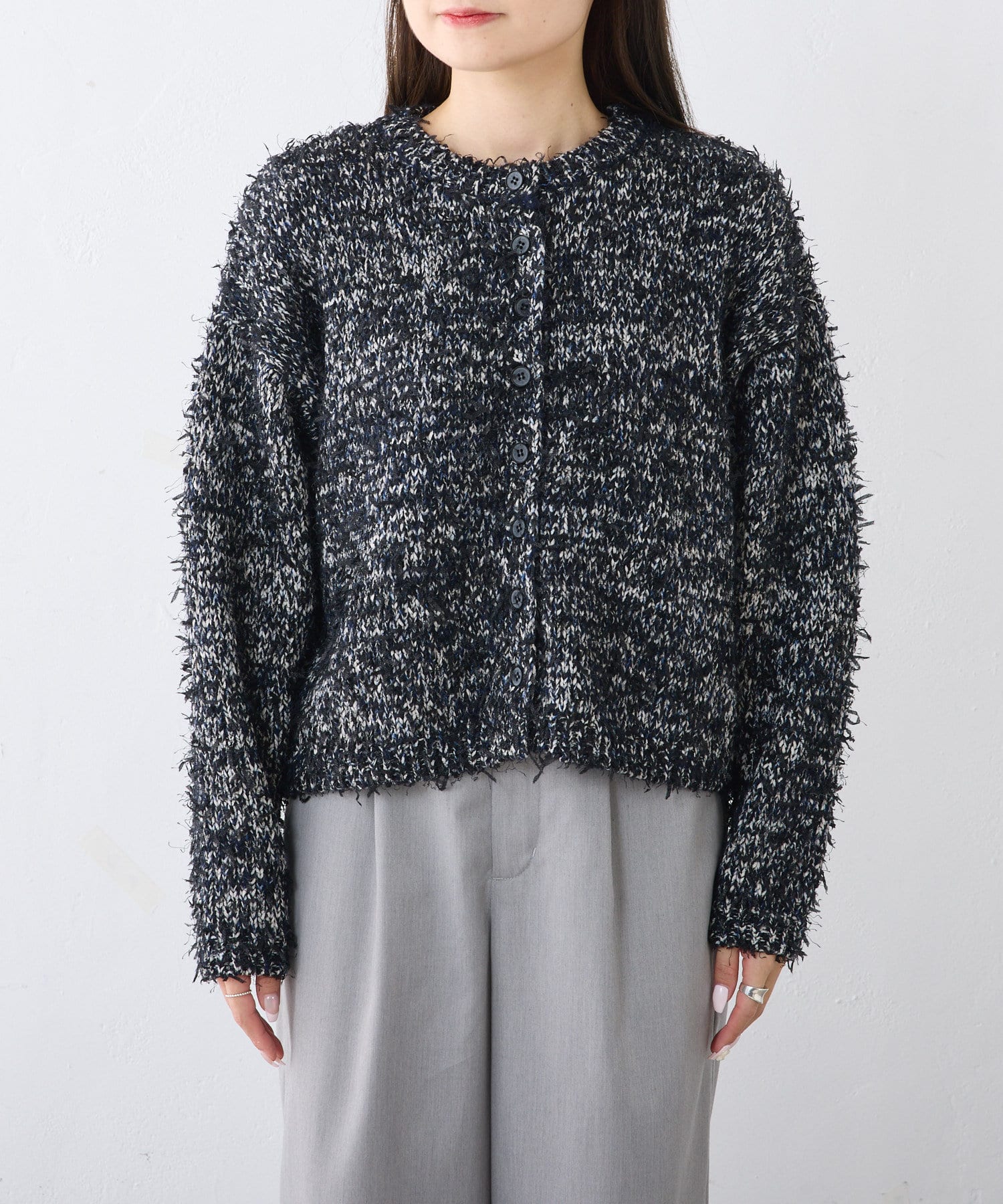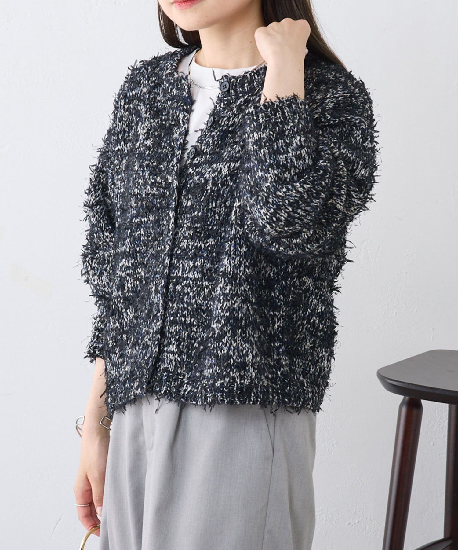 クルーネックノーカラーカーディガンは