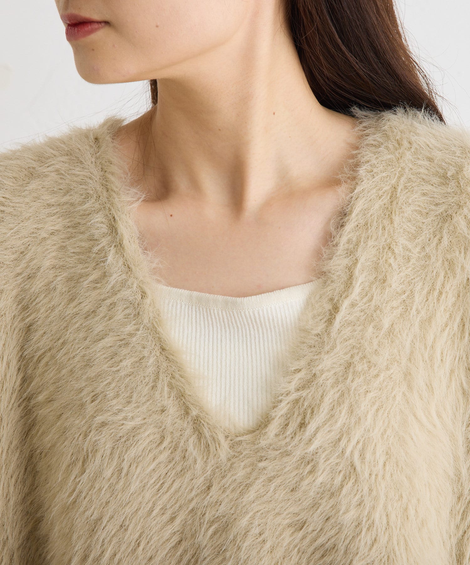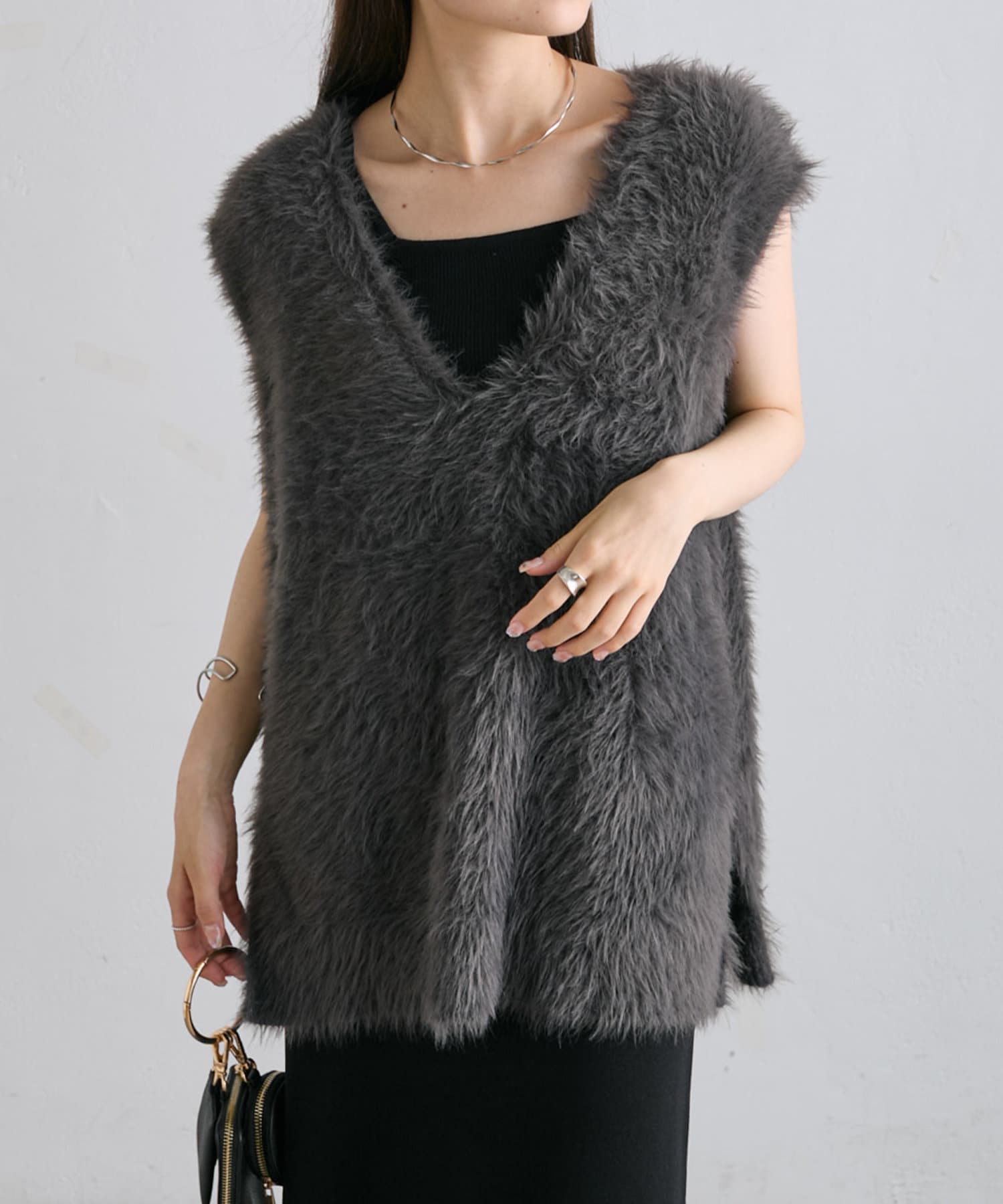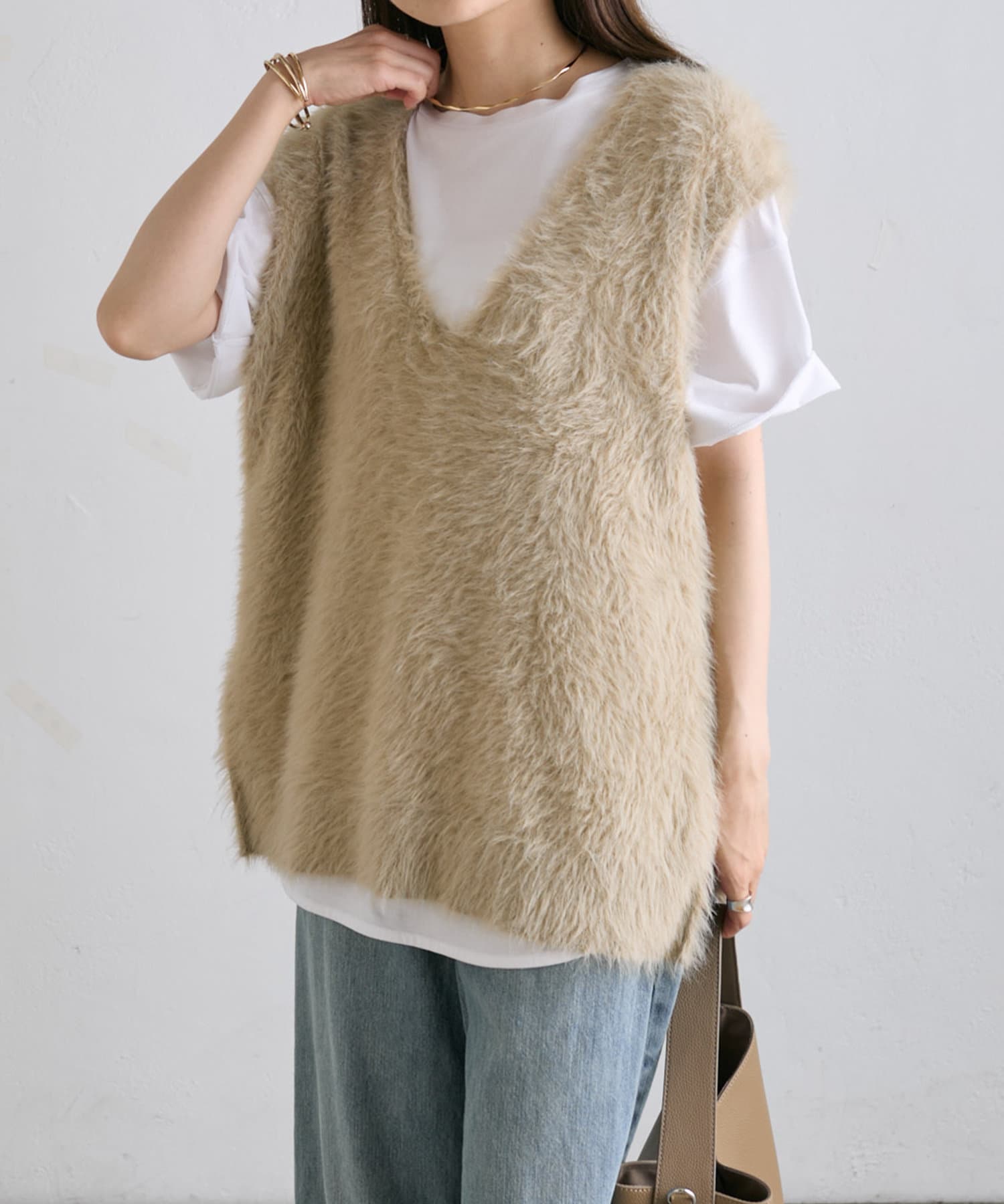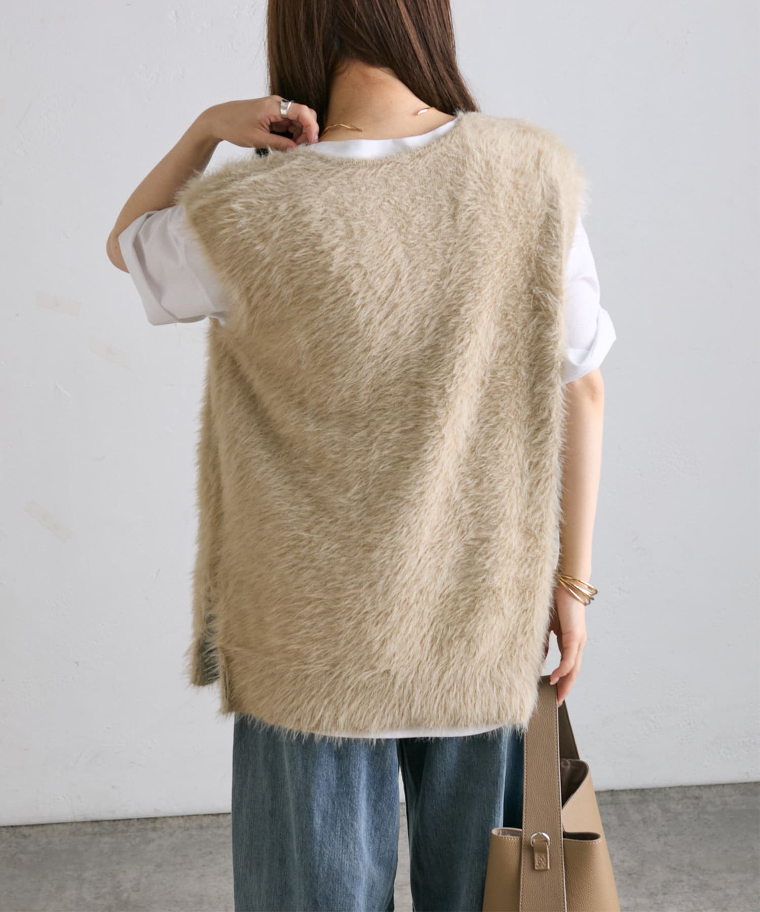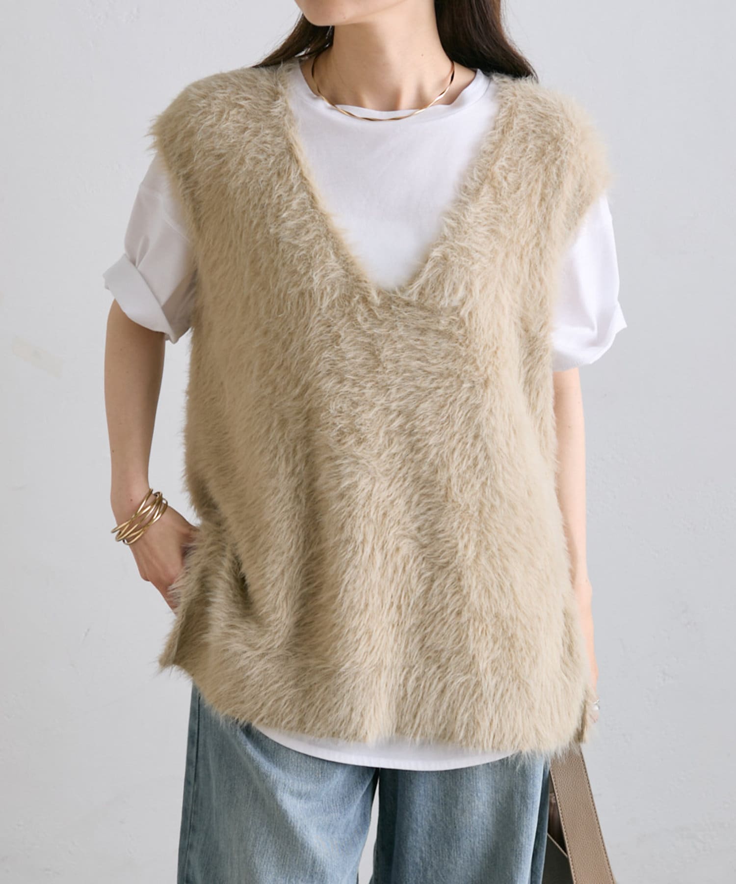 ボリューム感のある毛並みが1枚で華やかに決まるニットベスト。