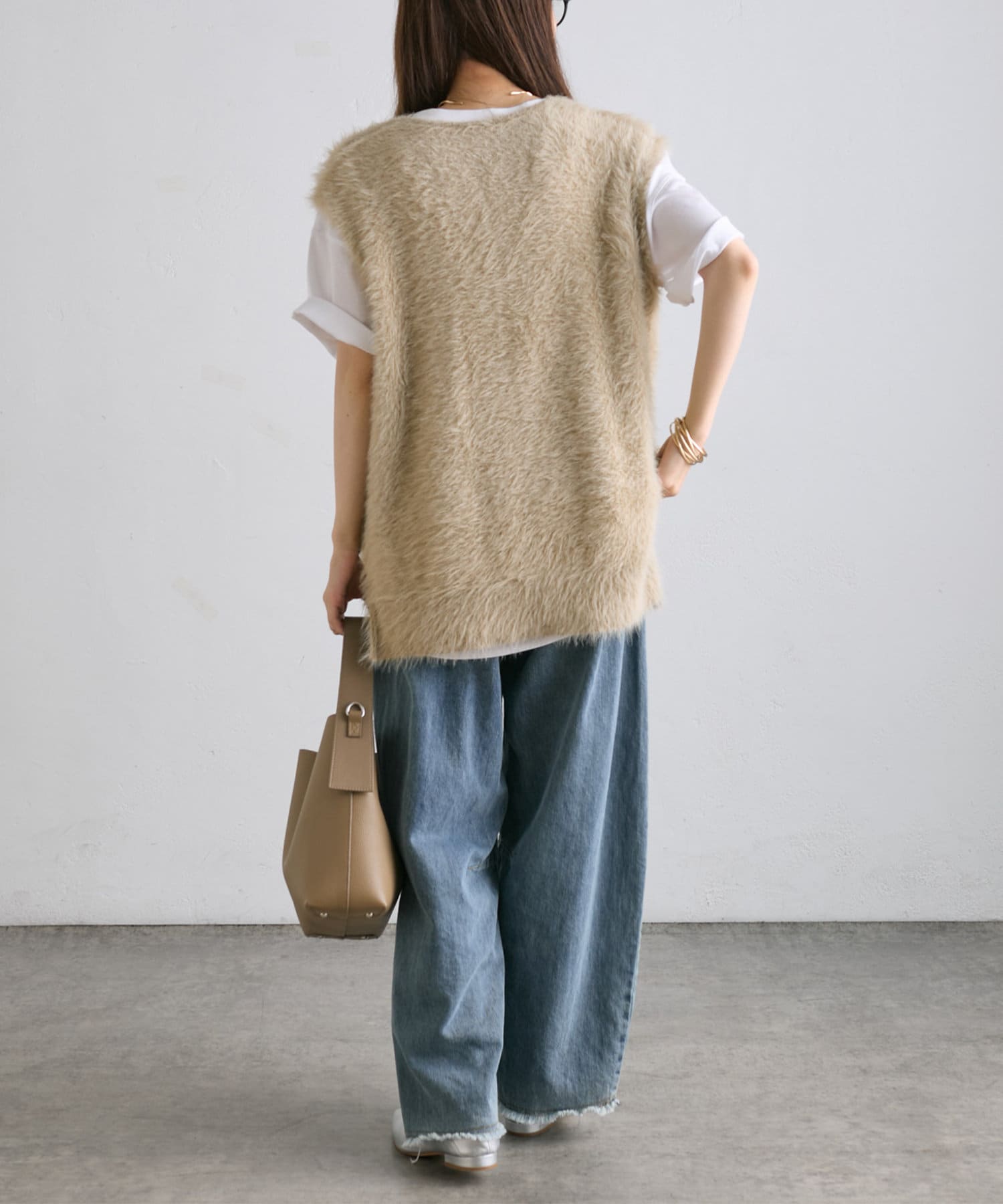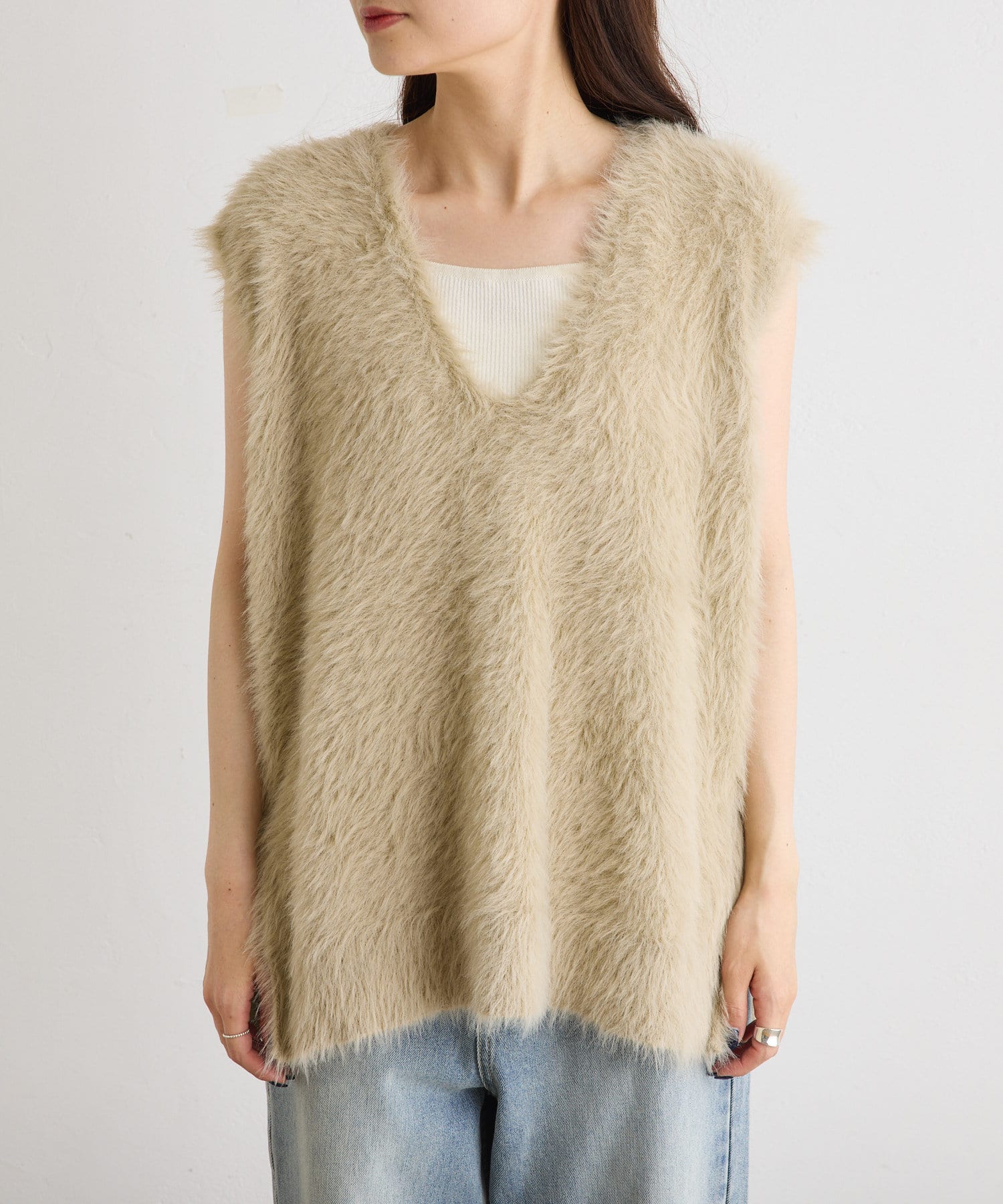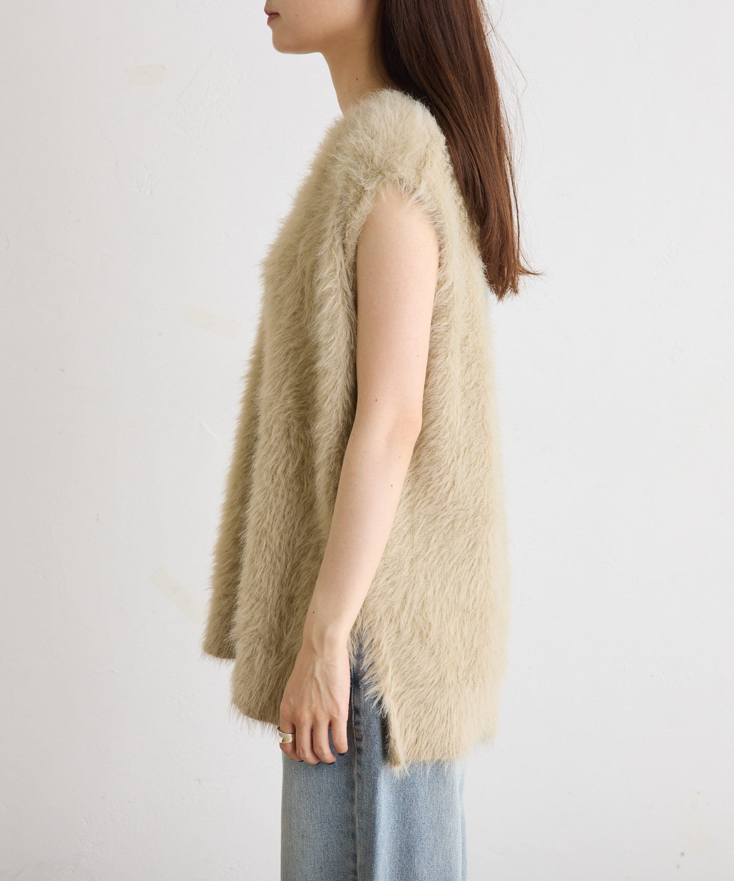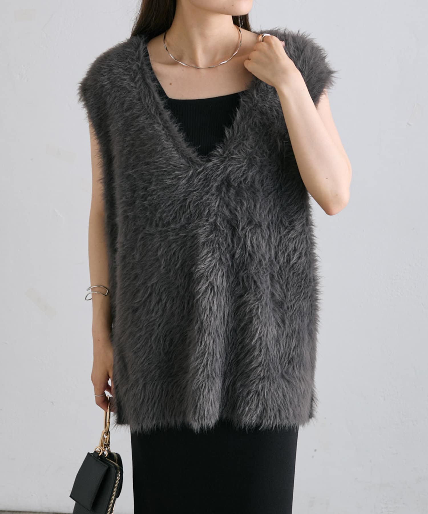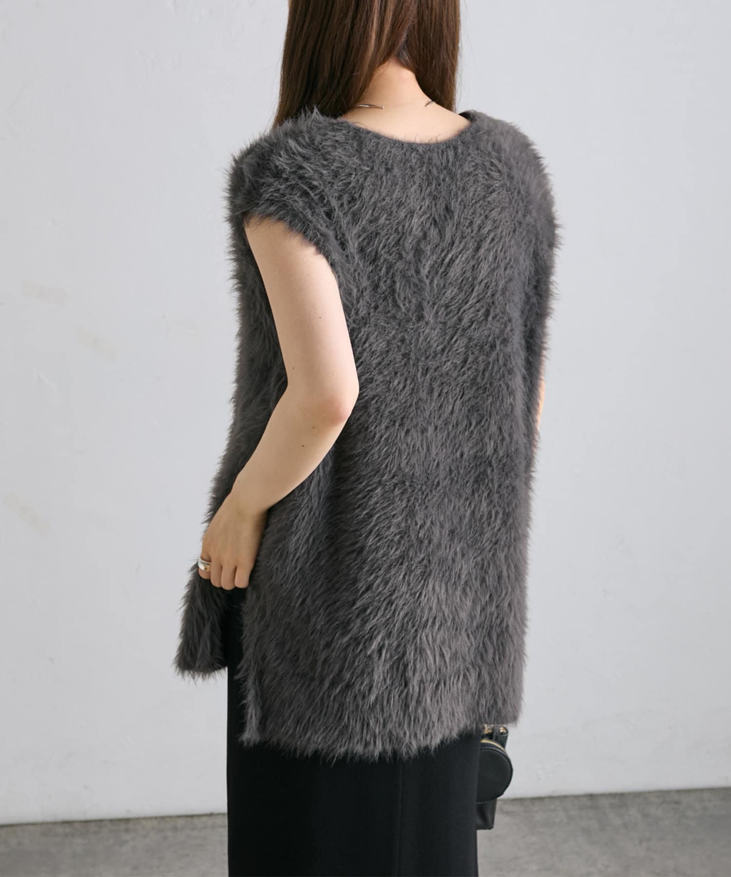 ボリューム感のある毛並みが1枚で華やかに決まるニットベスト。