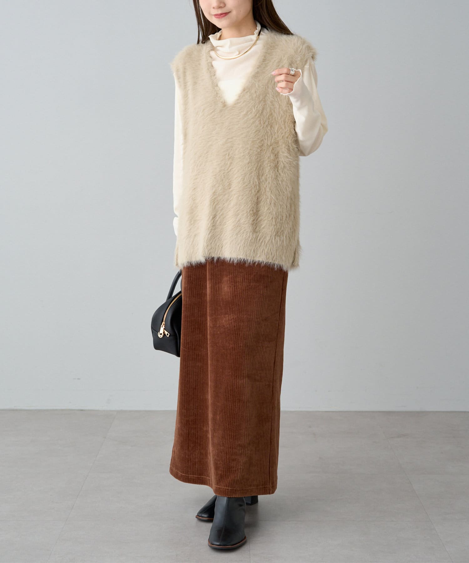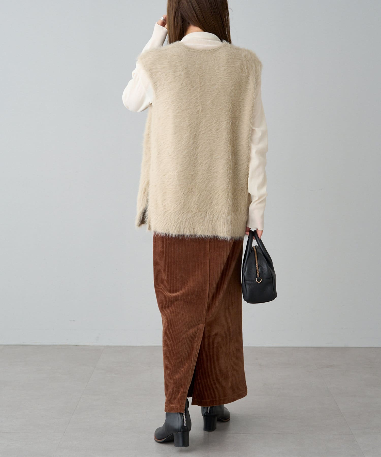 【ふわもこ】シャギーニットチュニック丈Vネックベスト