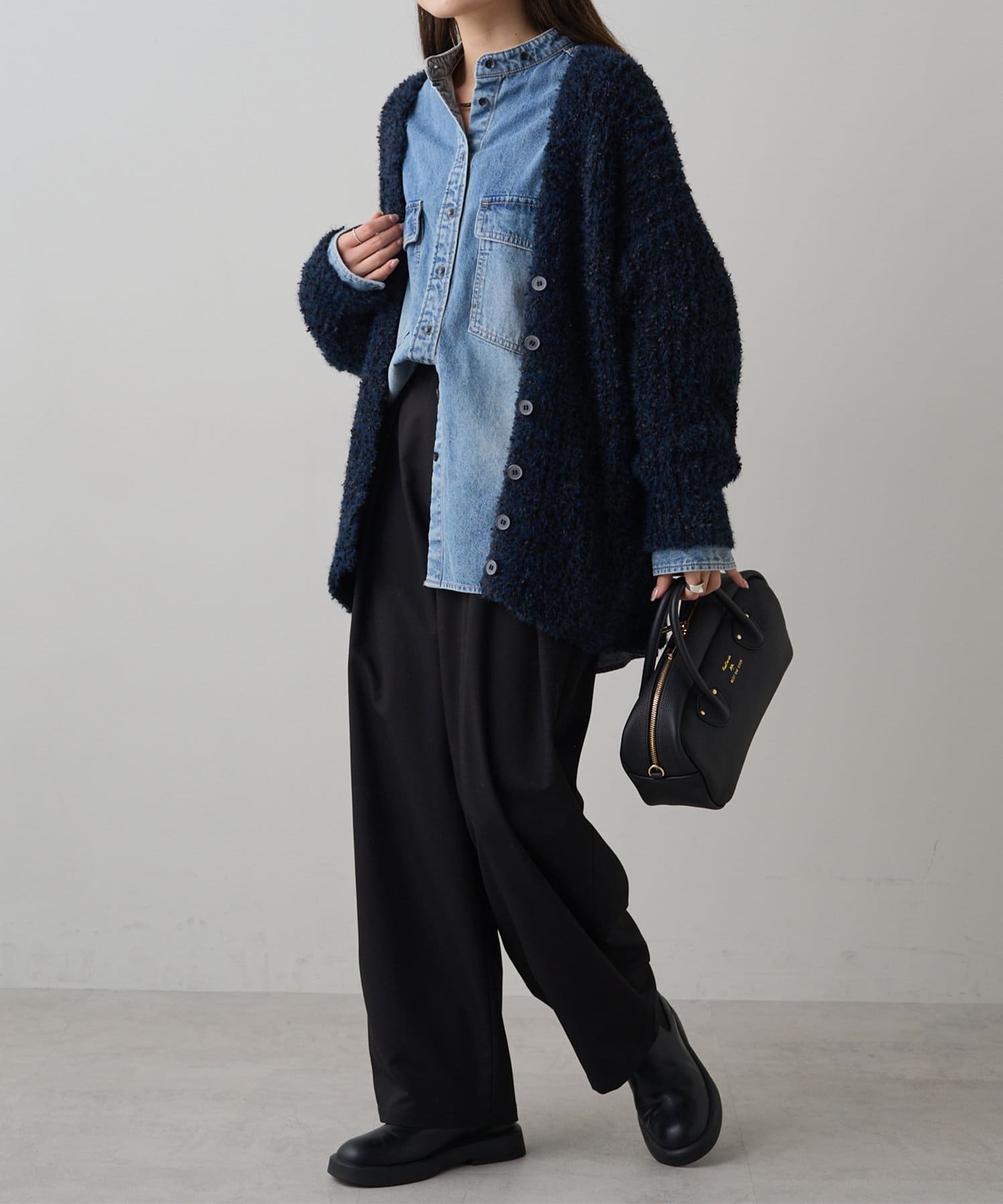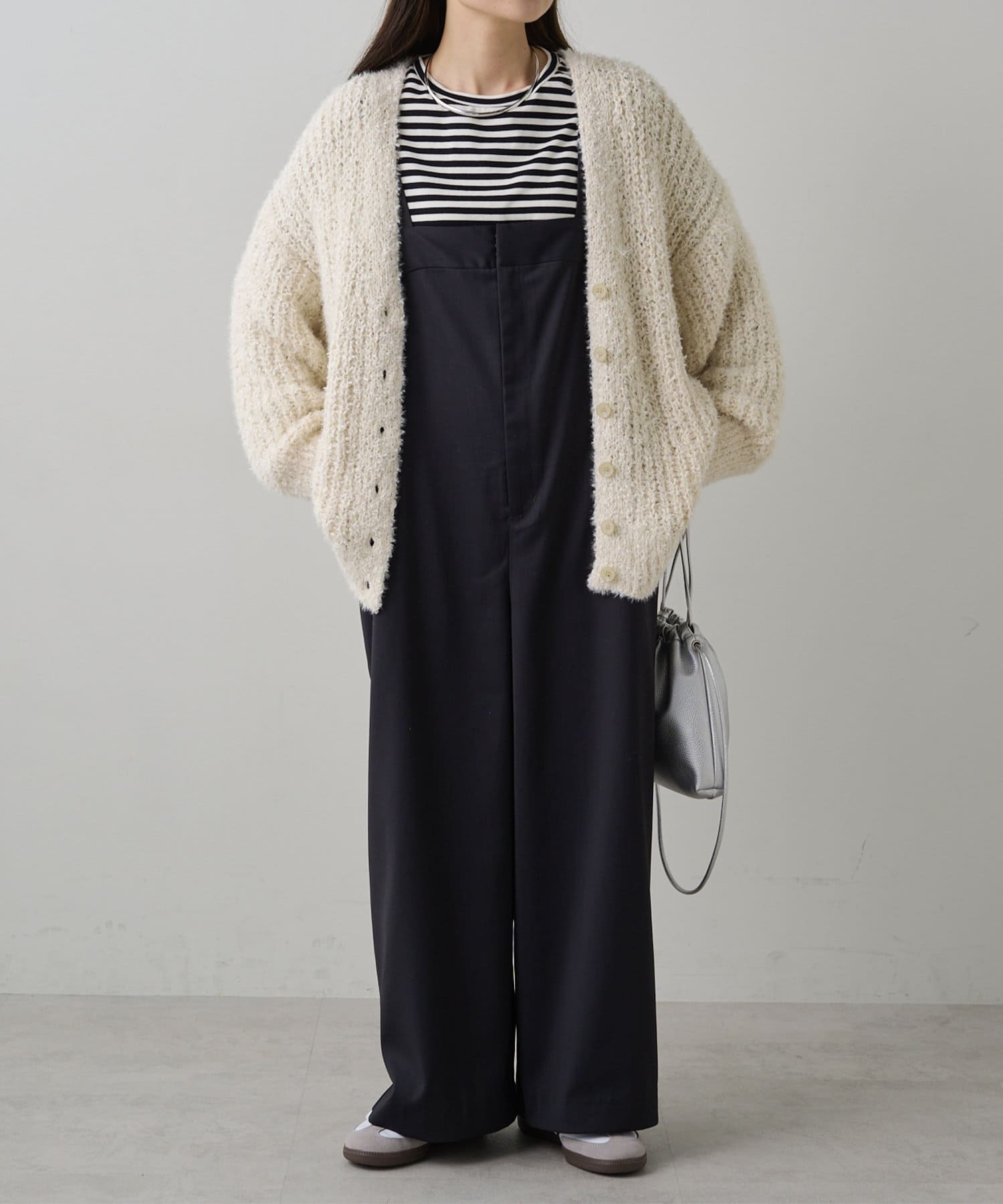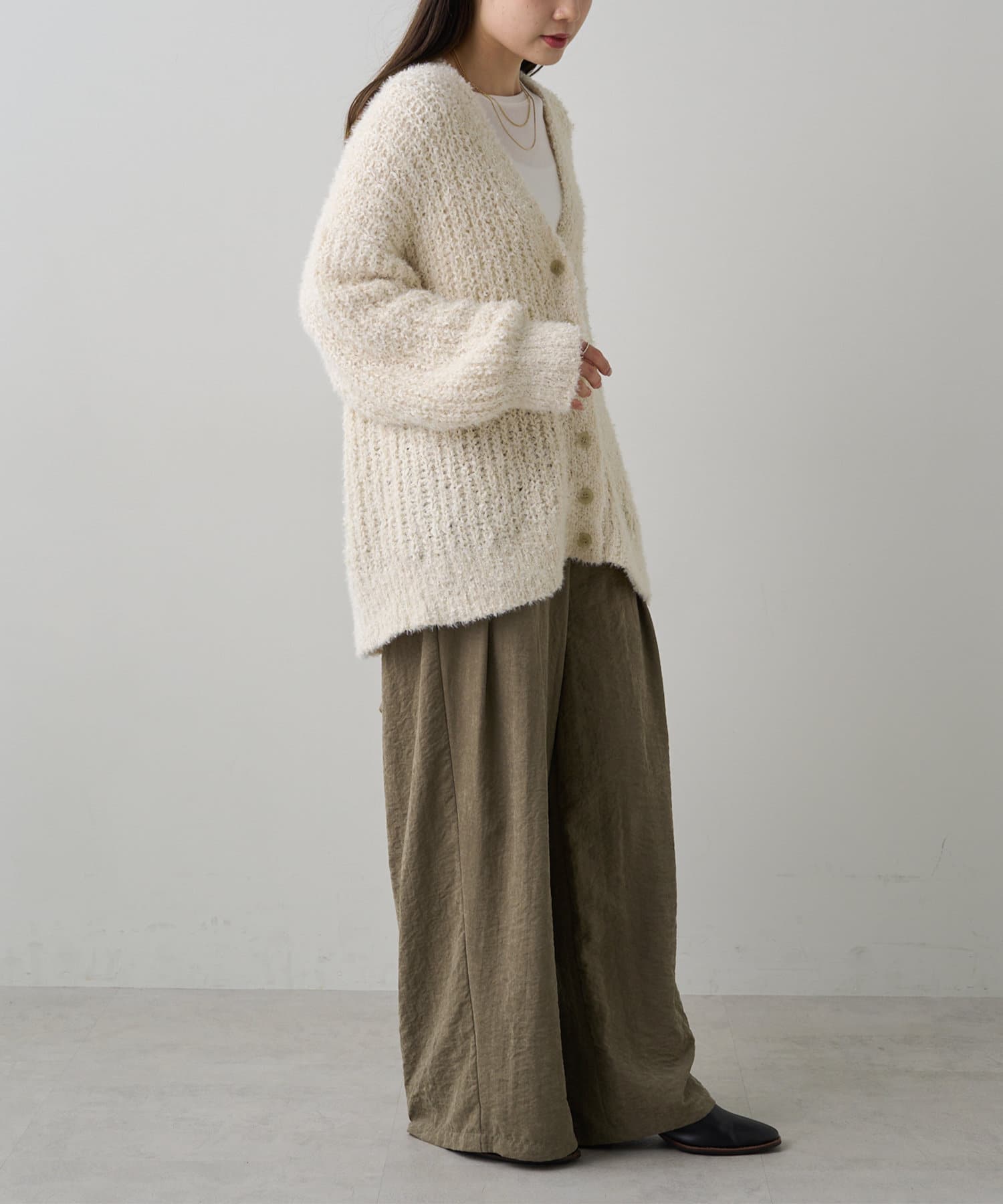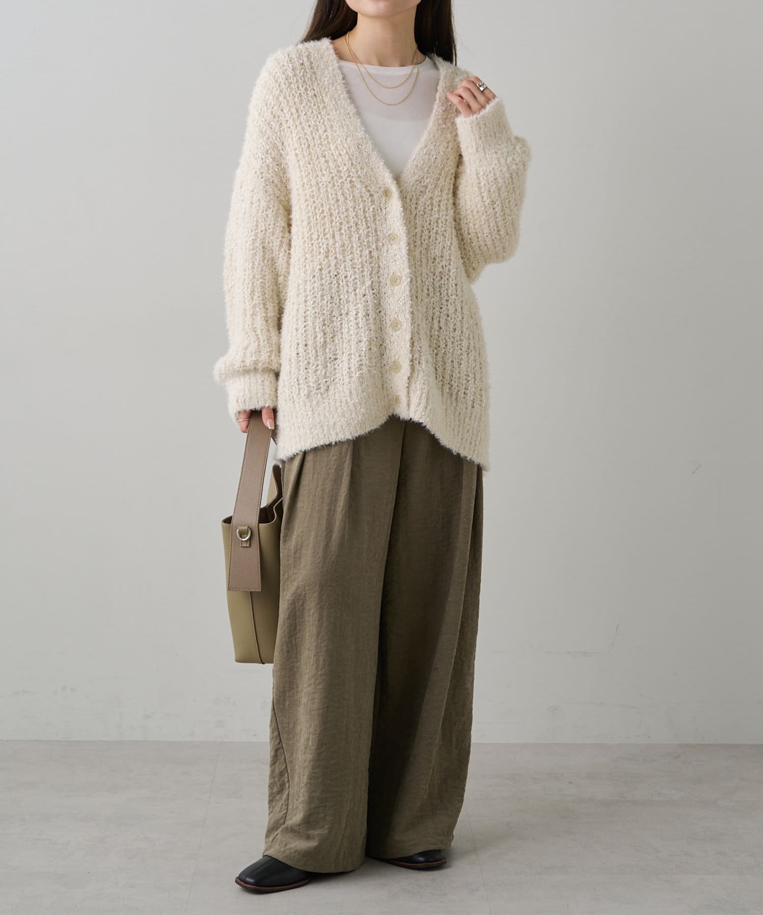 きれいめに仕上げてもサマになるツイードライクカーディガン。