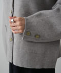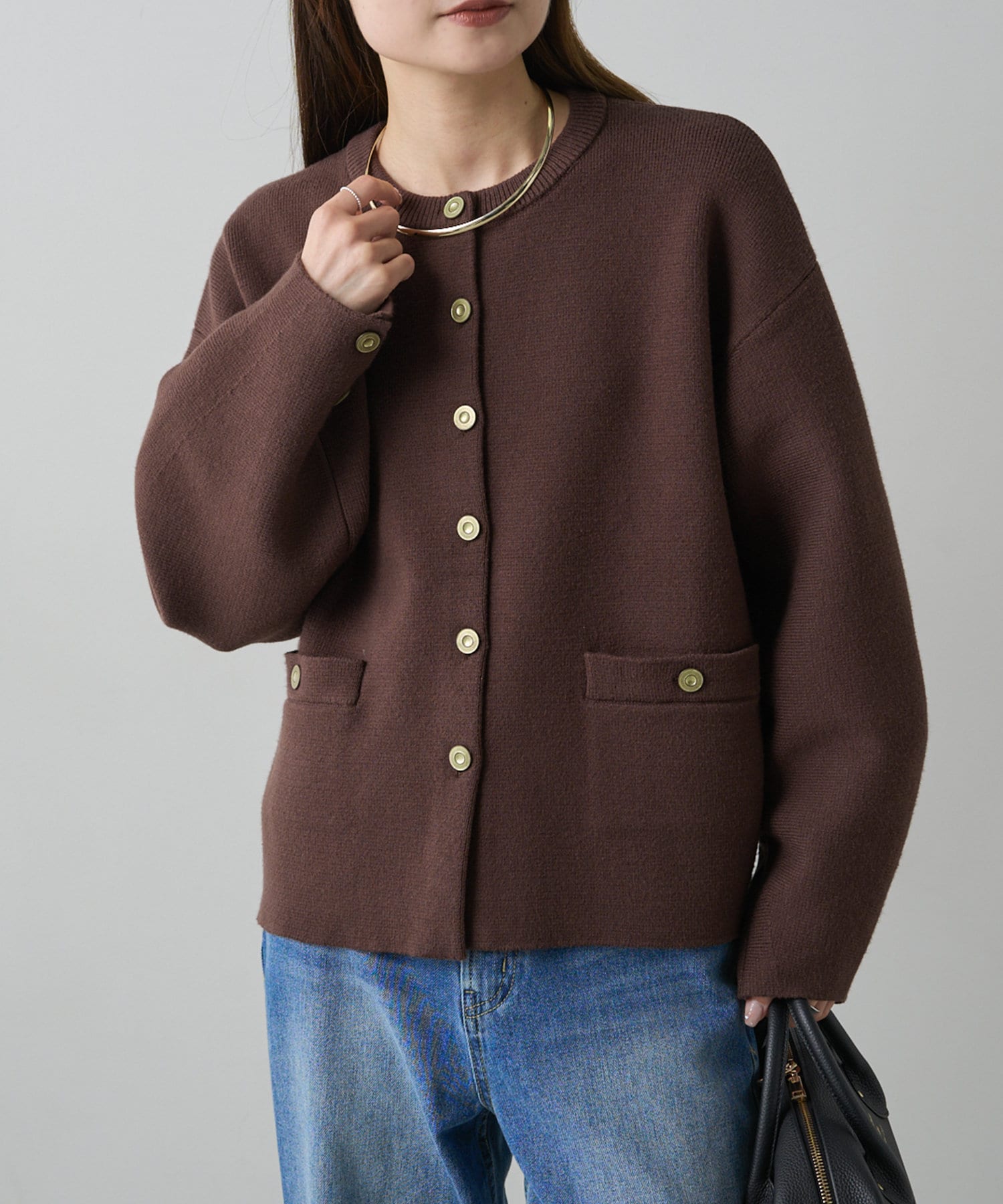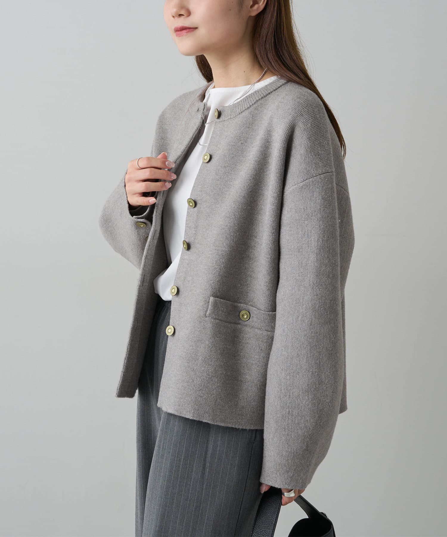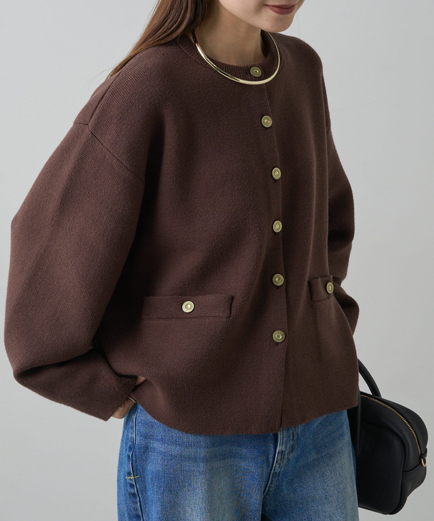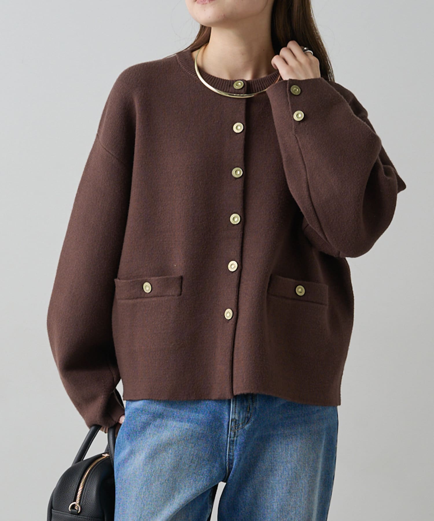 味のあるゴールドのボタンが映えるジャケット風のカーディガン。