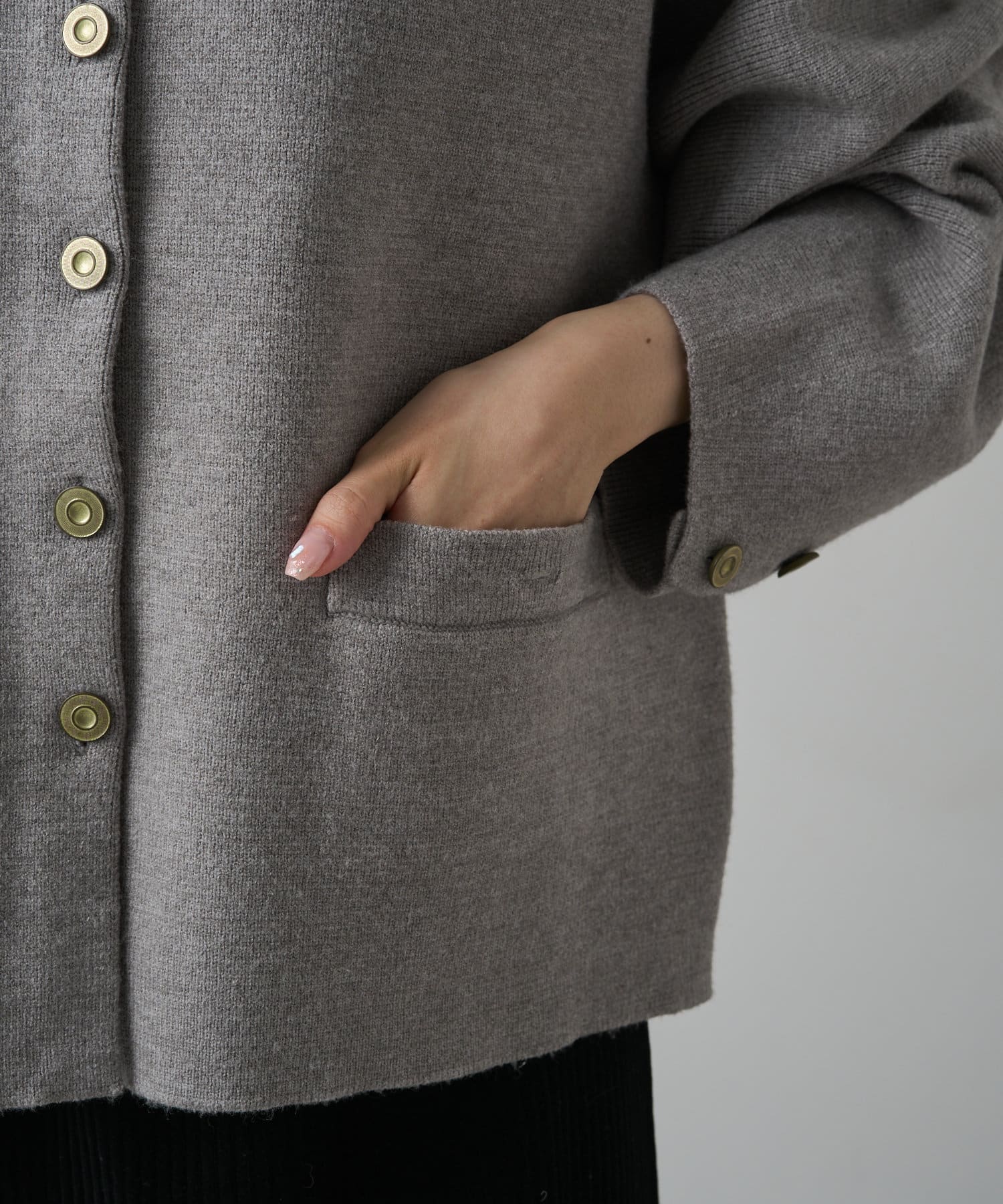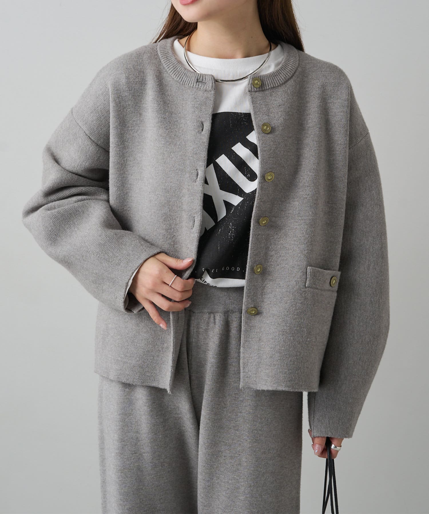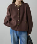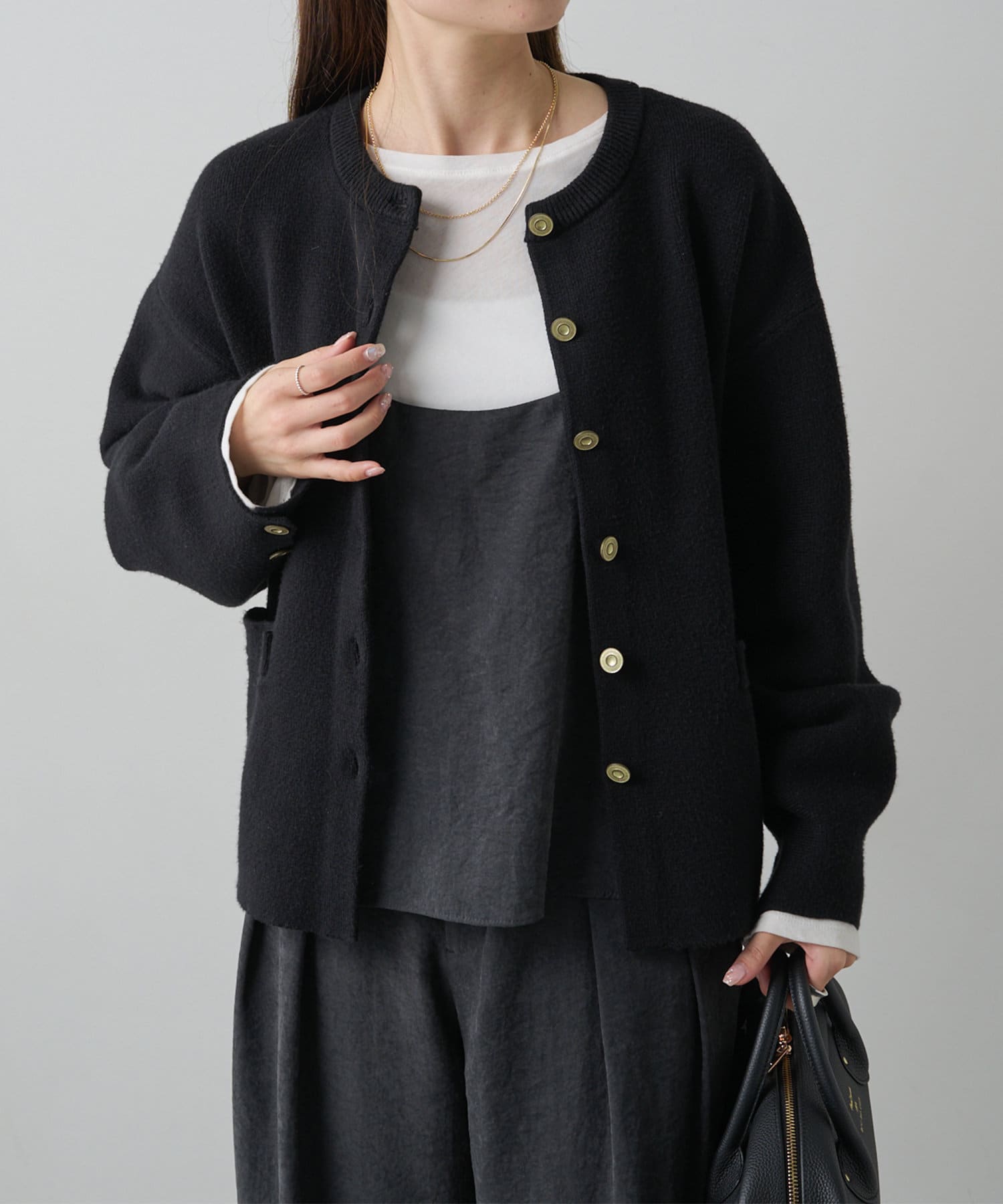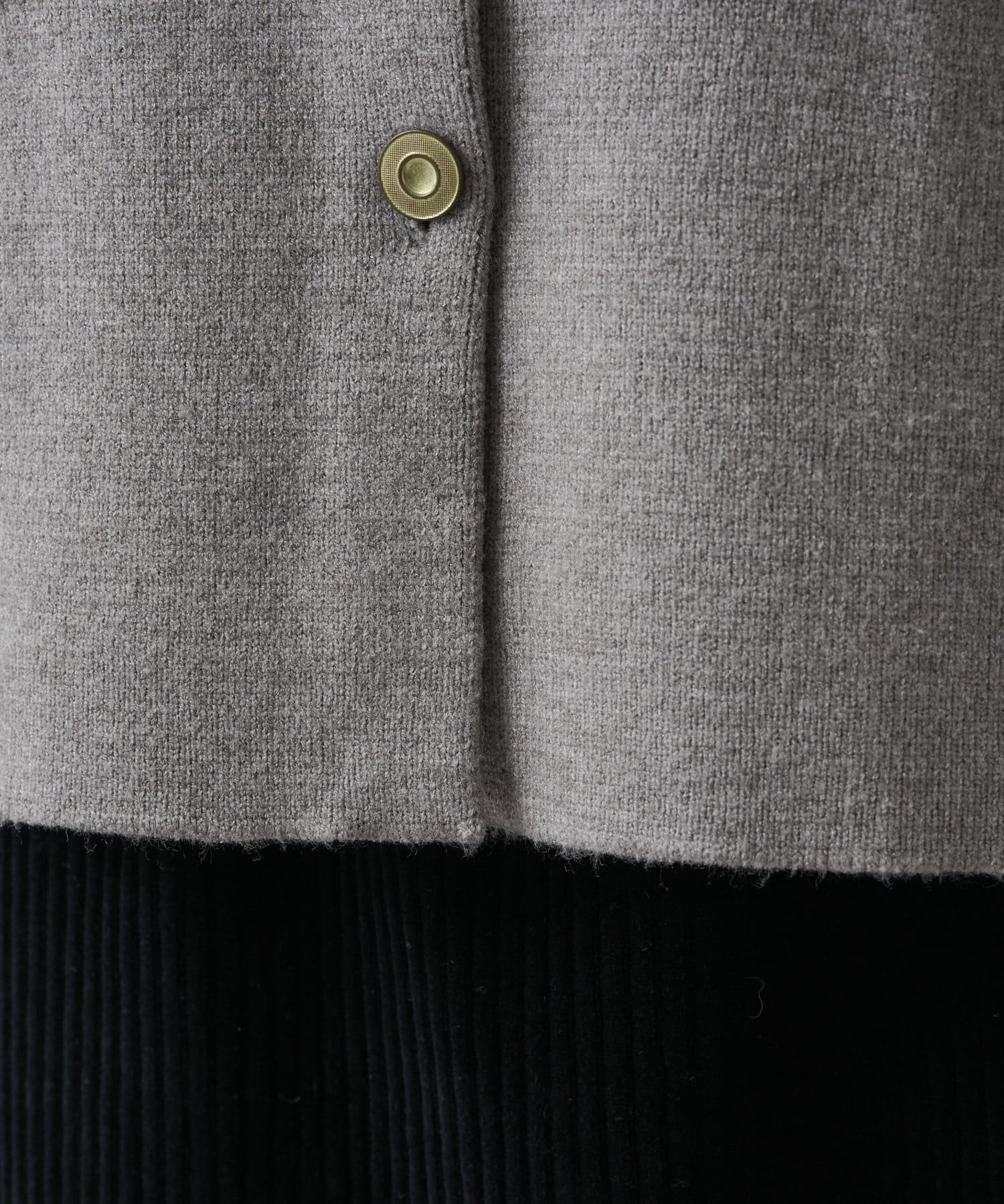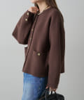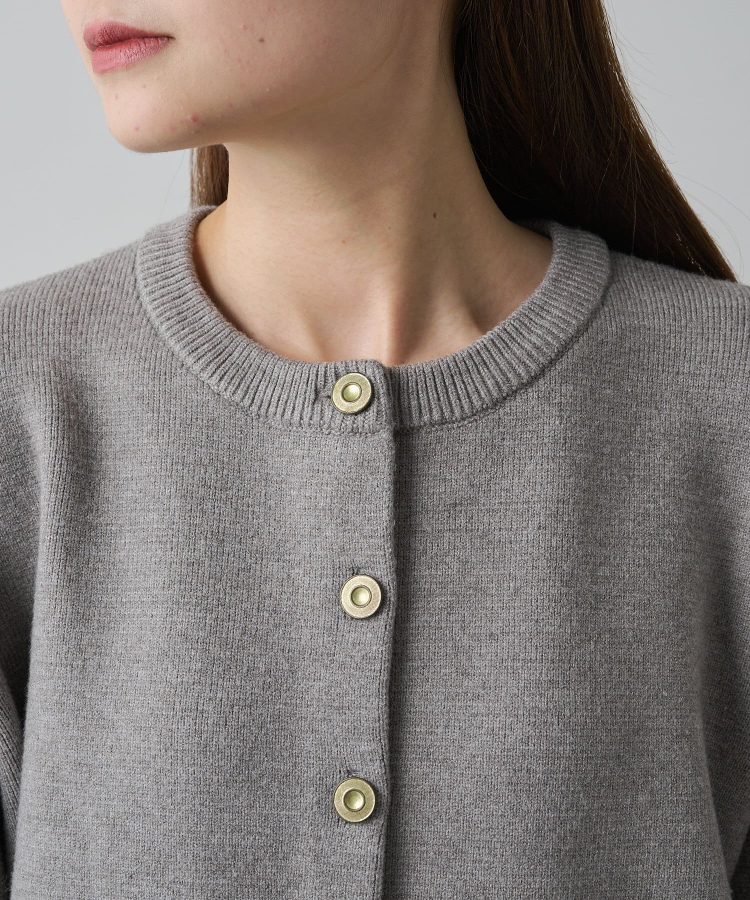 味のあるゴールドのボタンが映えるジャケット風のカーディガン。