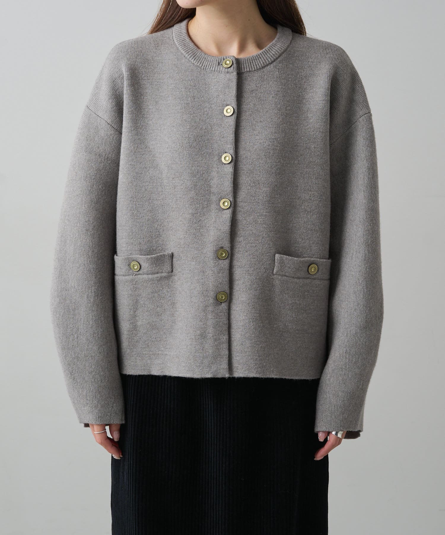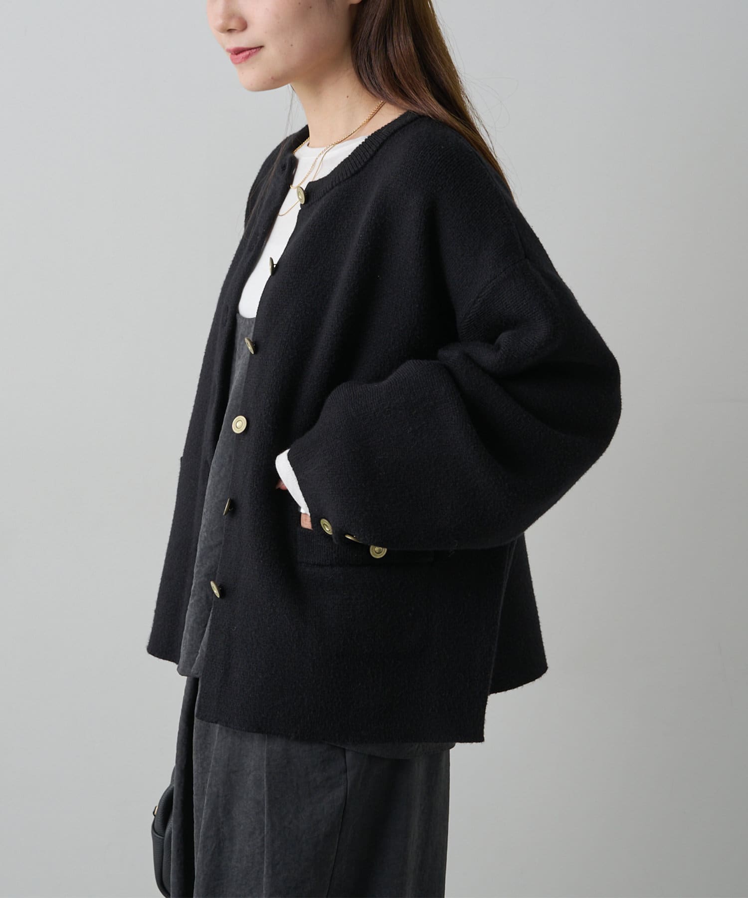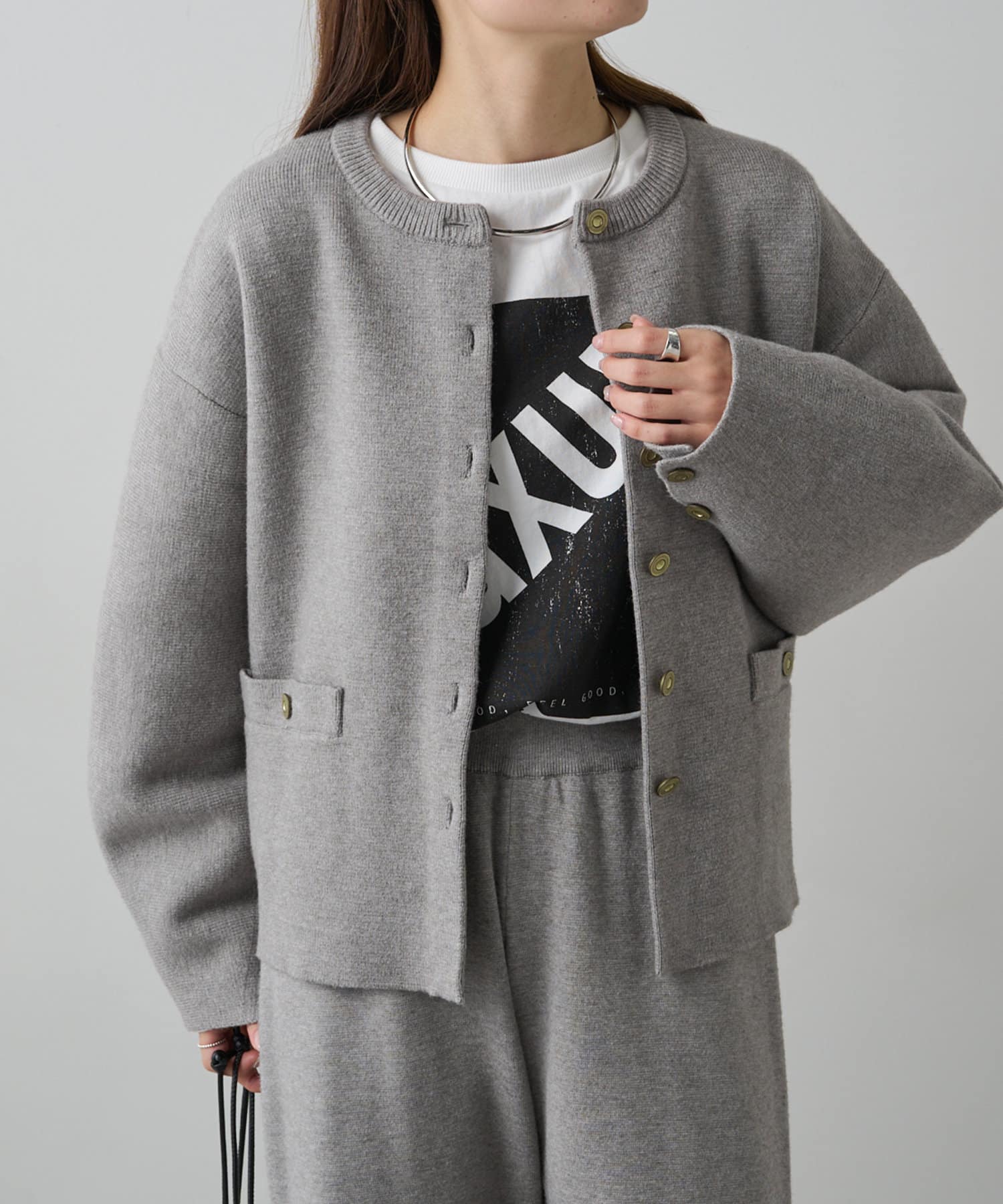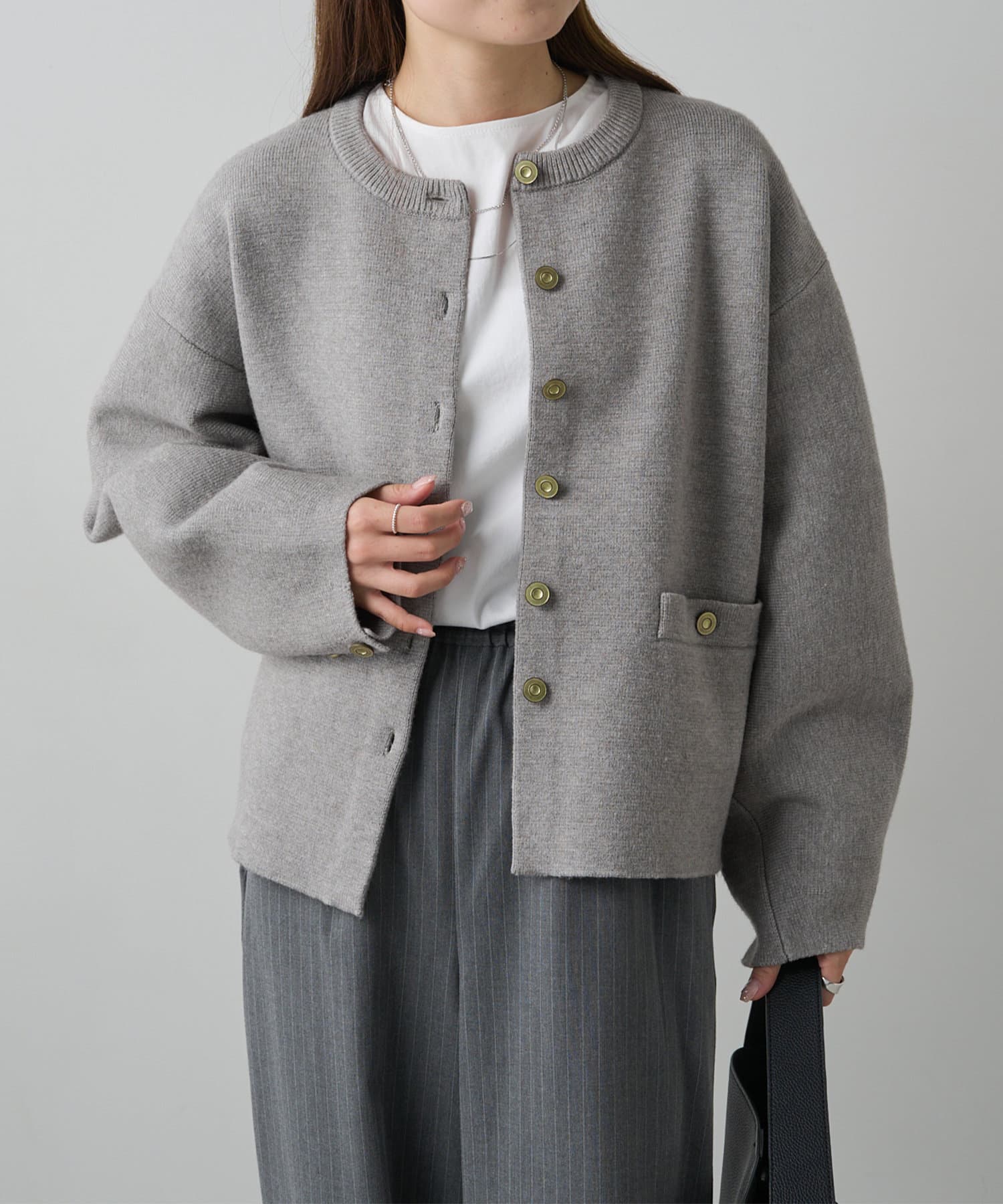 味のあるゴールドのボタンが映えるジャケット風のカーディガン。