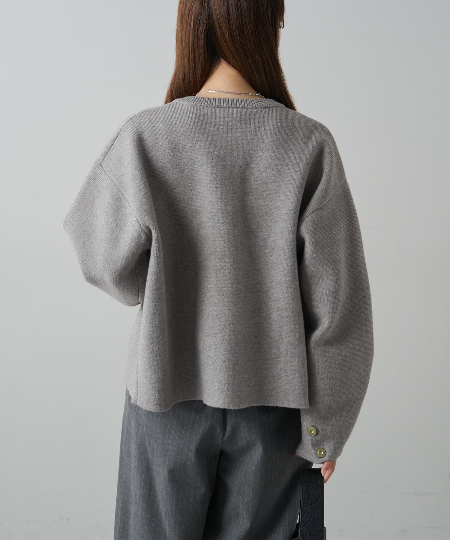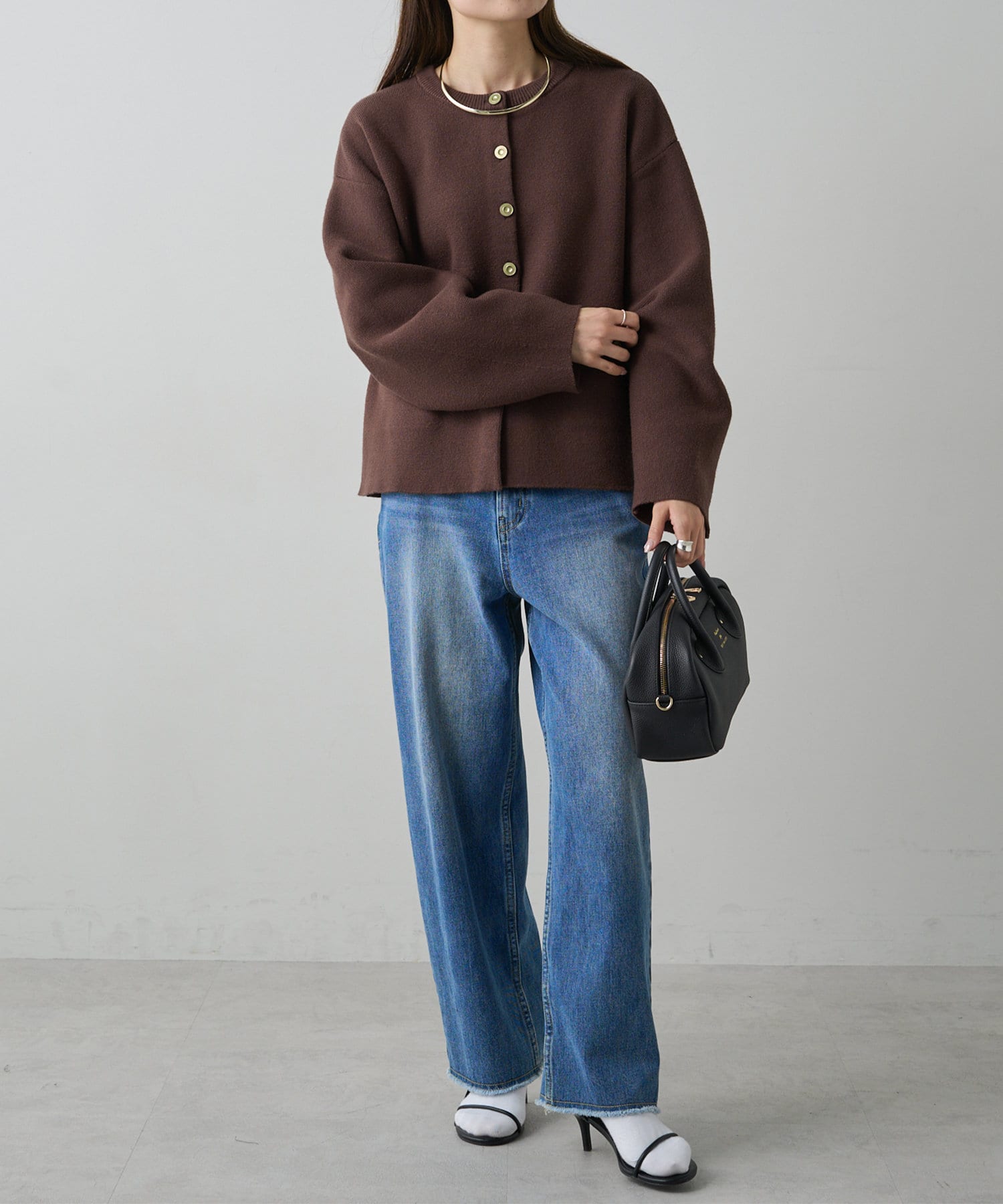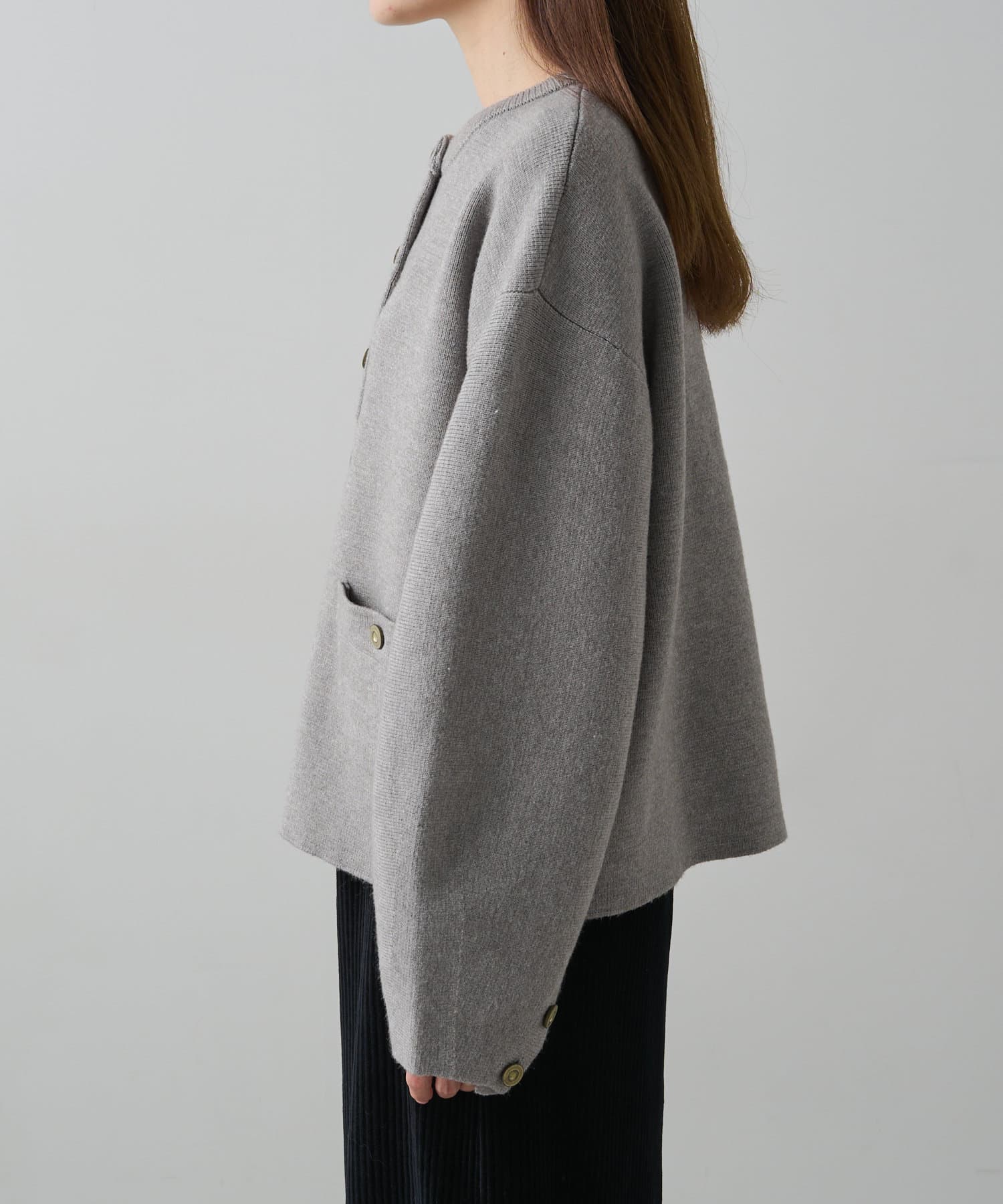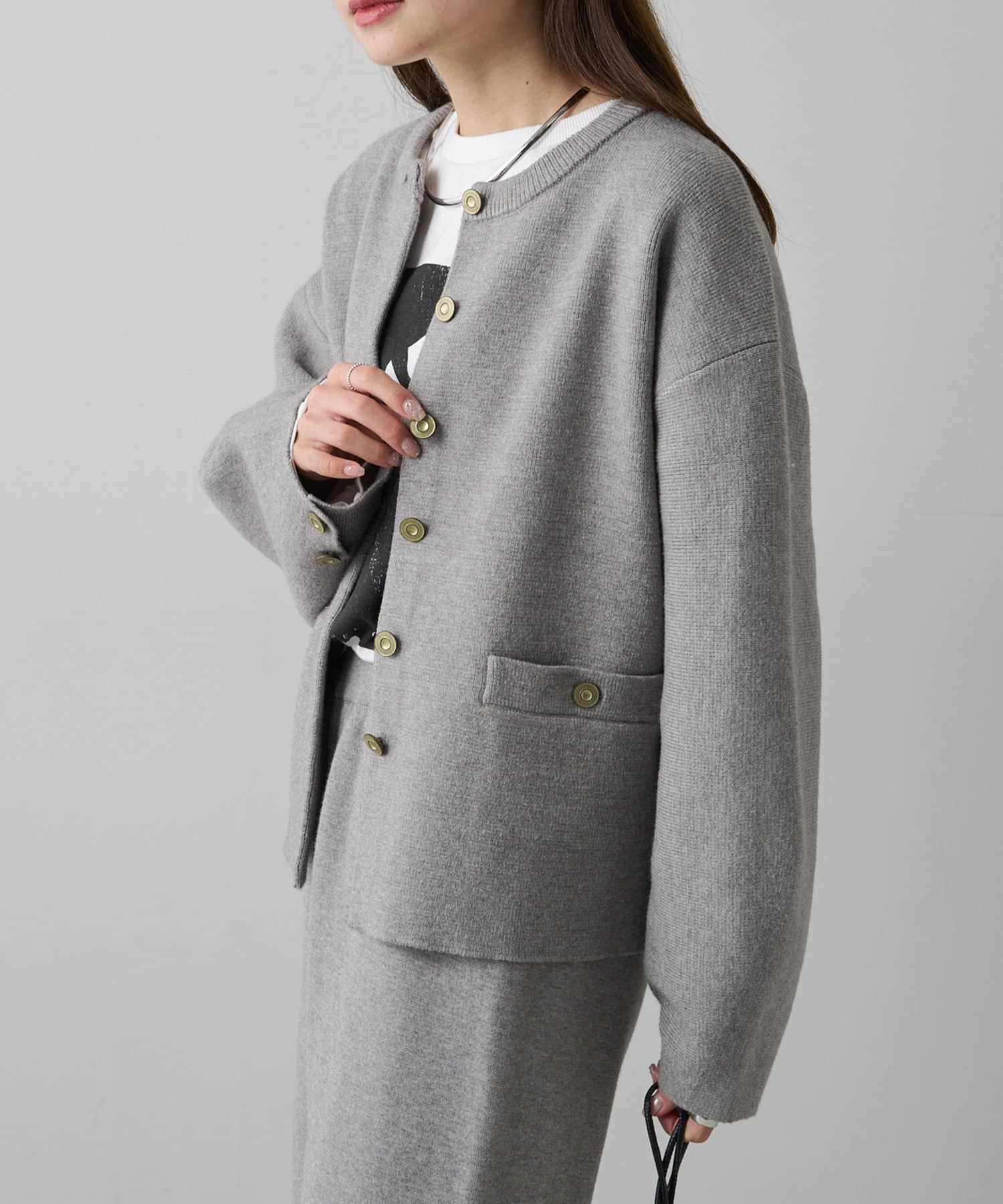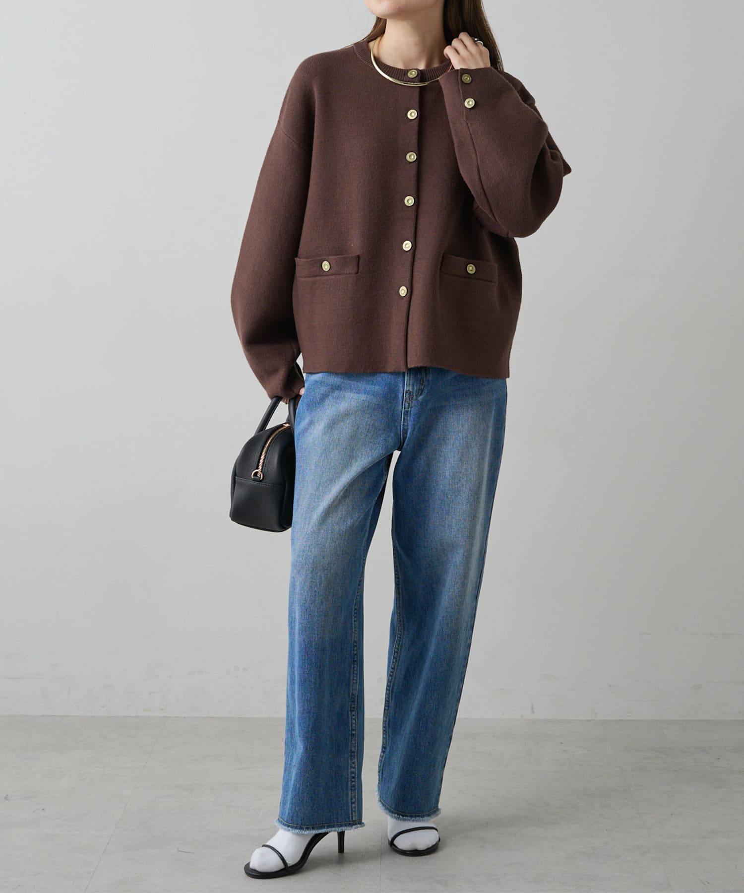 味のあるゴールドのボタンが映えるジャケット風のカーディガン。