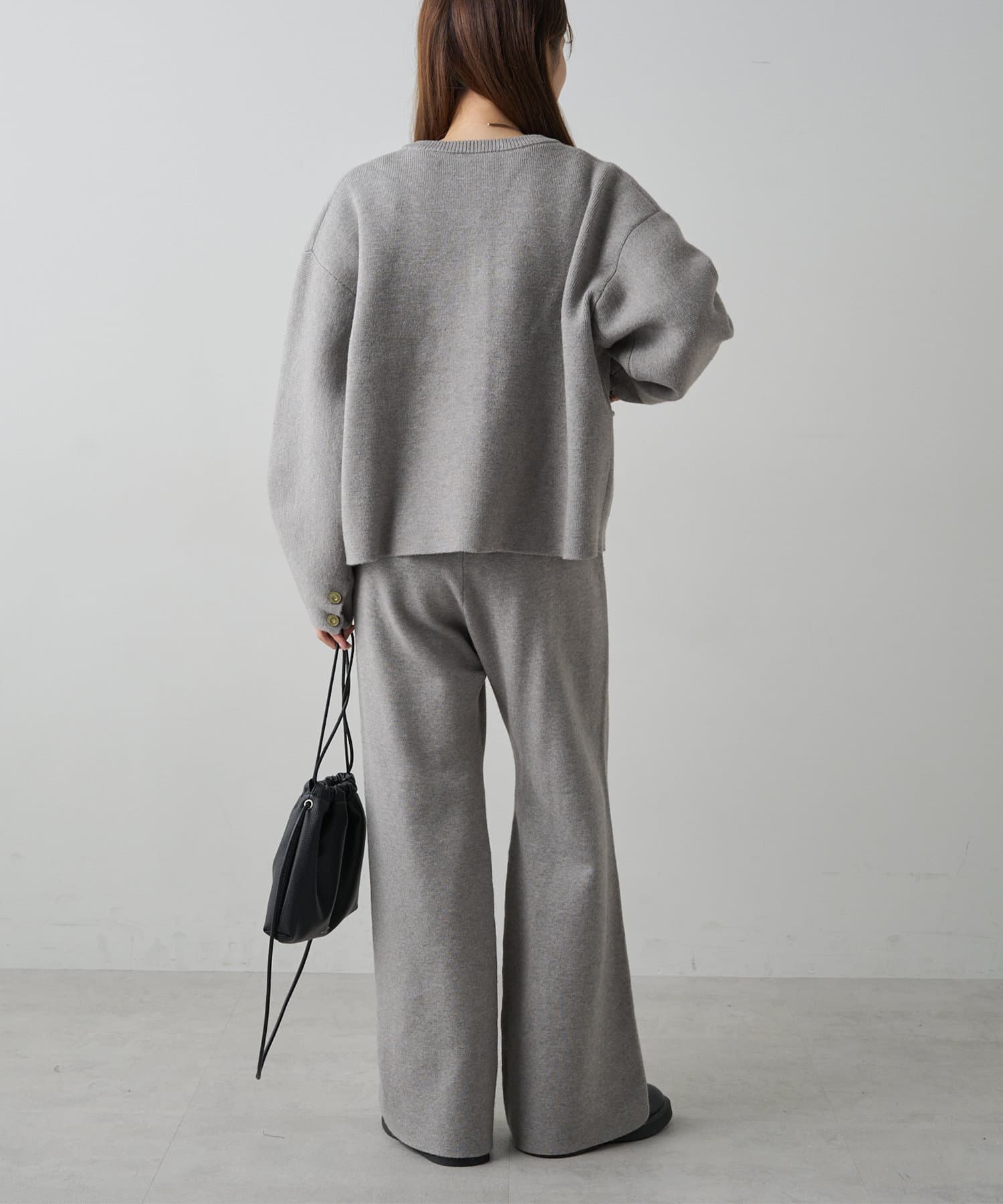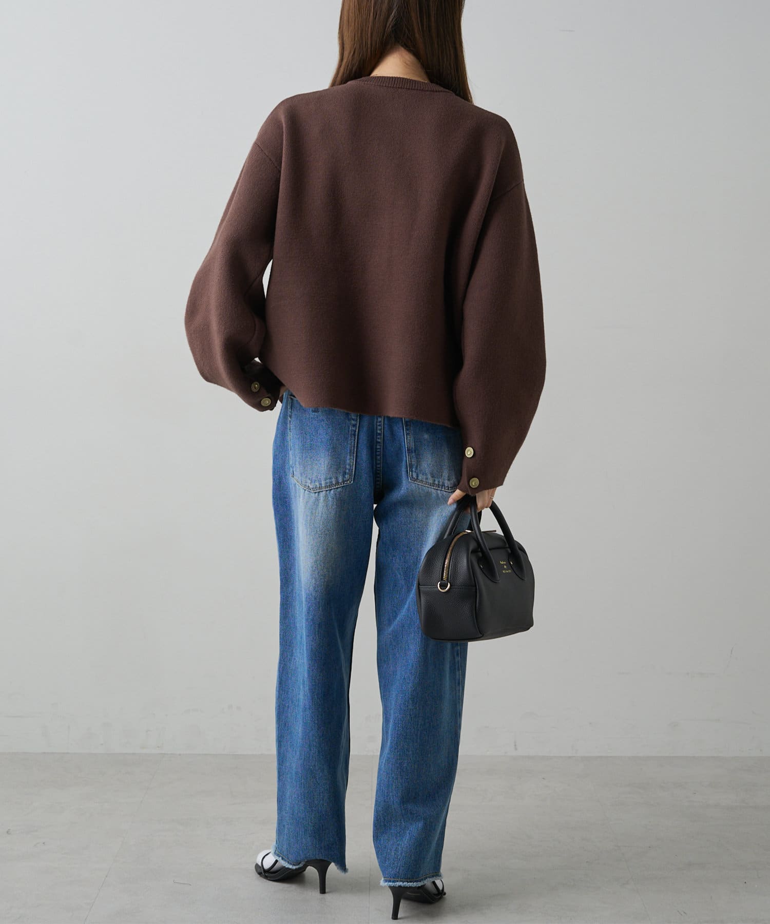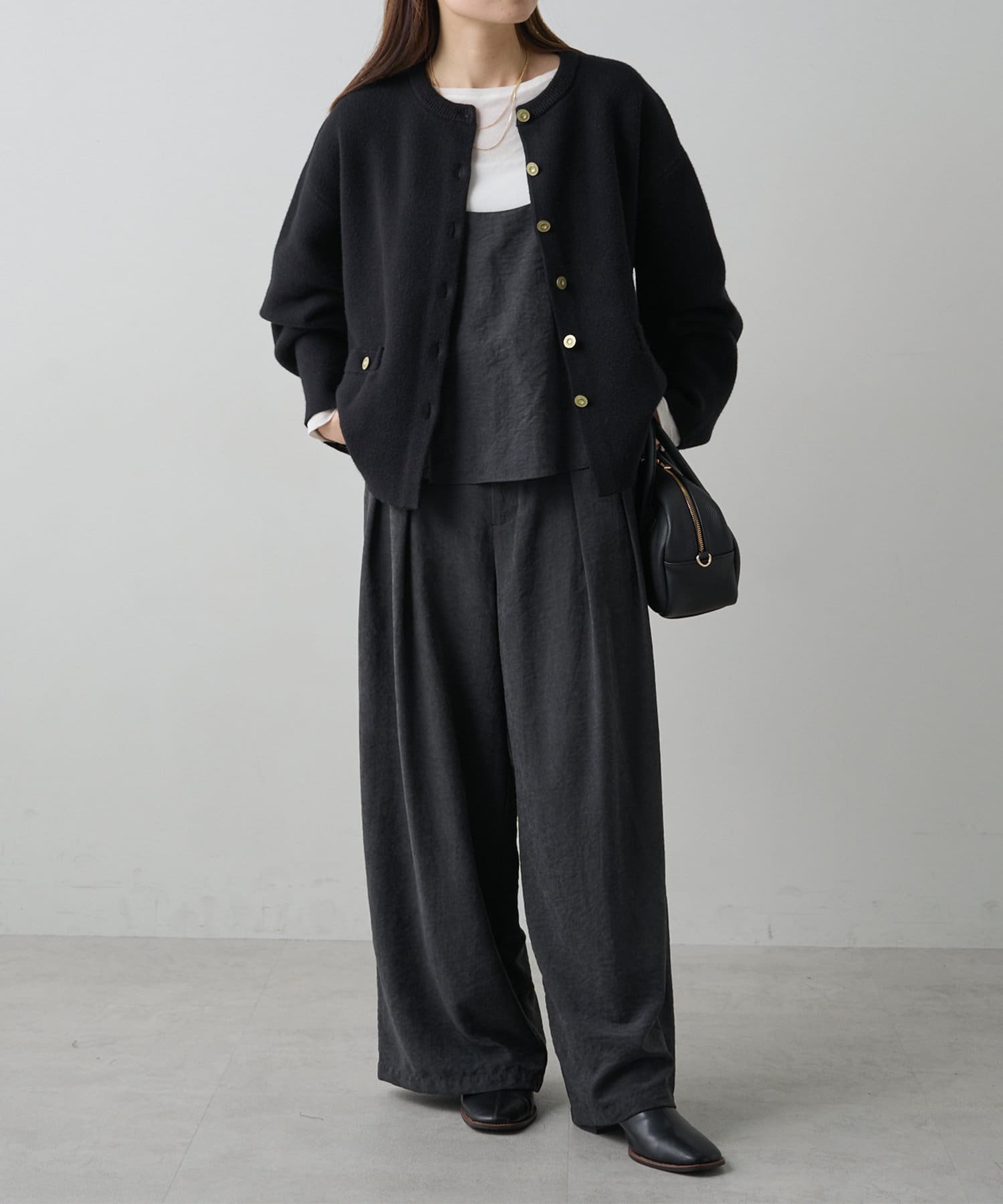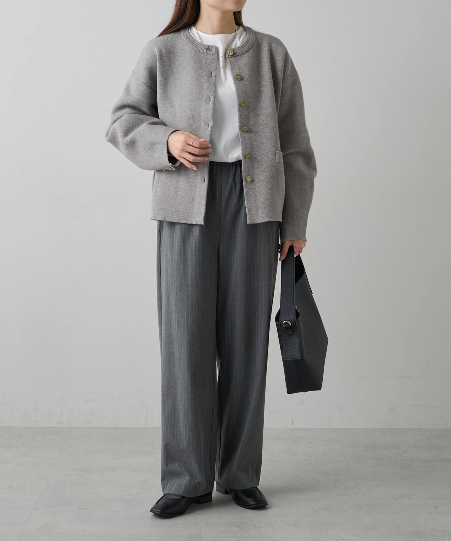 味のあるゴールドのボタンが映えるジャケット風のカーディガン。