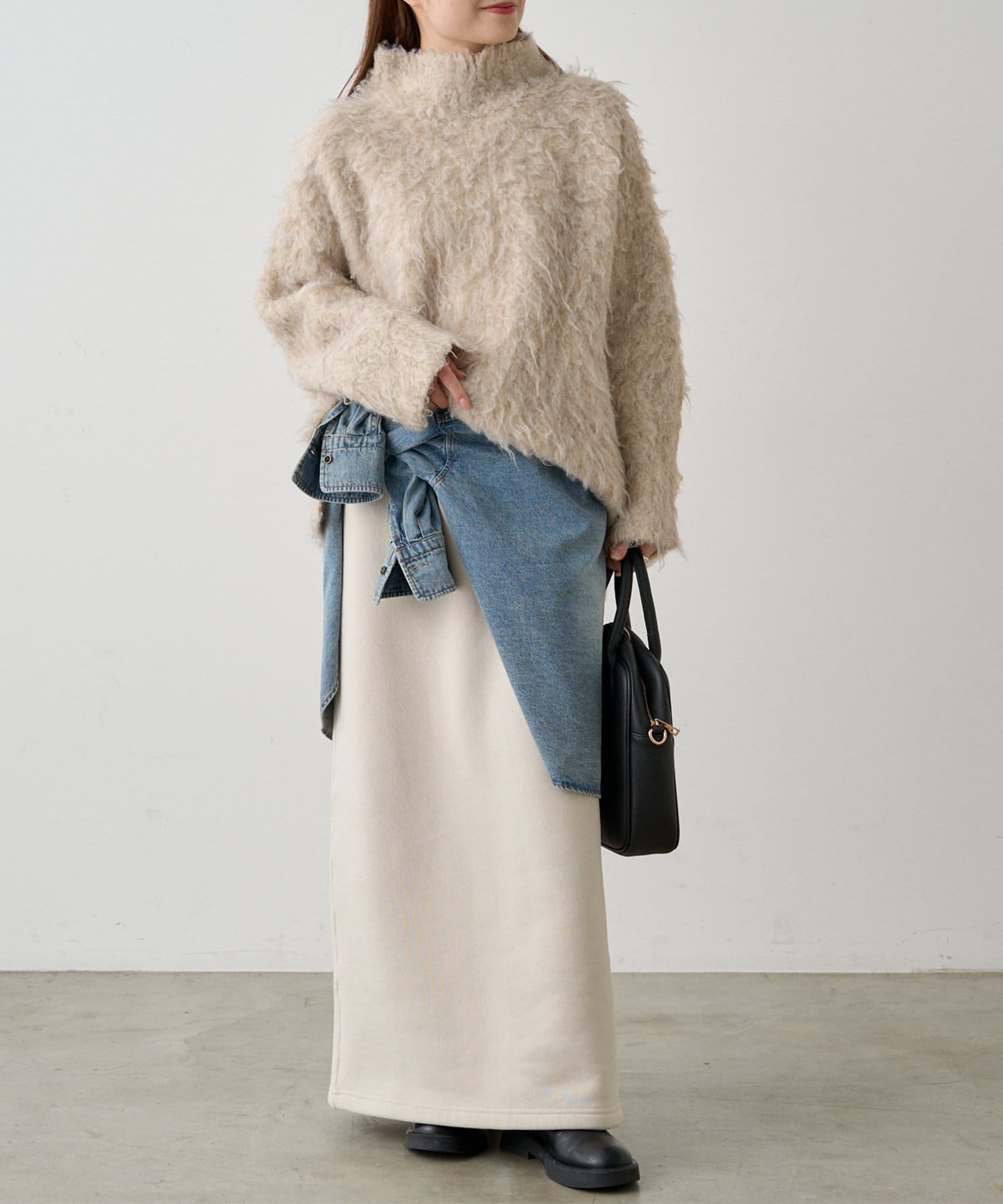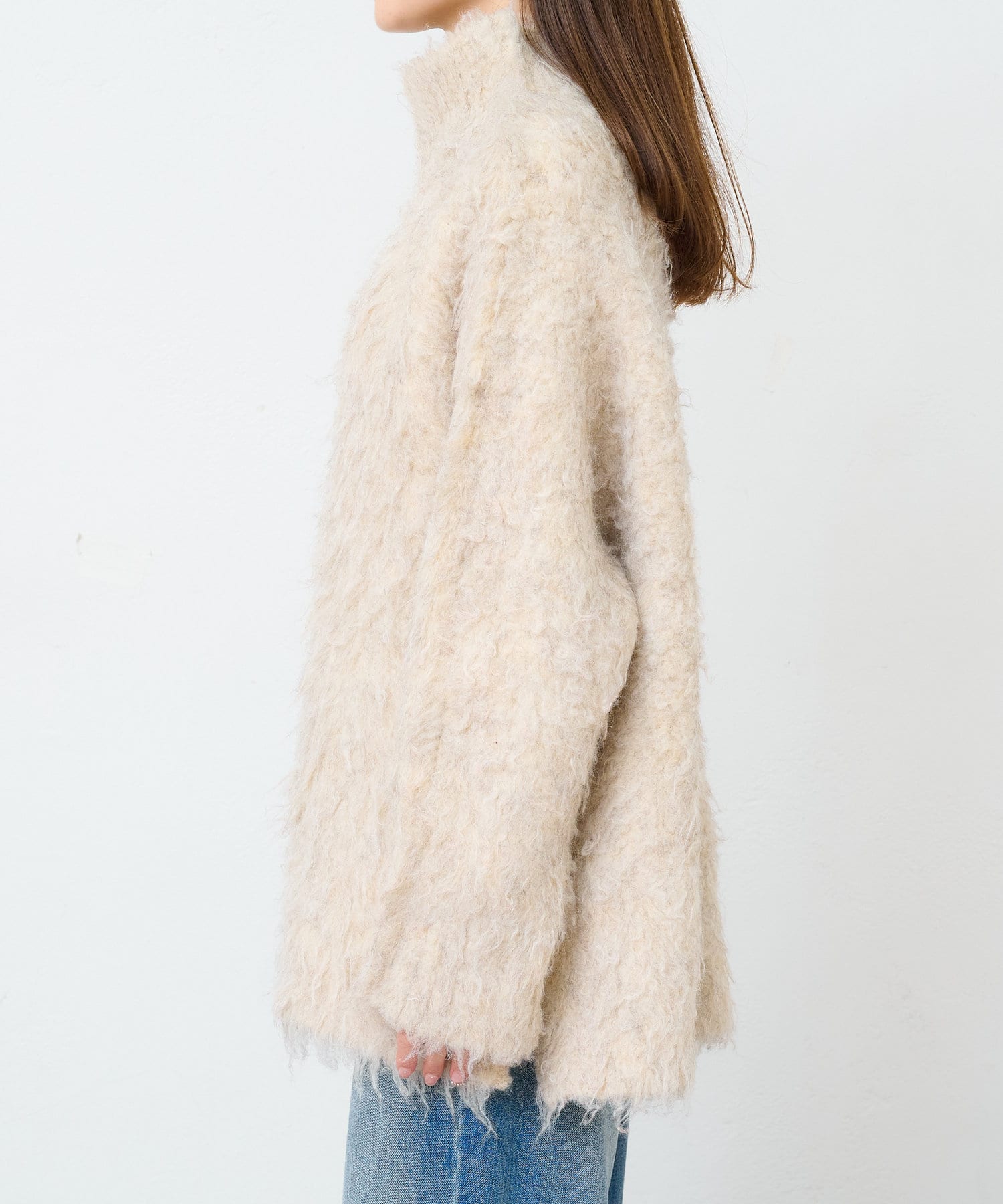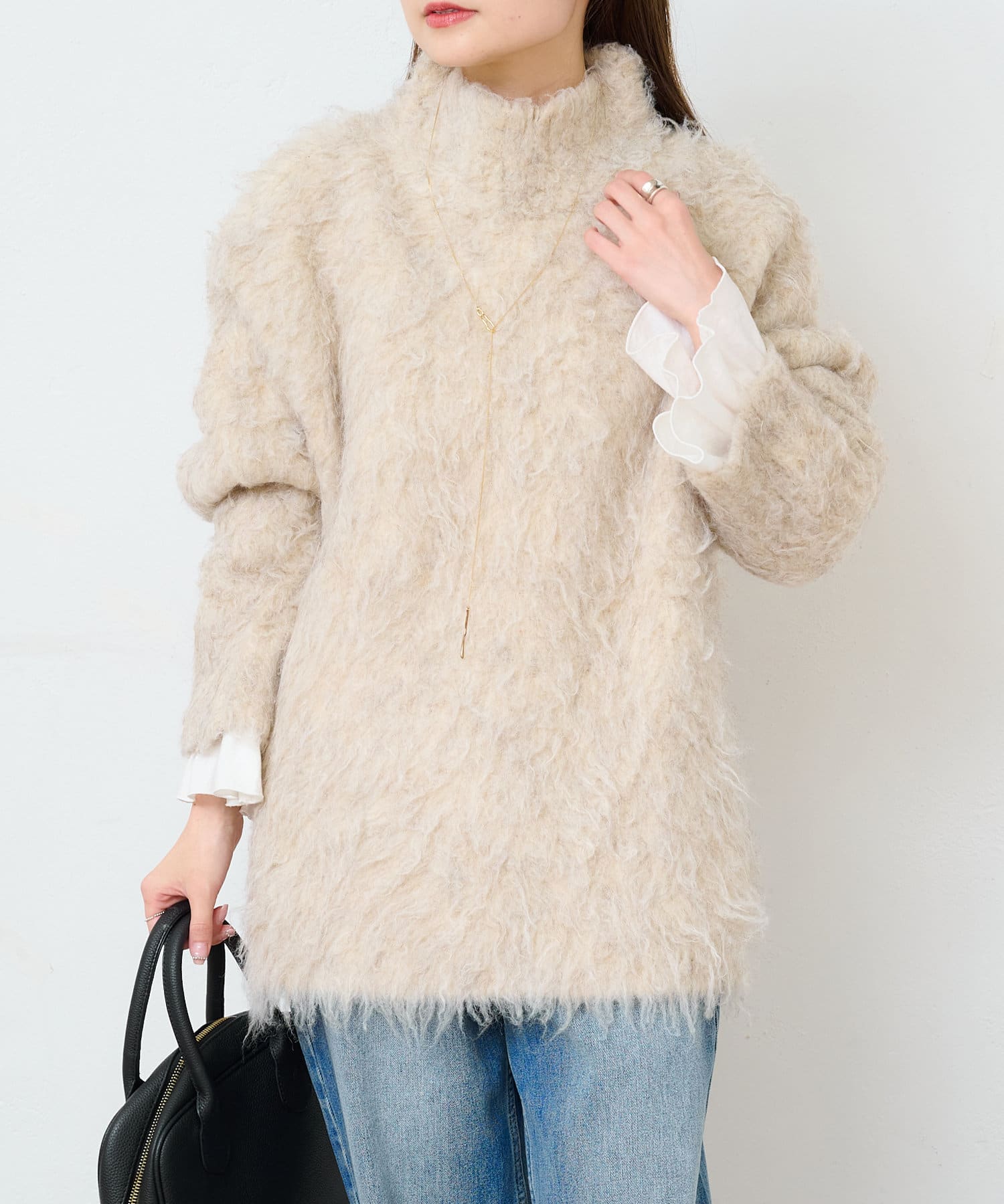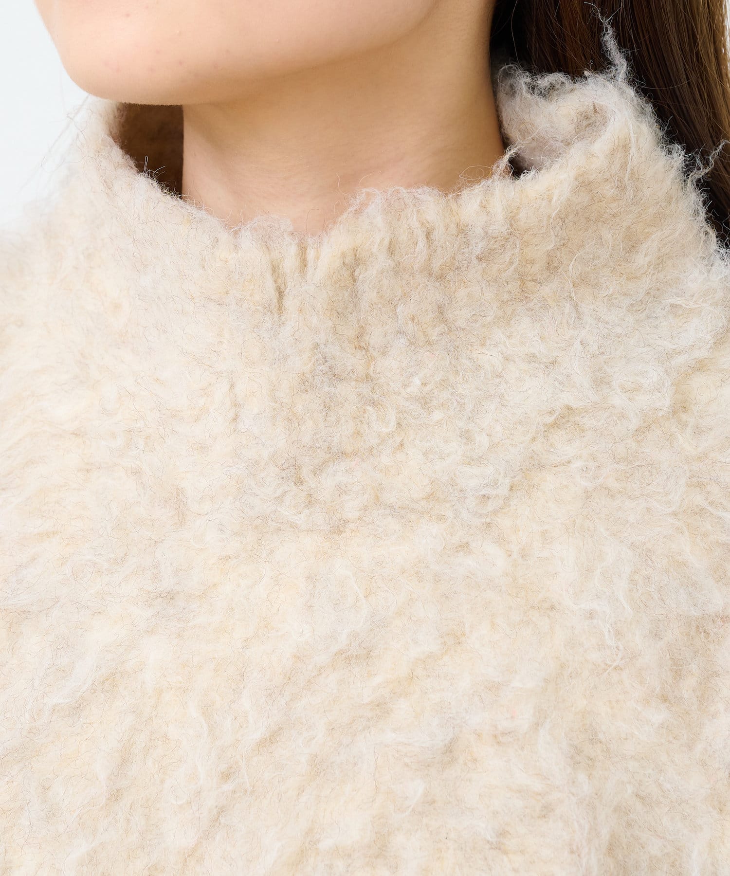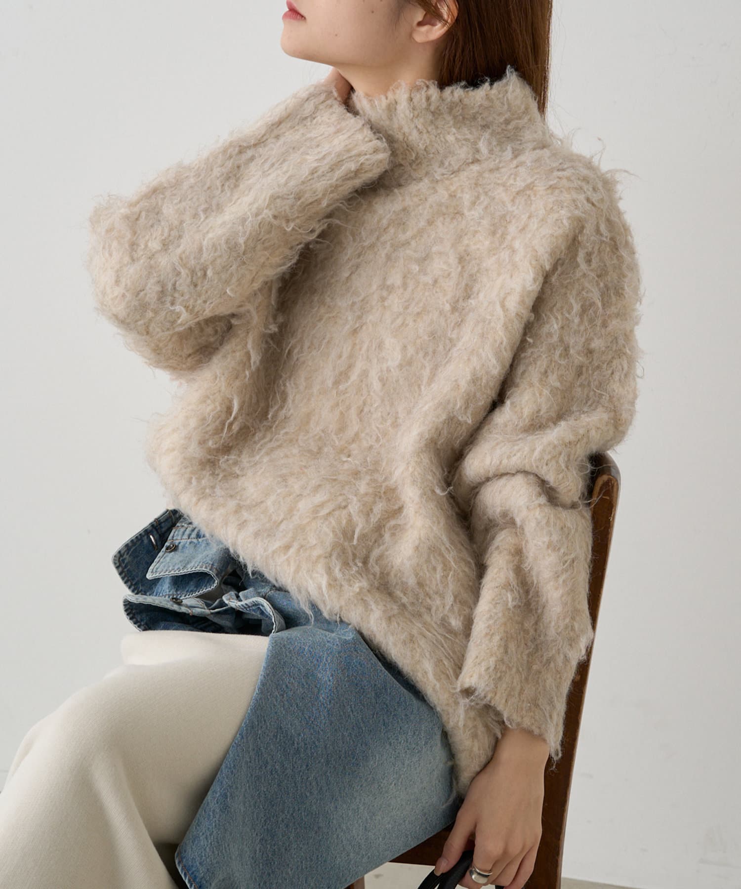 ハイネックデザインとふわふわとした起毛ニット素材で見た目も着心地も暖かな一枚。