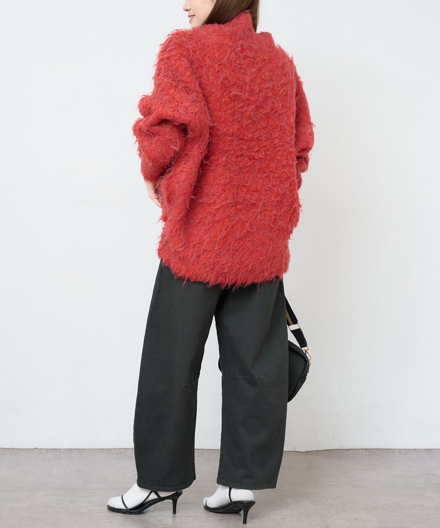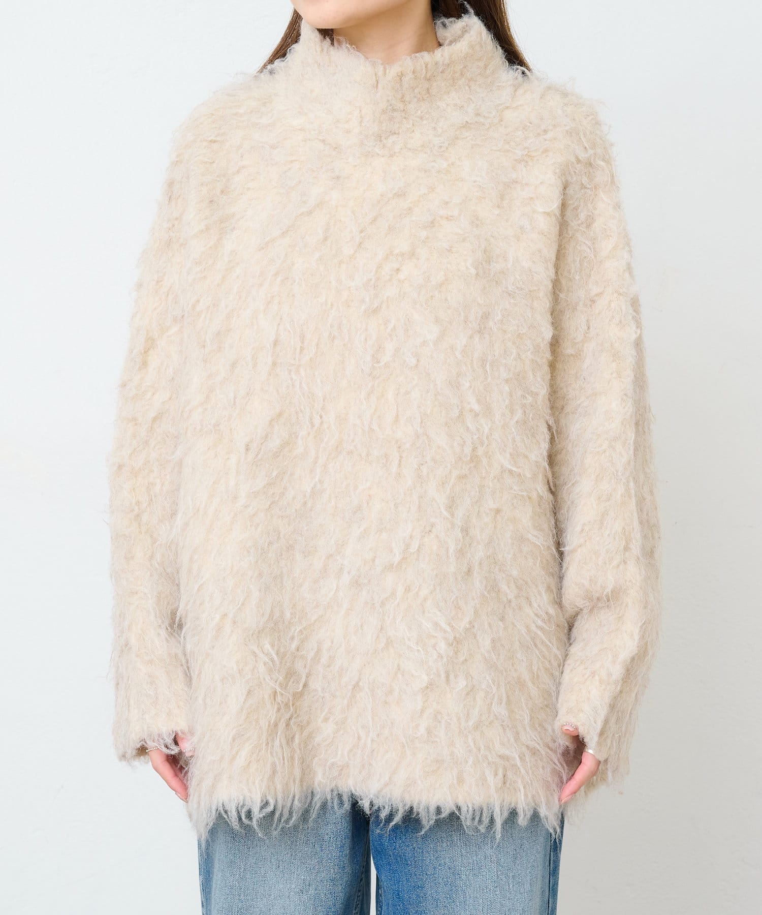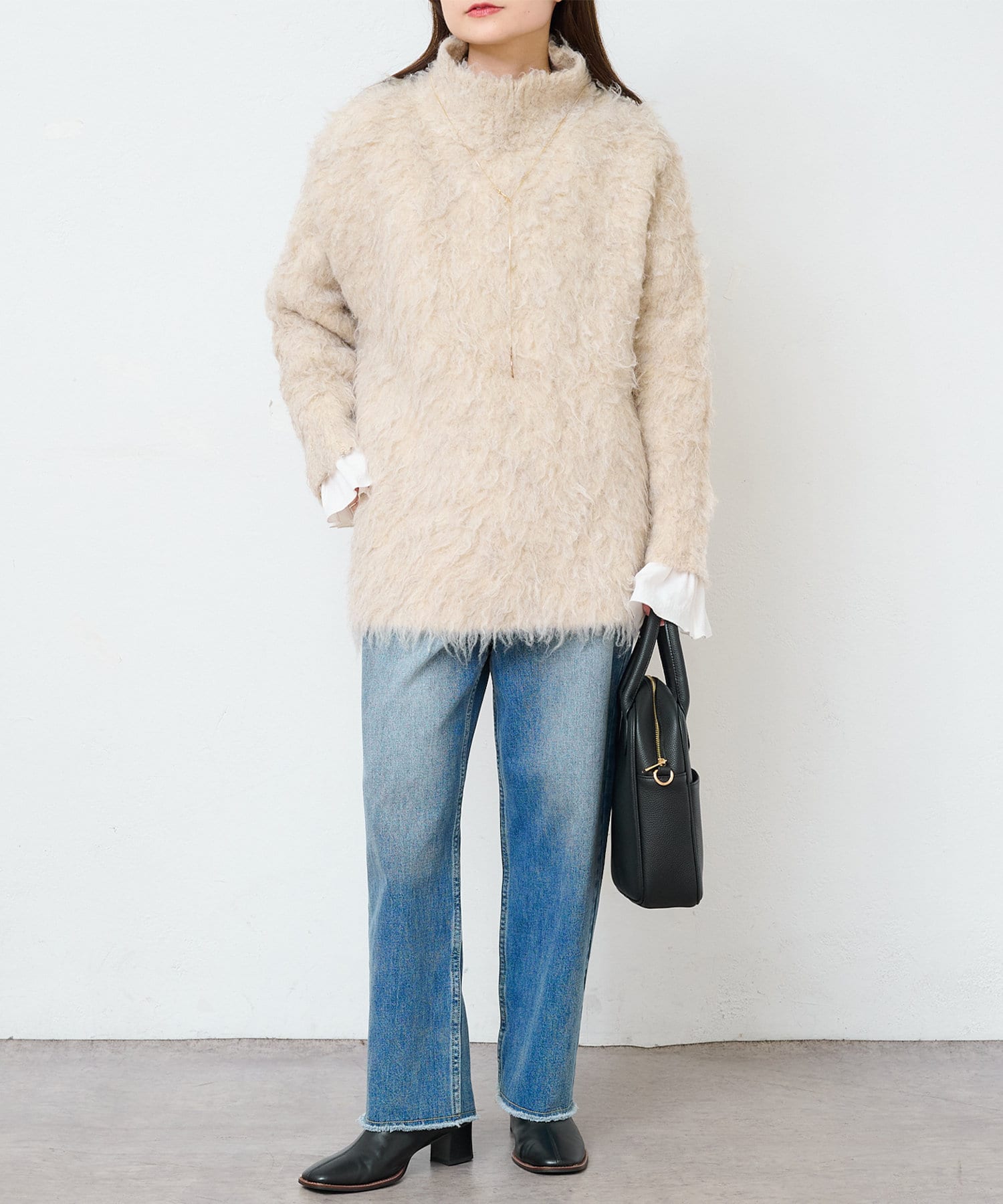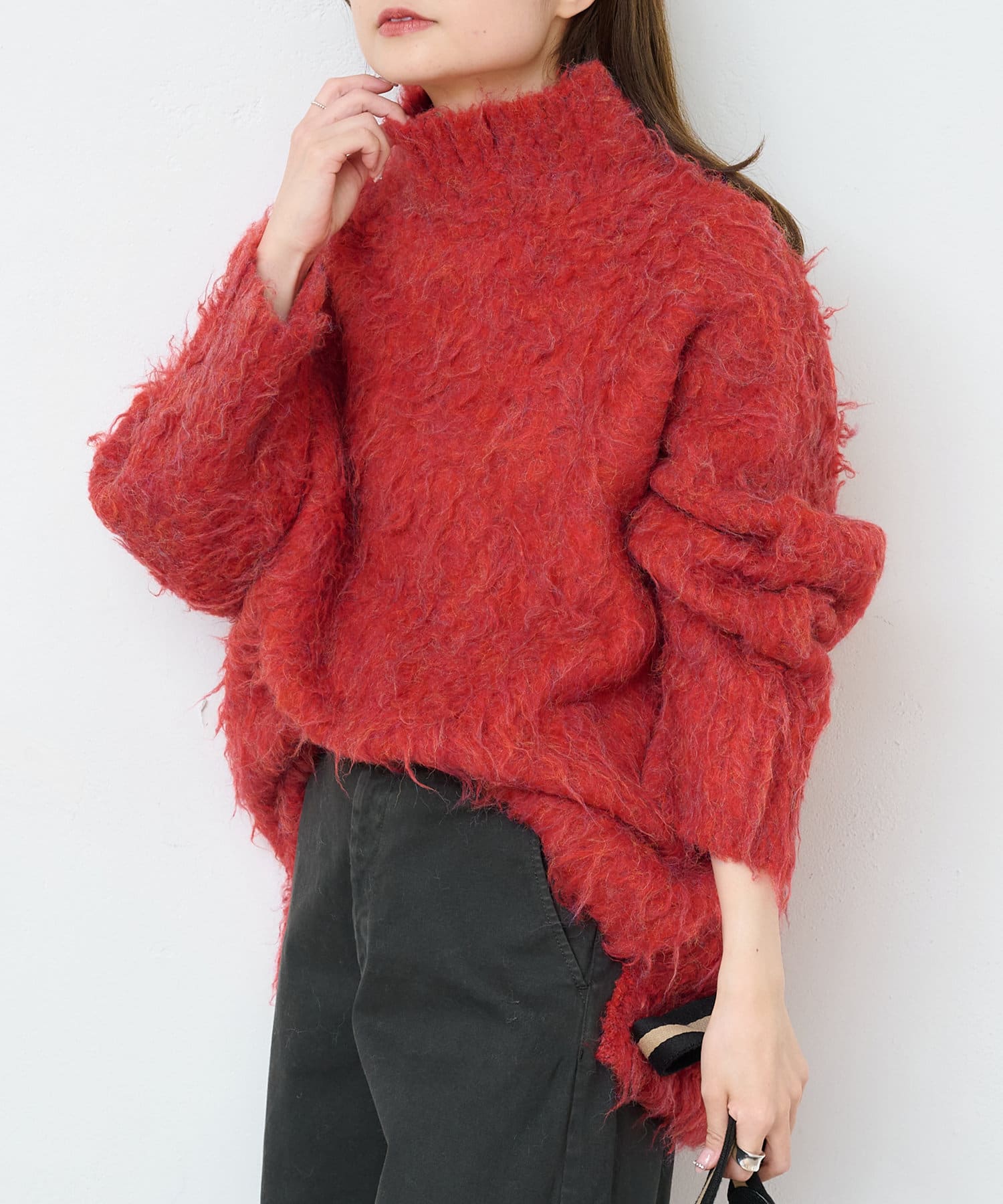 ハイネックデザインとふわふわとした起毛ニット素材で見た目も着心地も暖かな一枚。