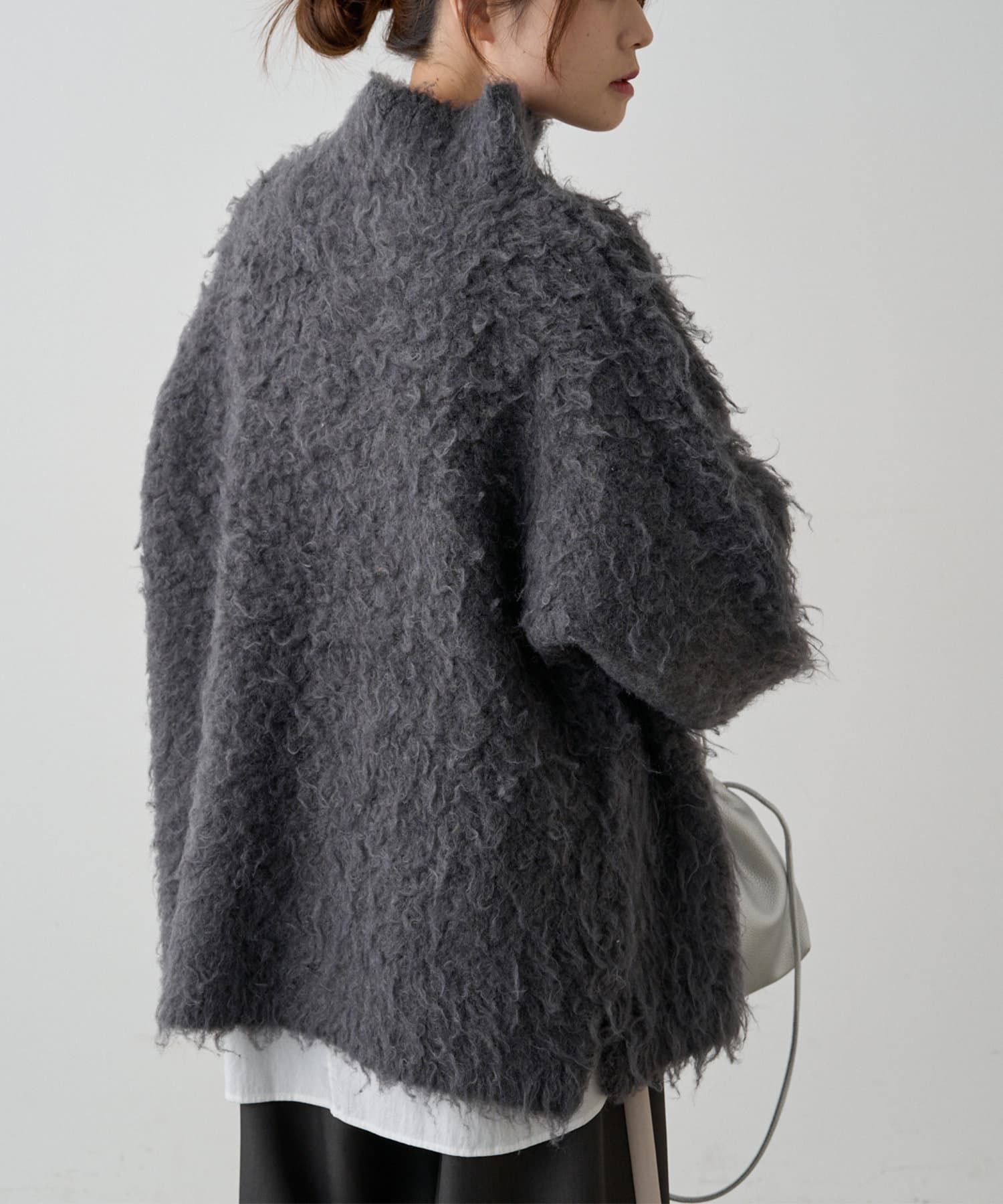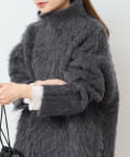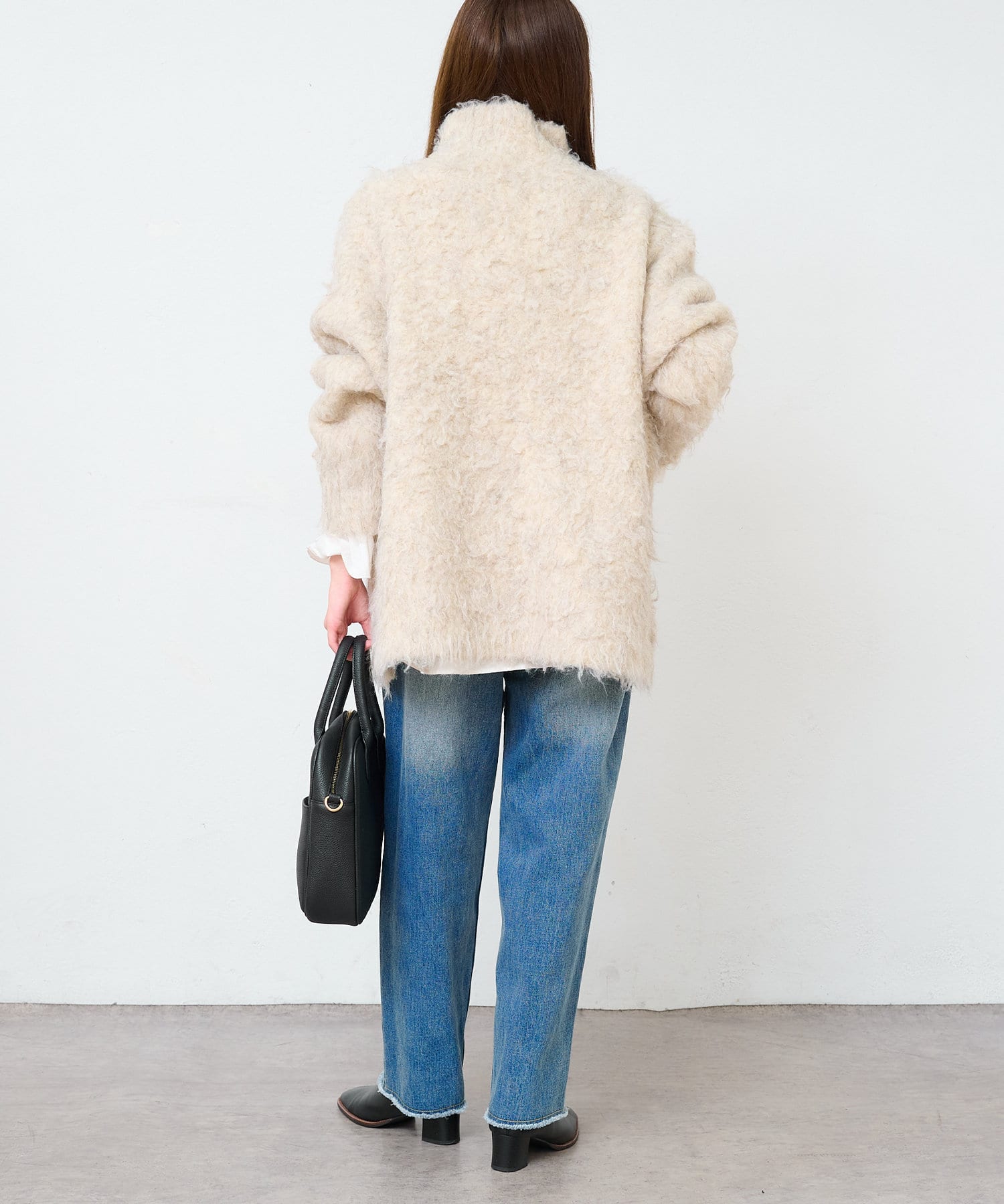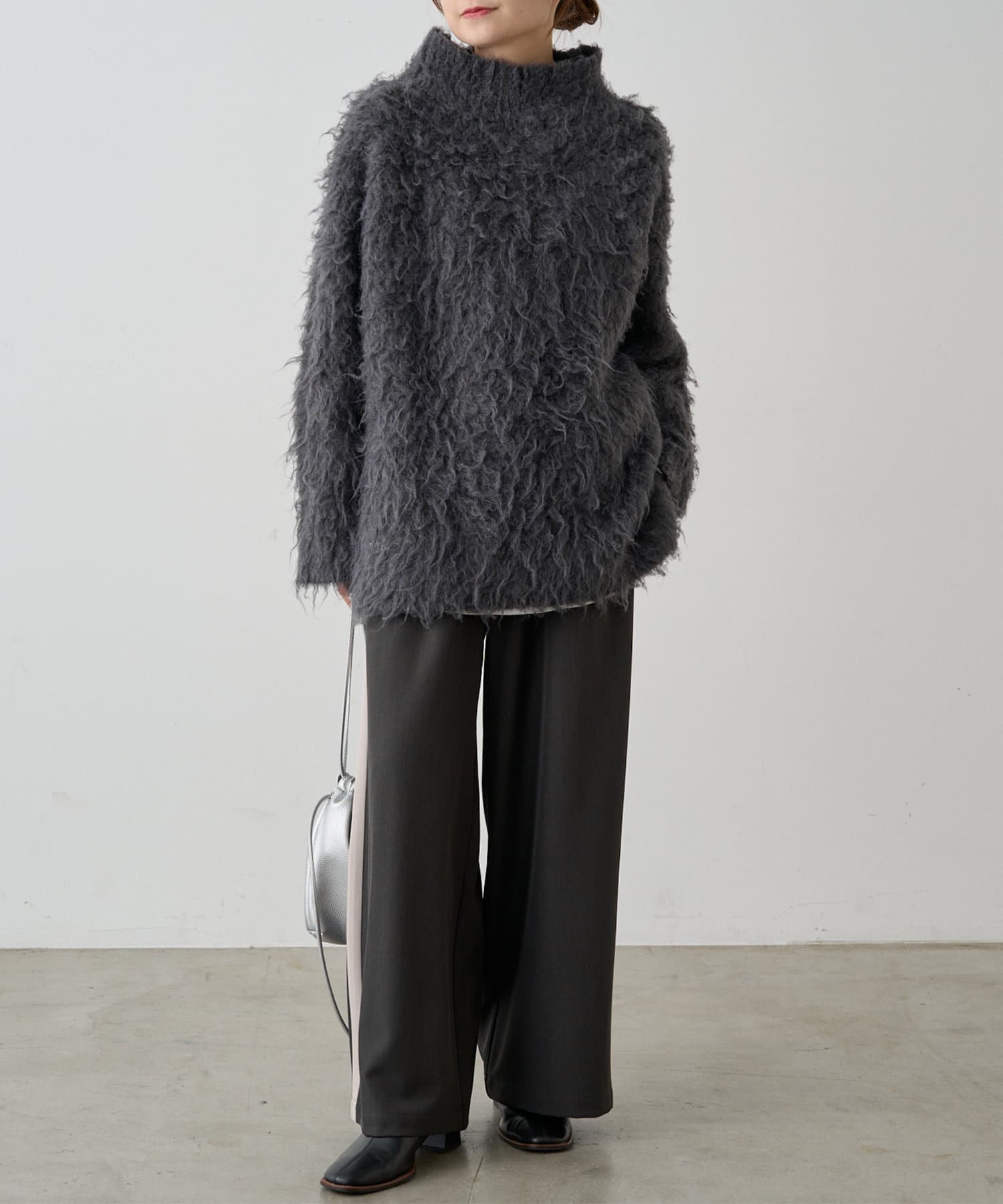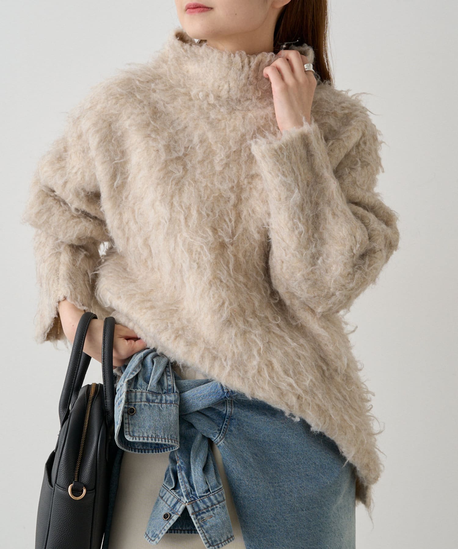 ハイネックデザインとふわふわとした起毛ニット素材で見た目も着心地も暖かな一枚。