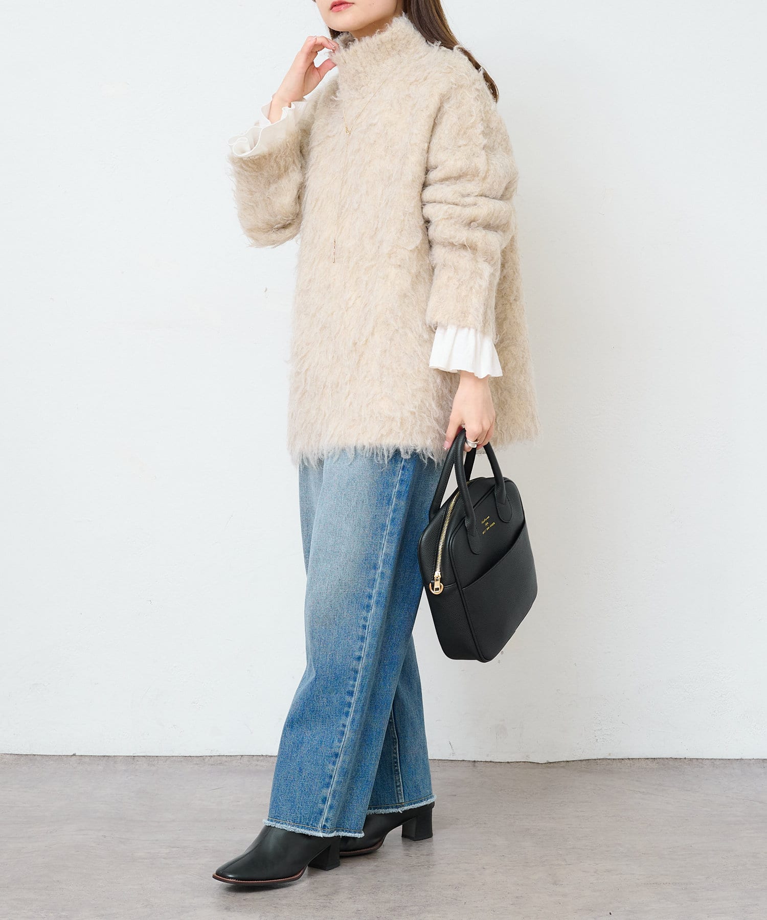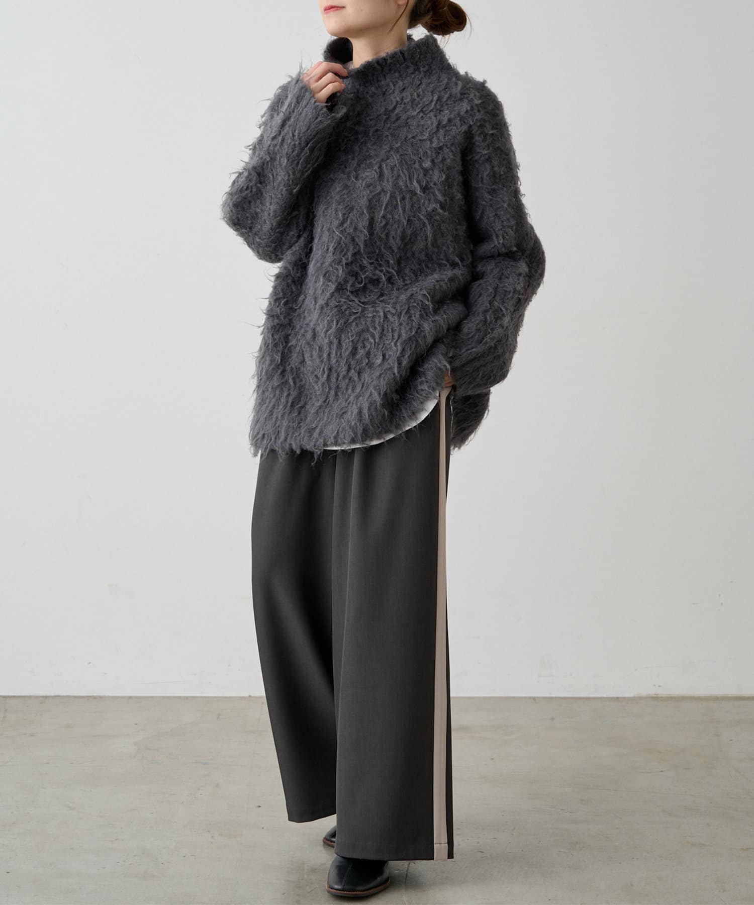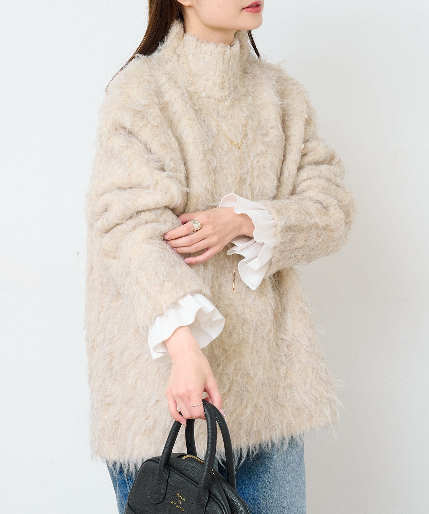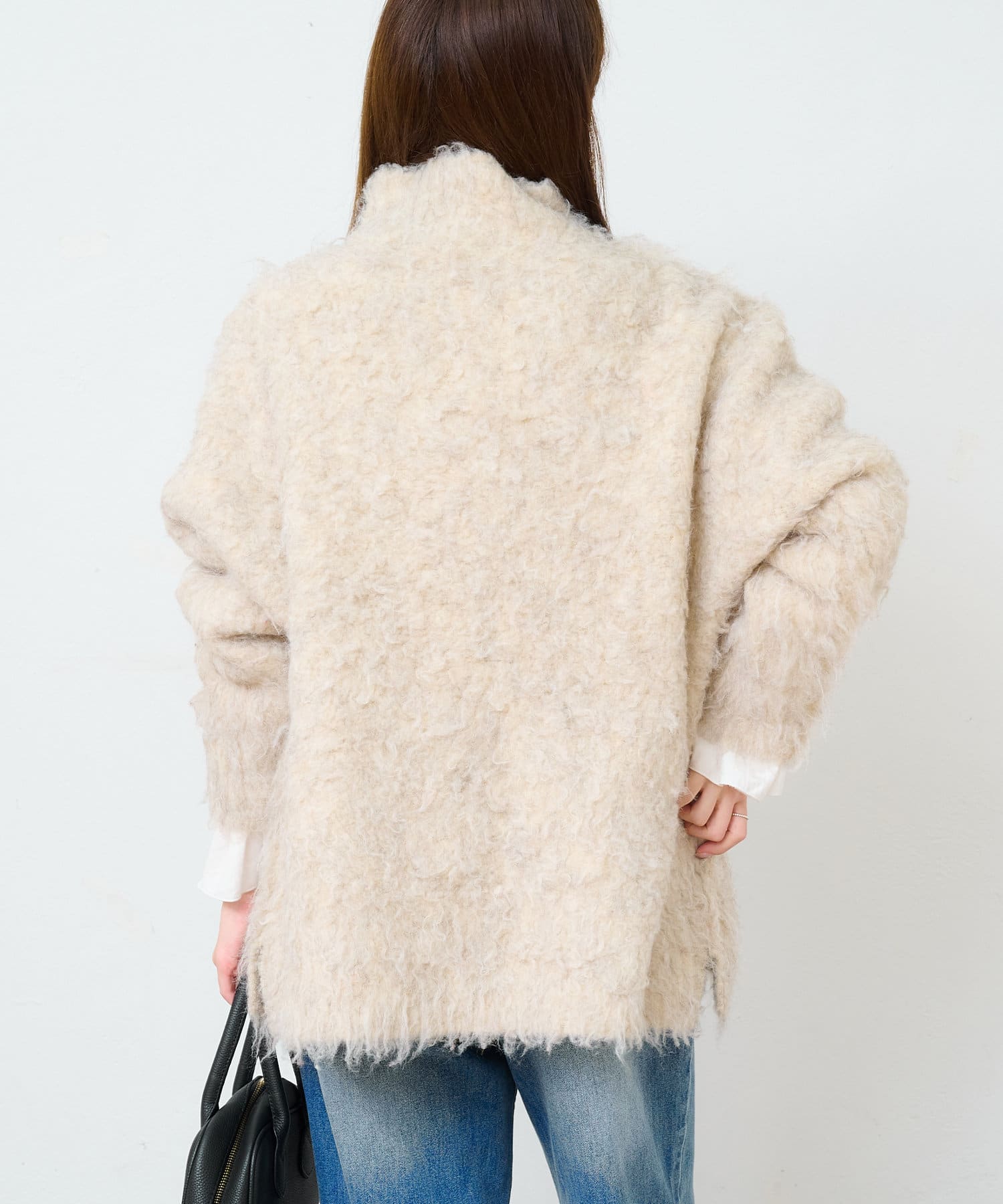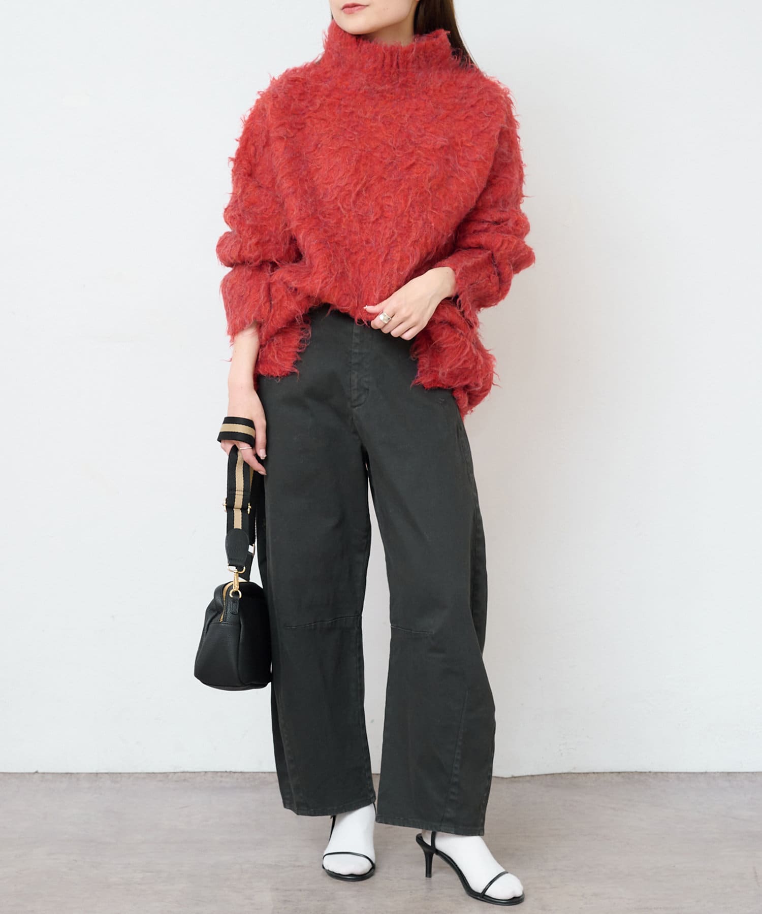 ハイネックデザインとふわふわとした起毛ニット素材で見た目も着心地も暖かな一枚。