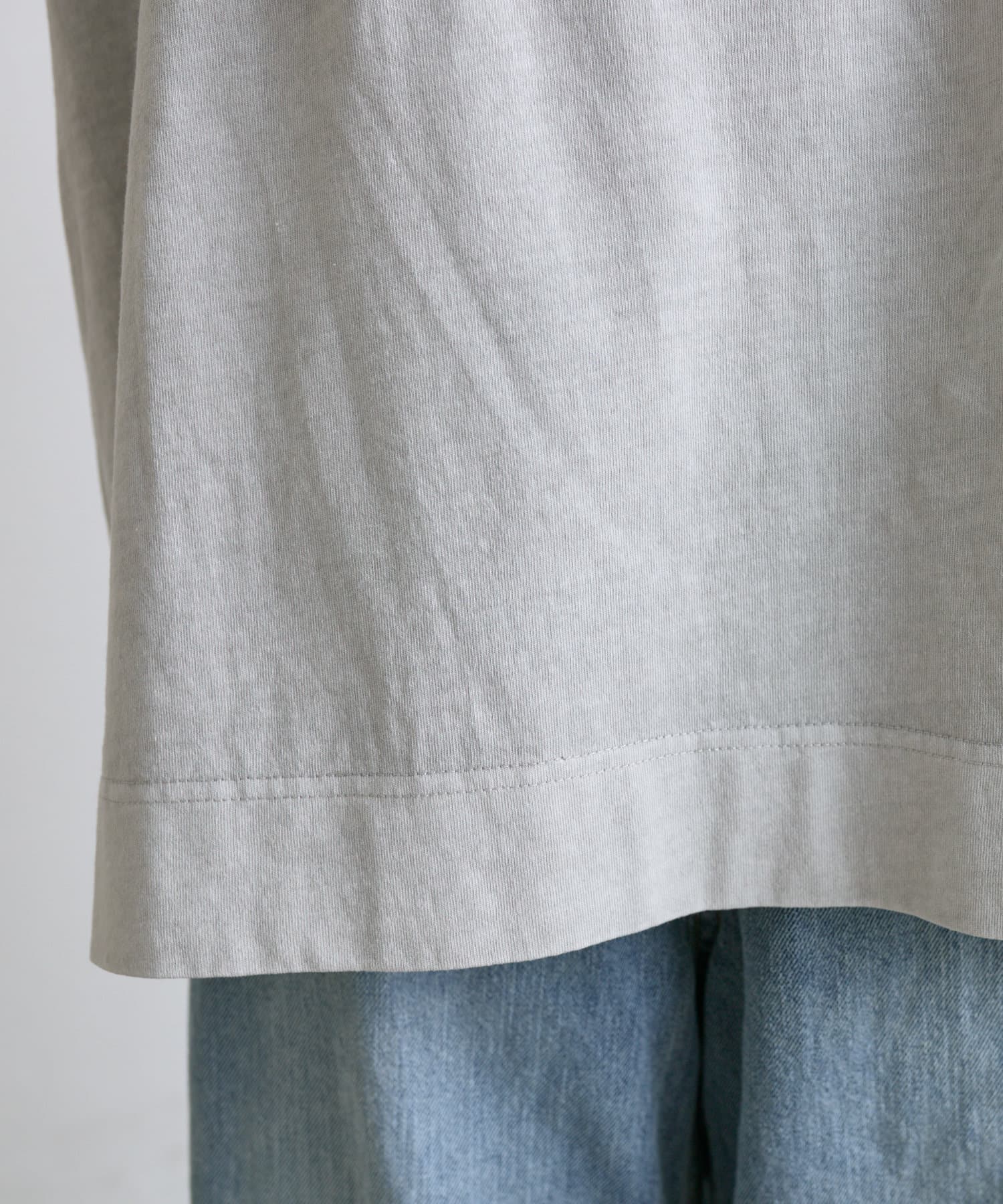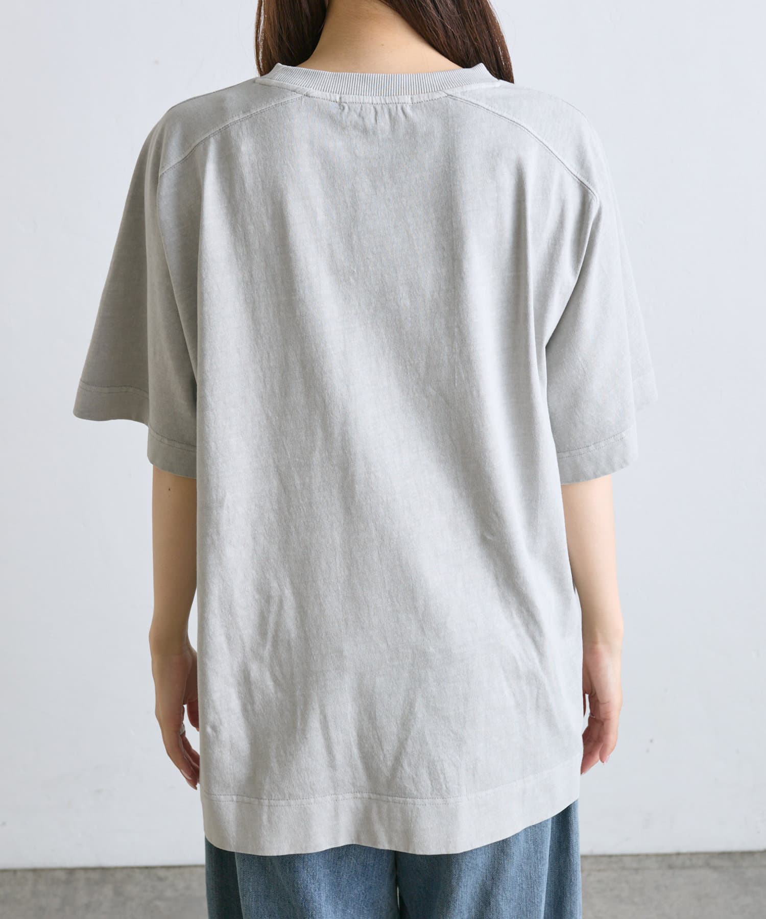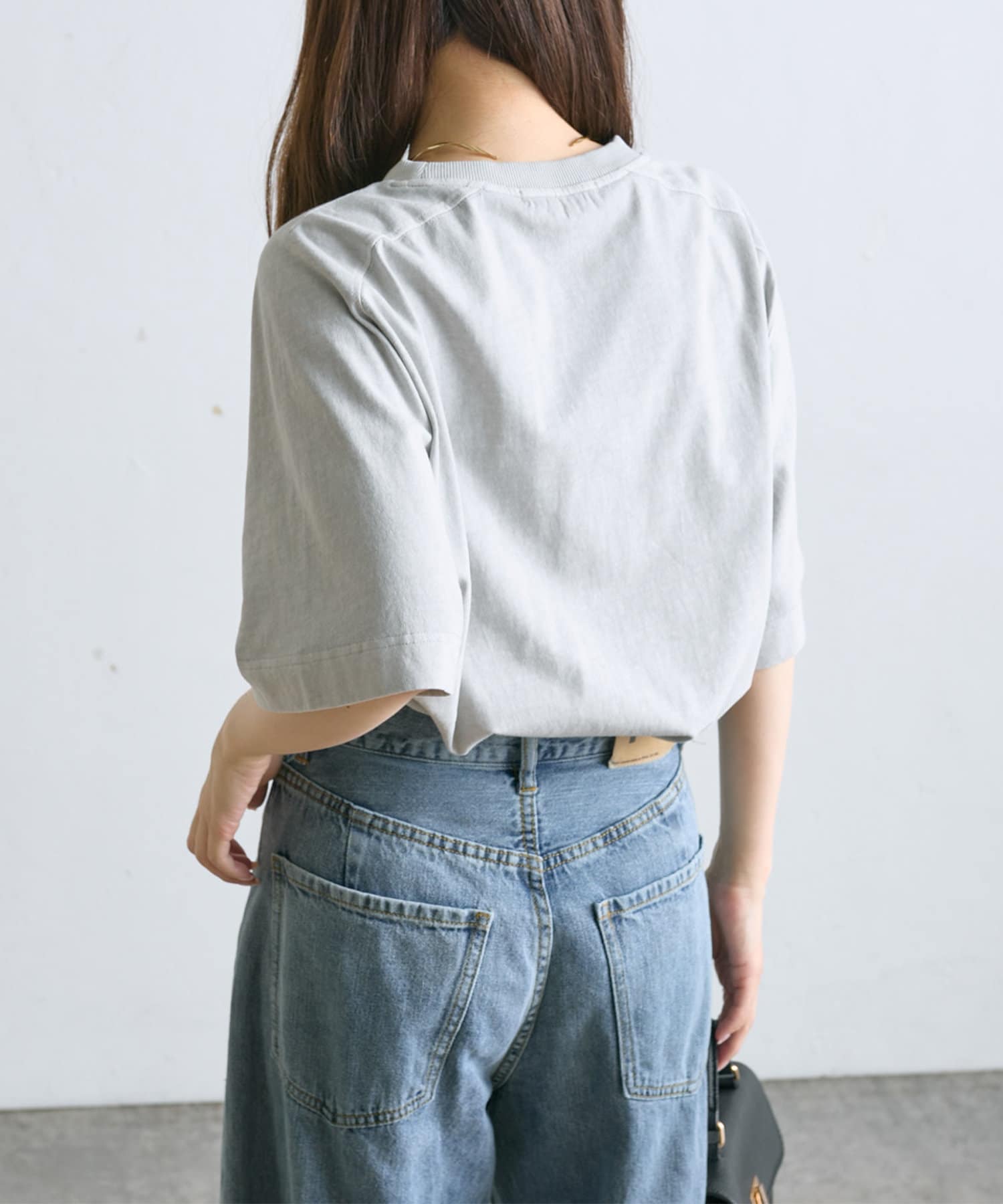首元はベーシックなクルーネック。サイズ感はややゆったりとしたラフな印象の一着です。