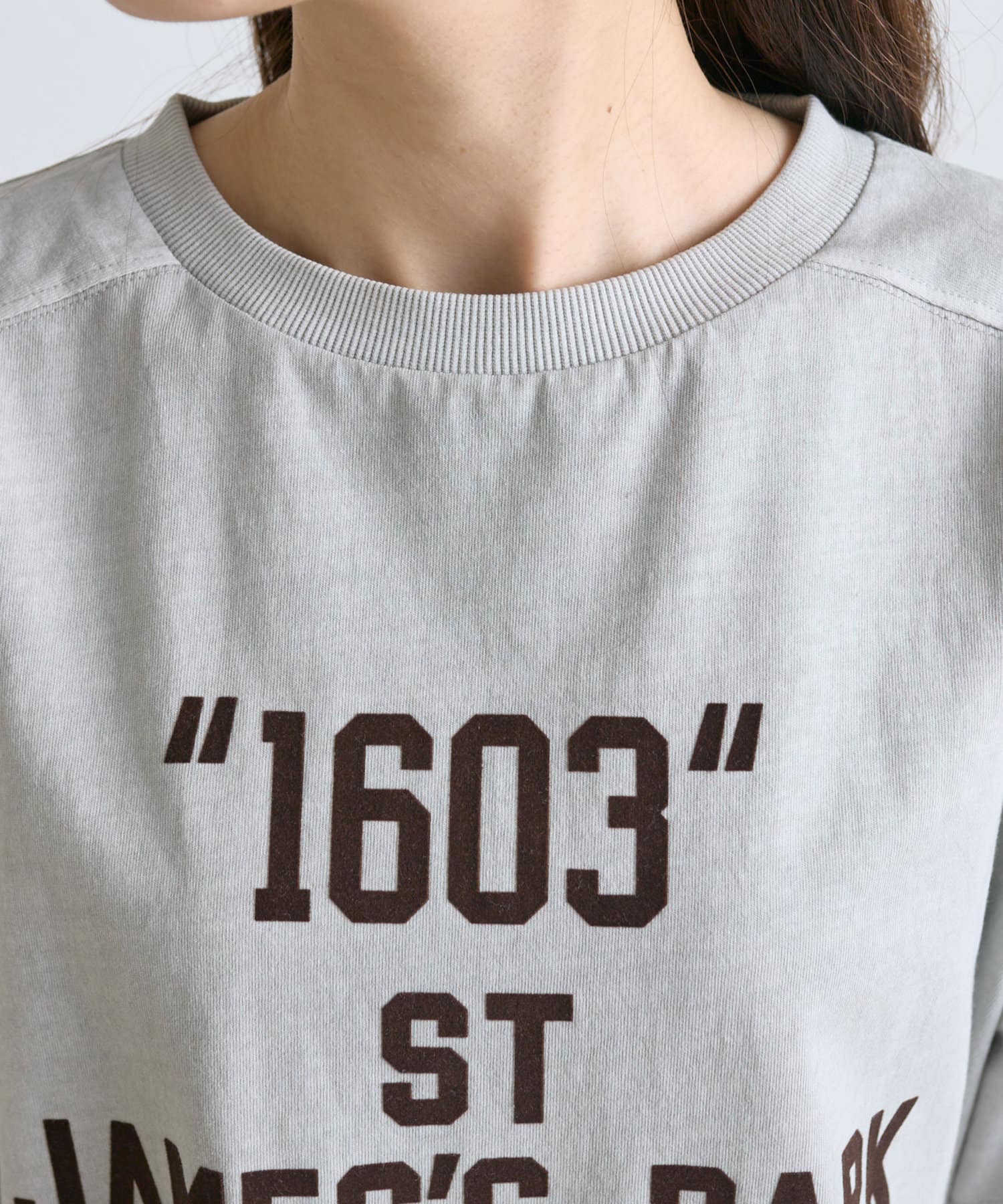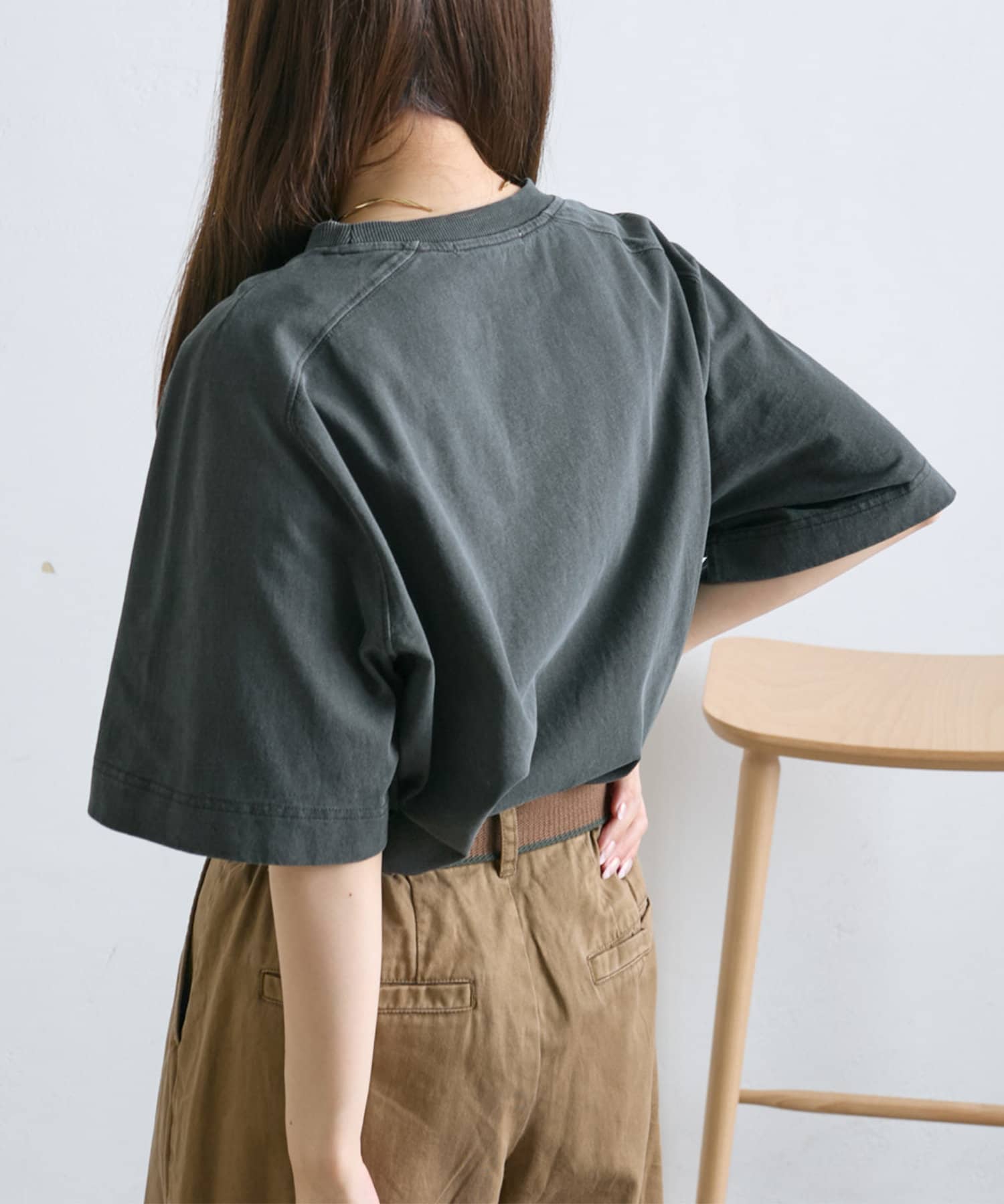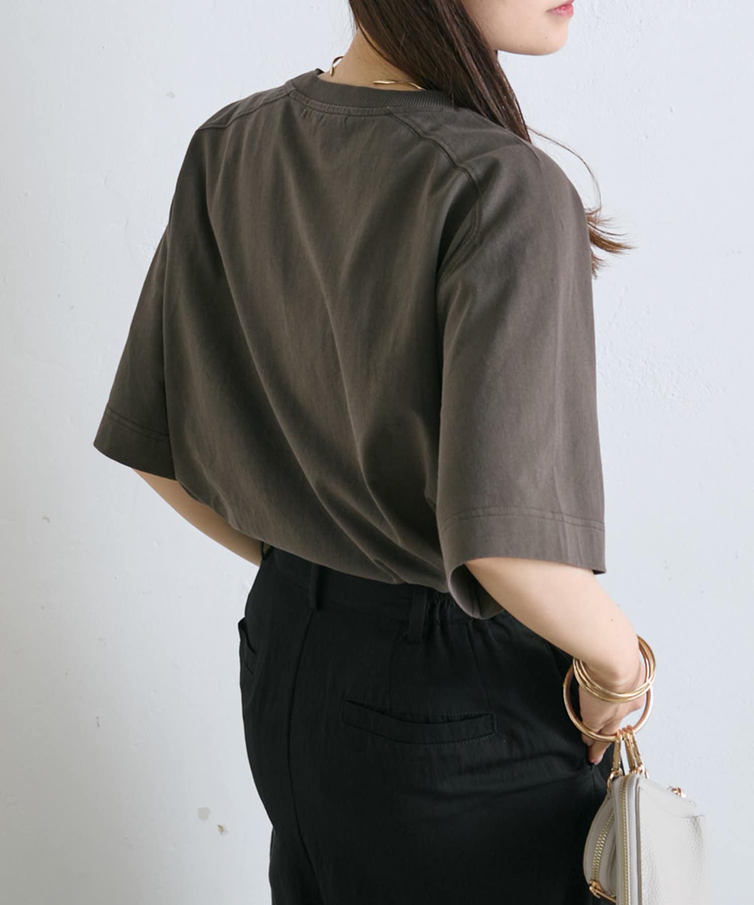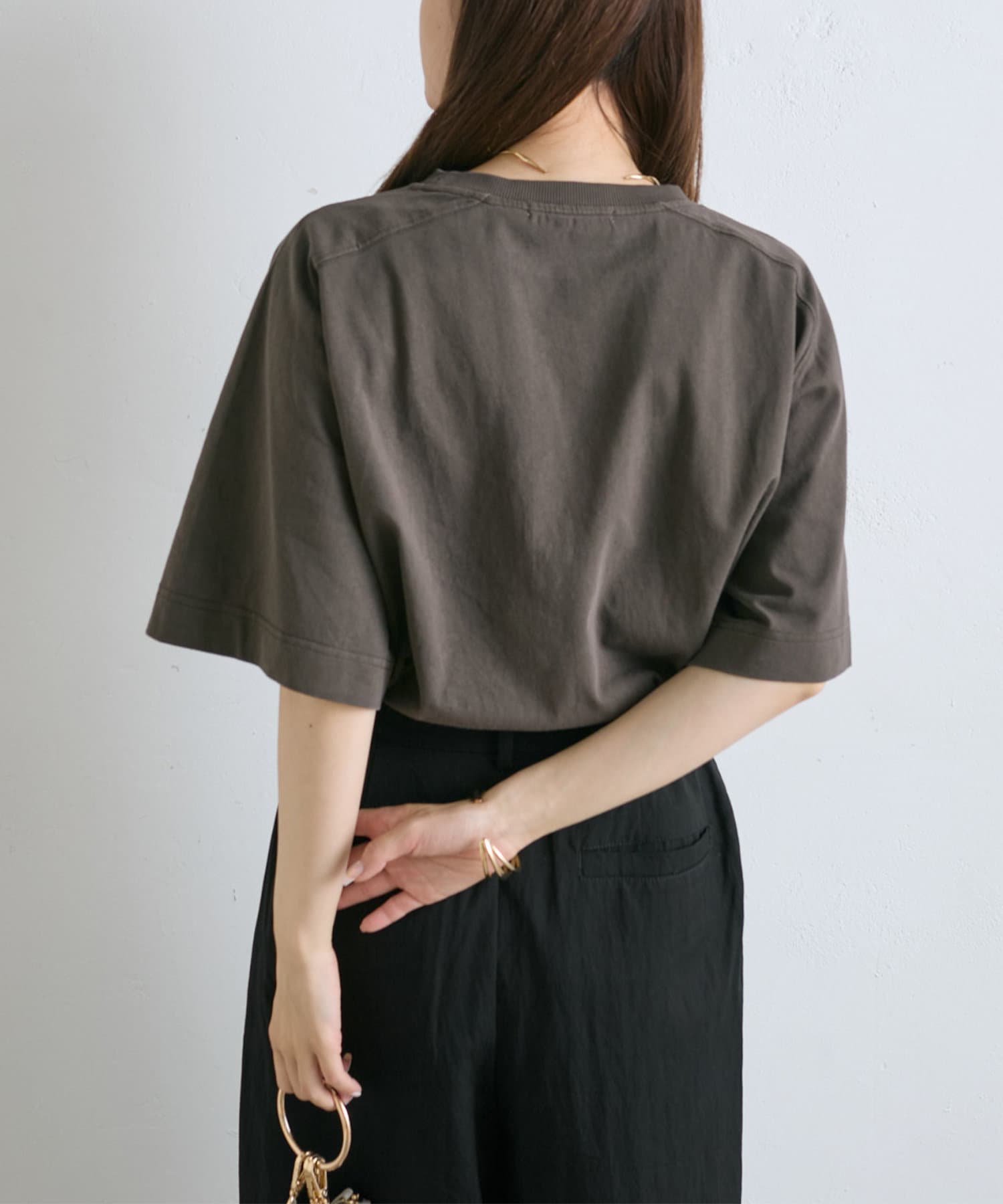 首元はベーシックなクルーネック。サイズ感はややゆったりとしたラフな印象の一着です。