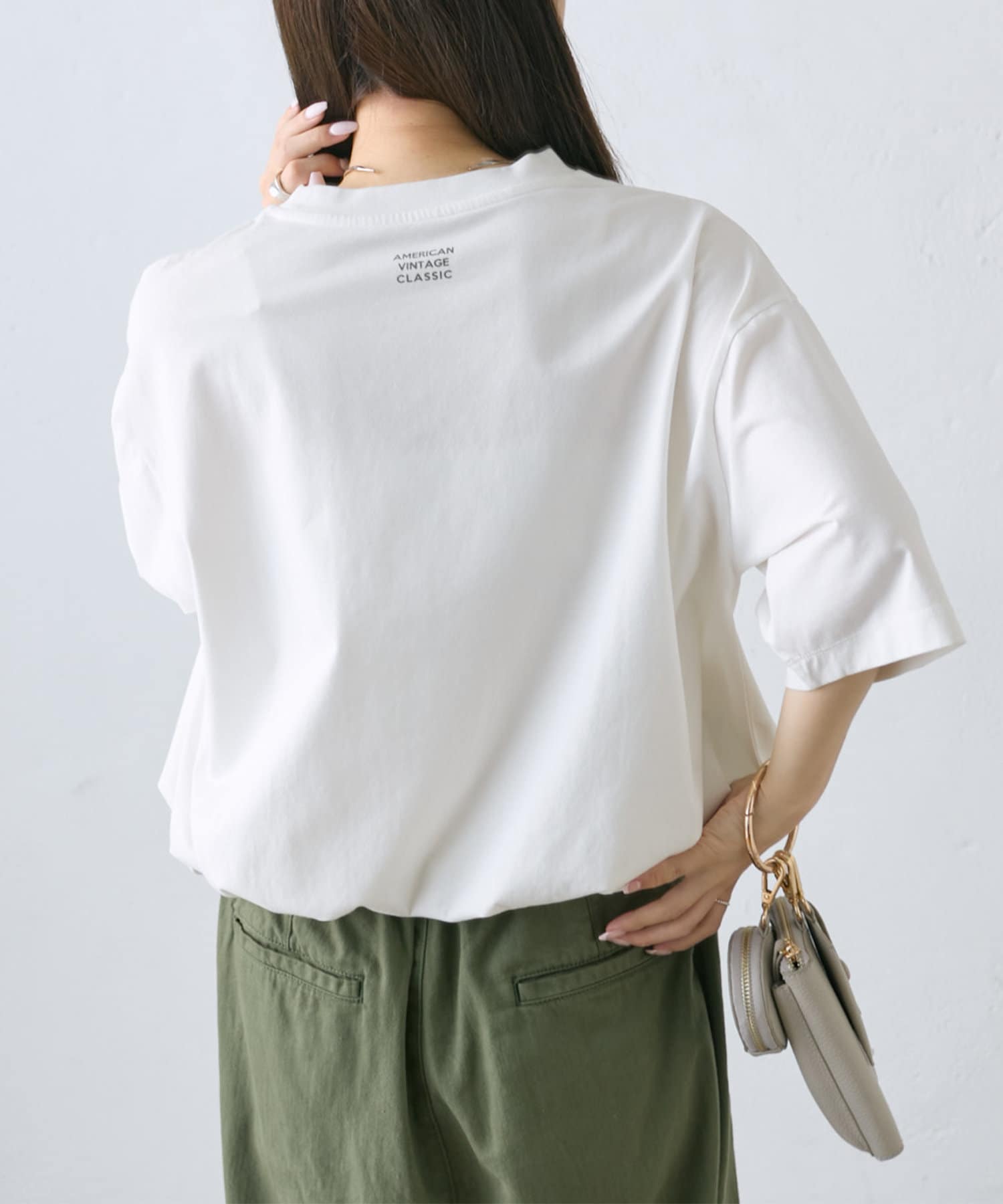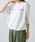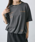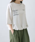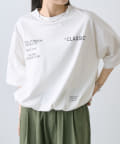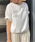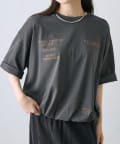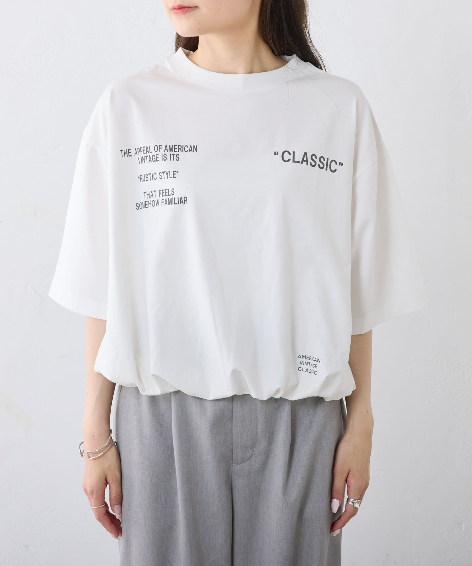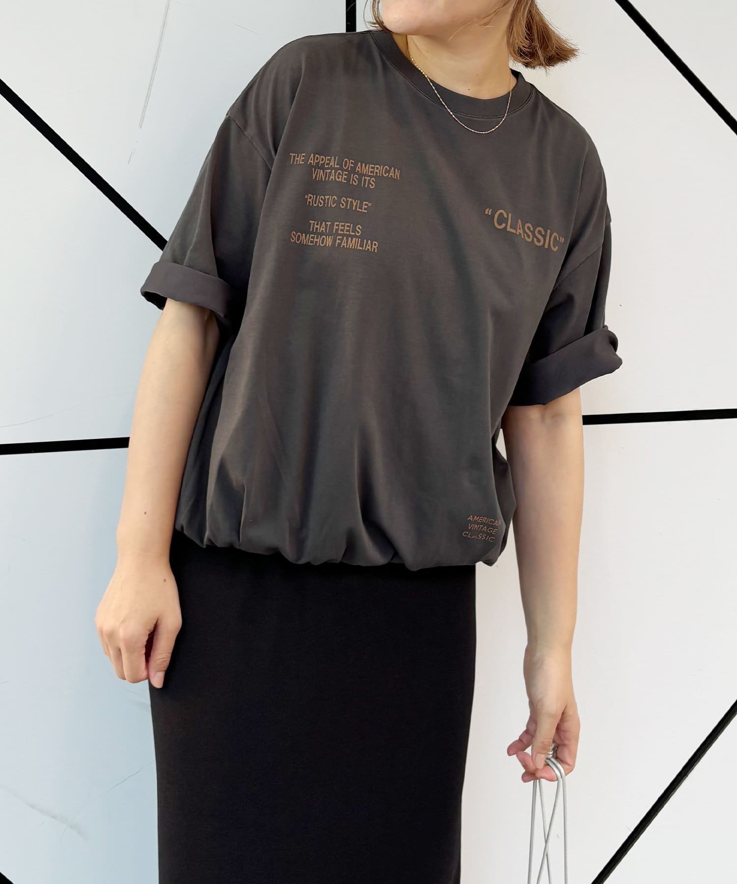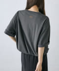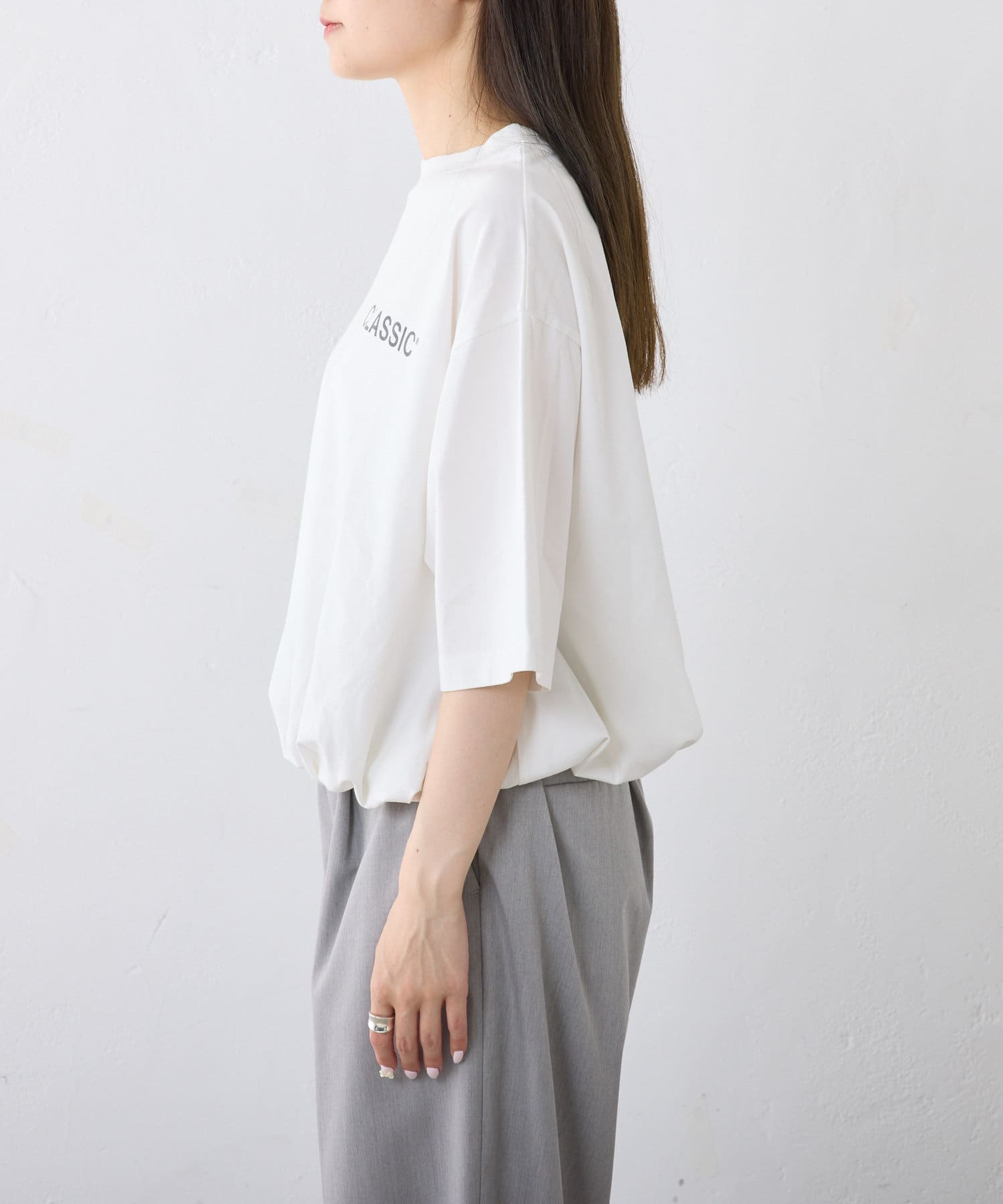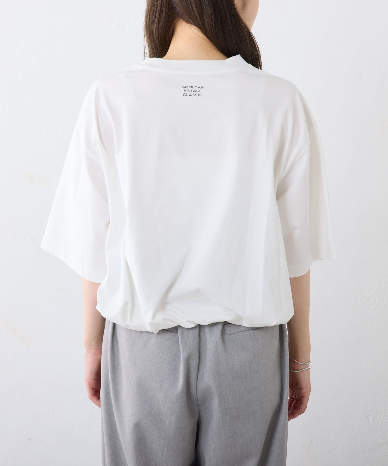 裾にゴムでギャザーを付け、自然にブラウジングしている様なシルエットが楽しめるデザインTシャツ。