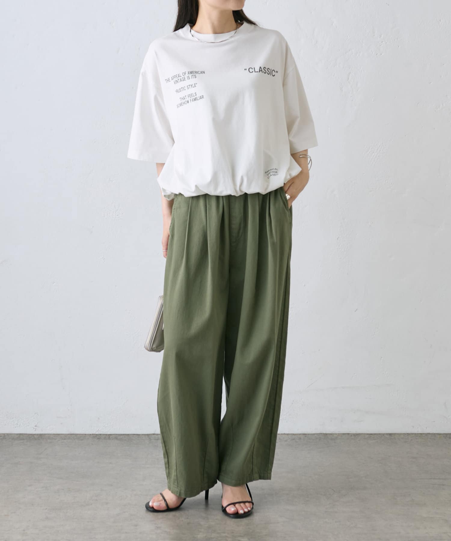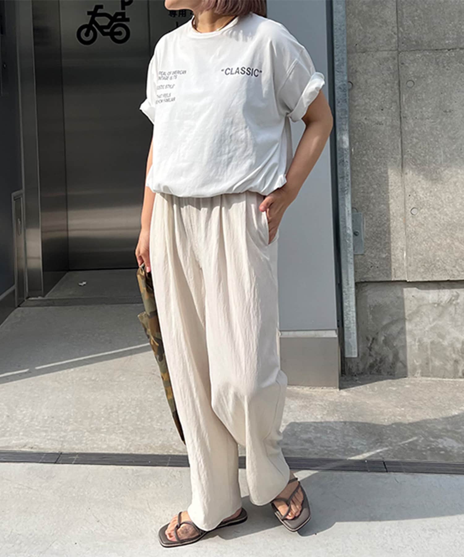 スニーカーやサンダルなど、足元でテイストの変化を楽しめます。