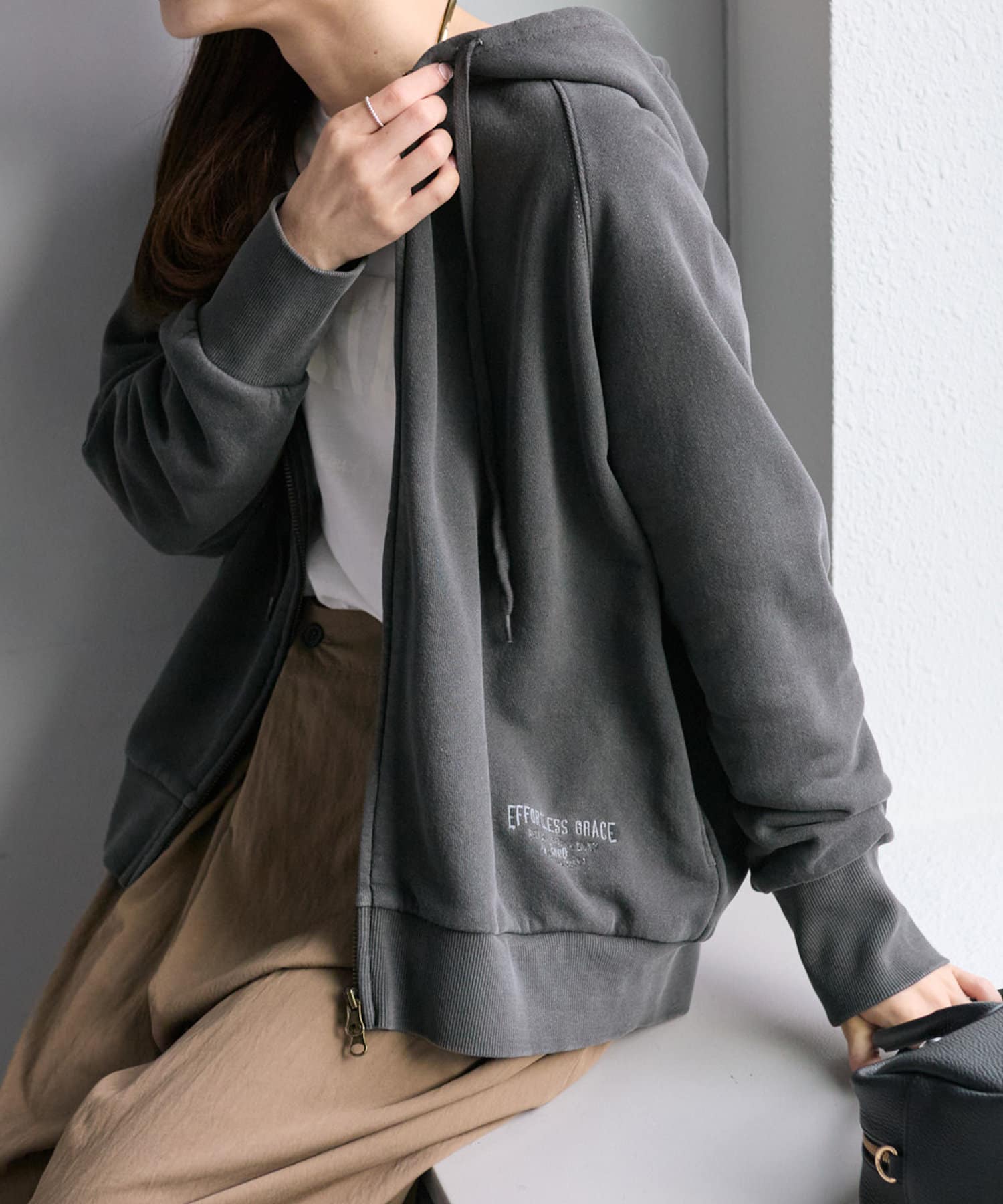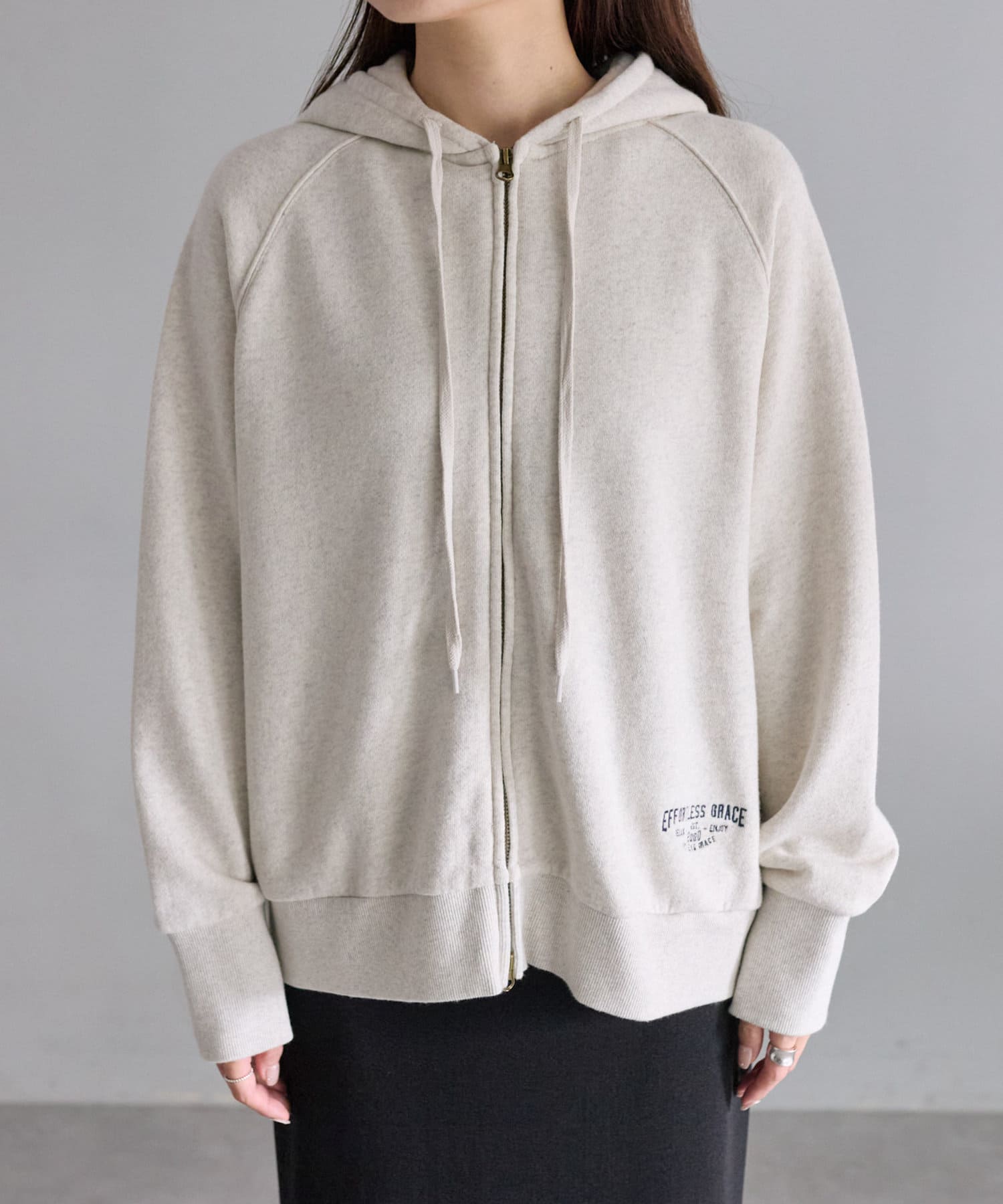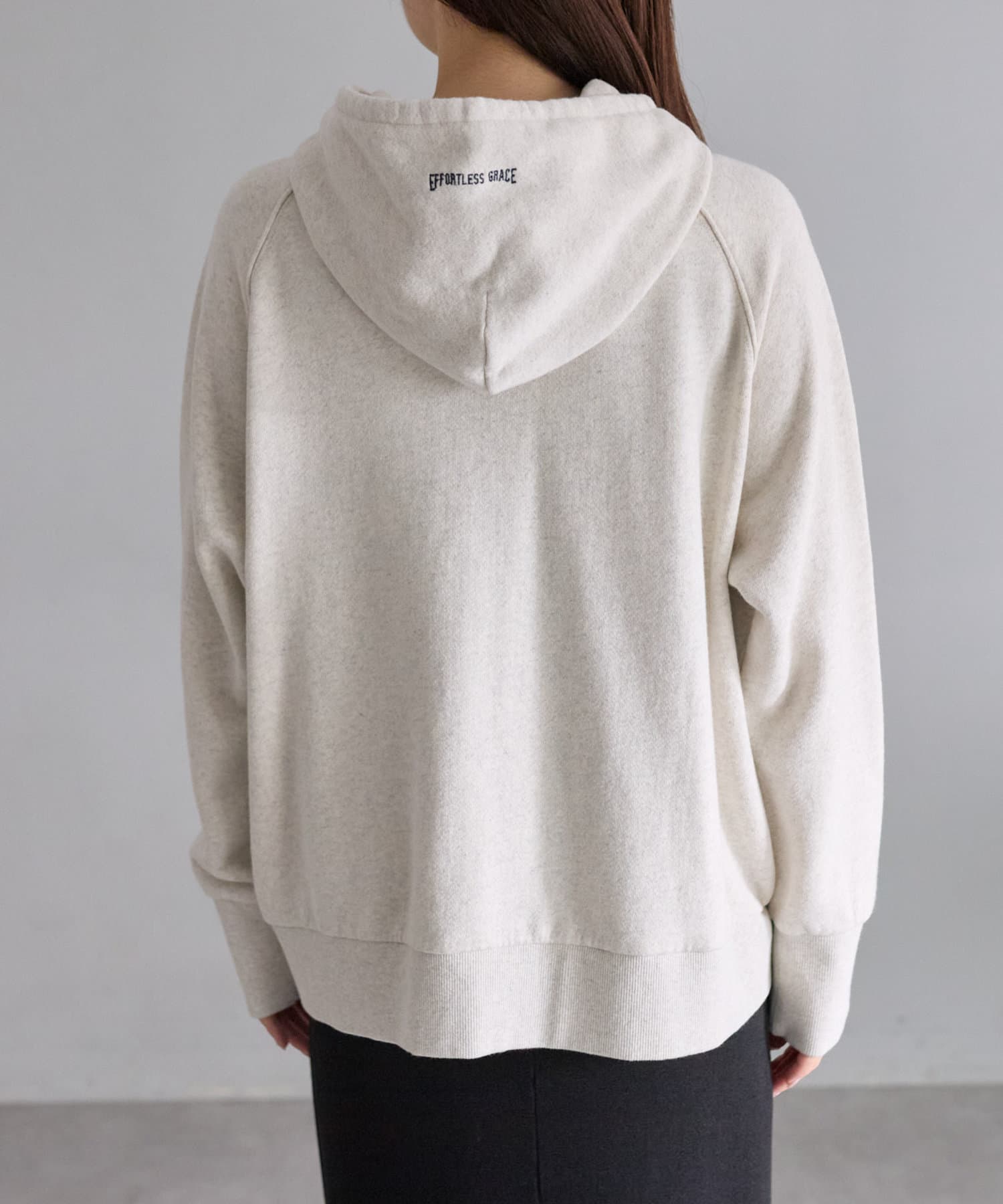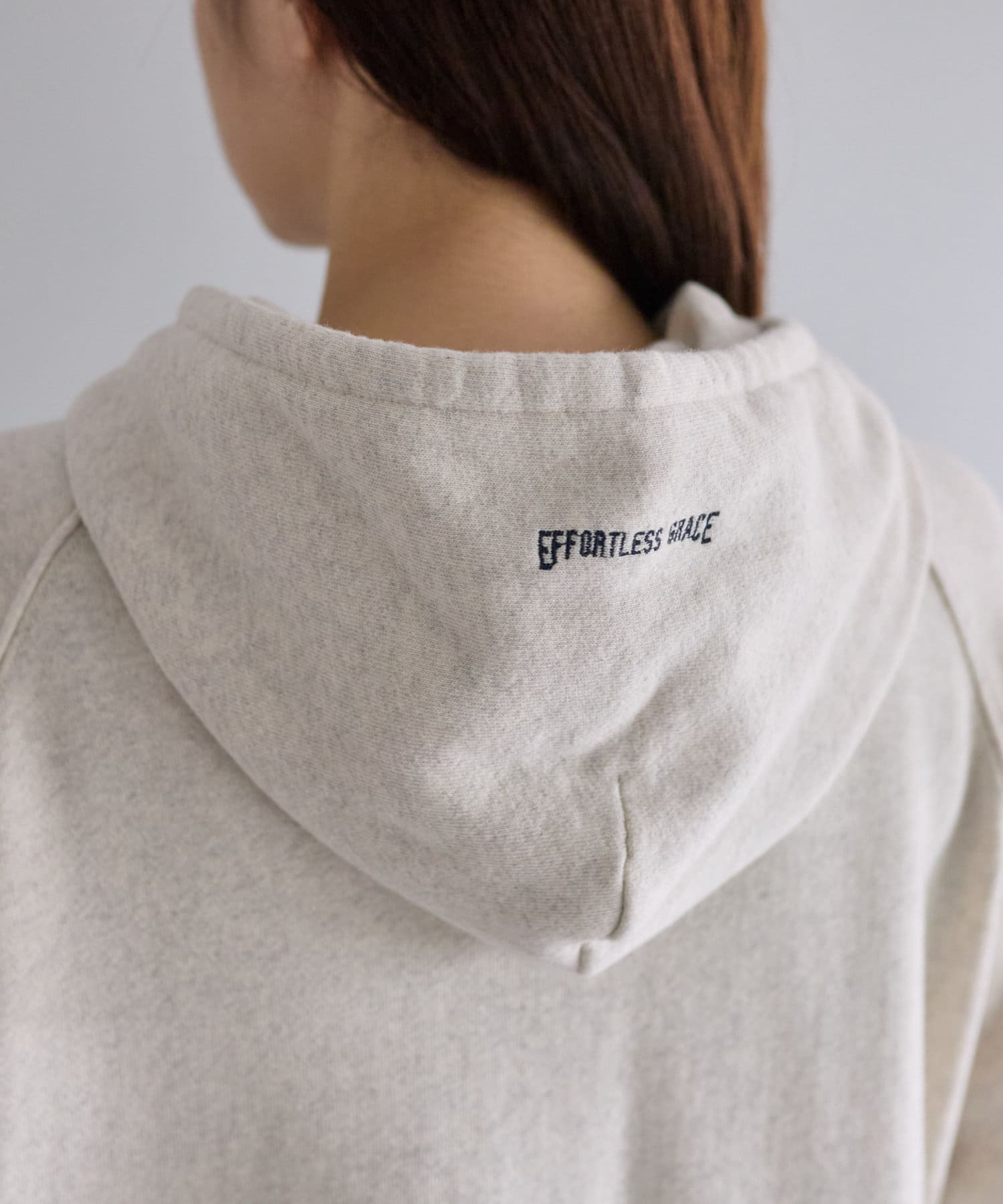 フード部分とサイド裾には「EFORTLESS GRACE」をロゴデザイン化した刺繍を施しアクセントに。