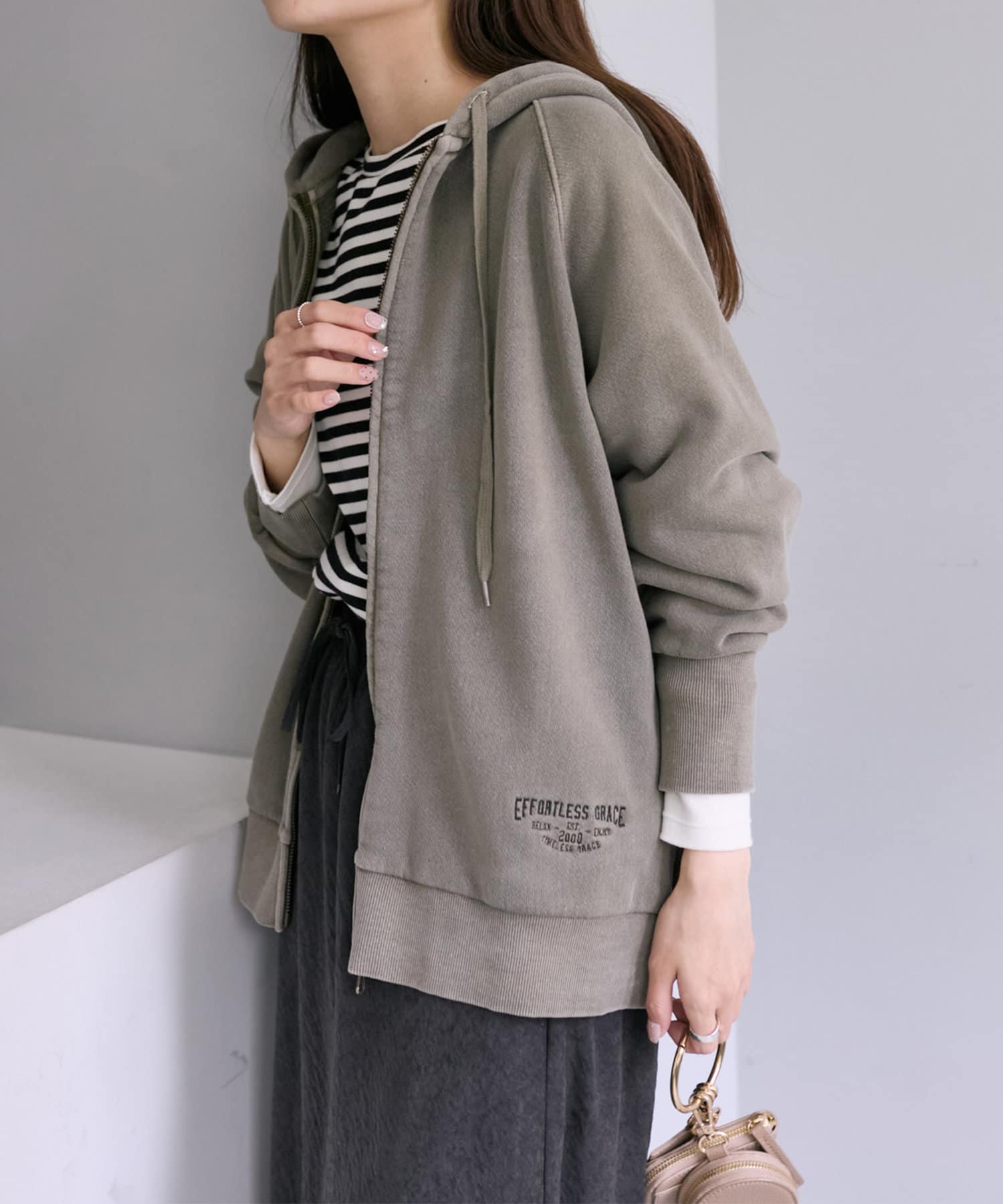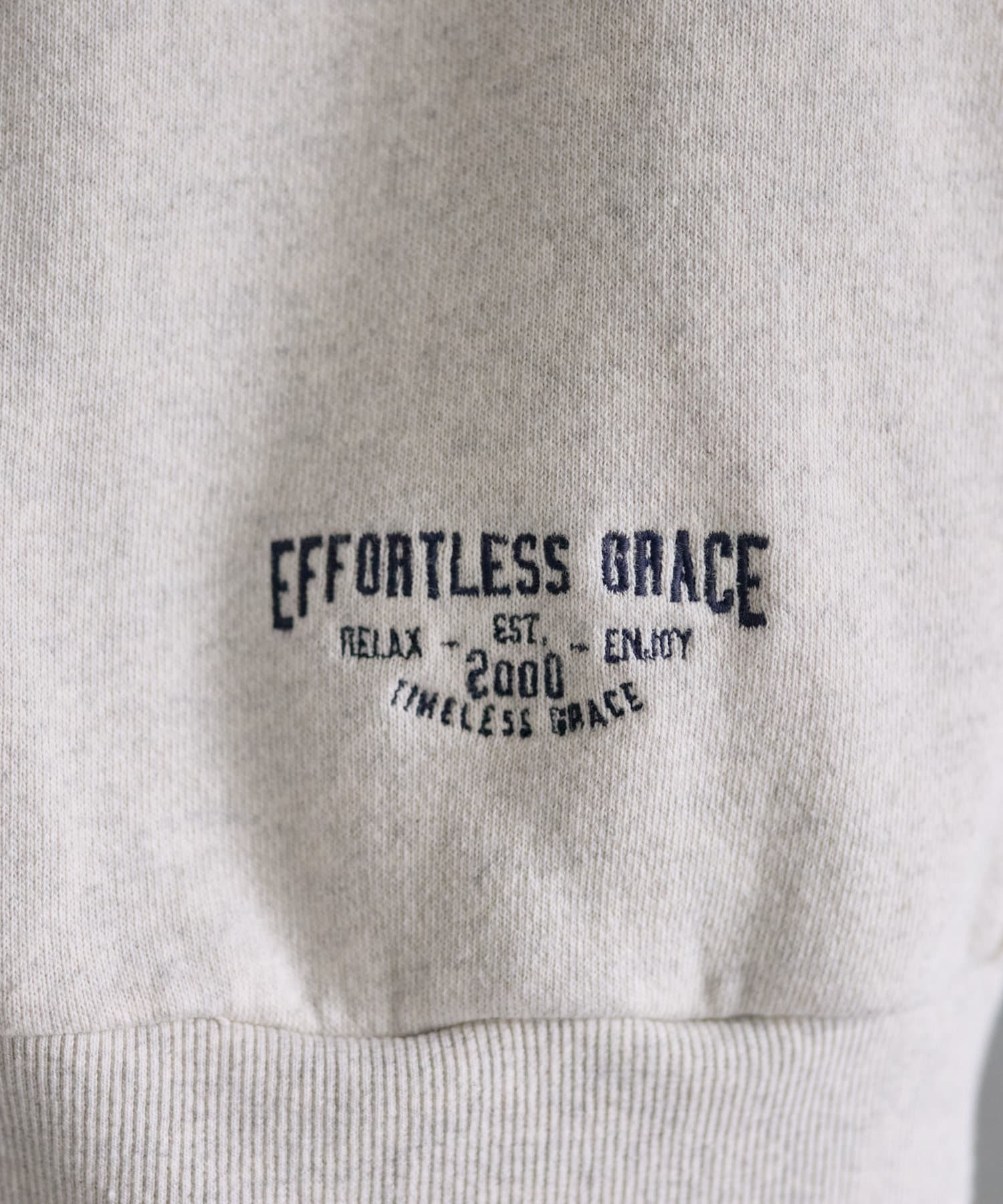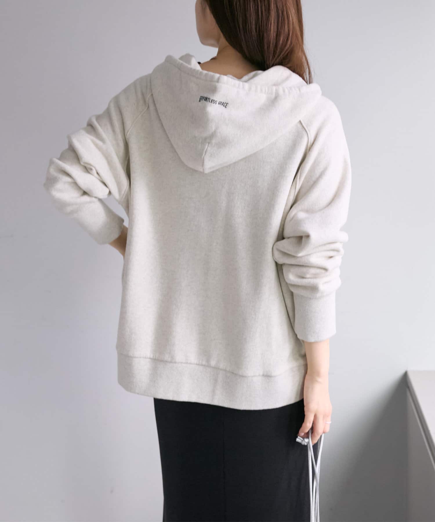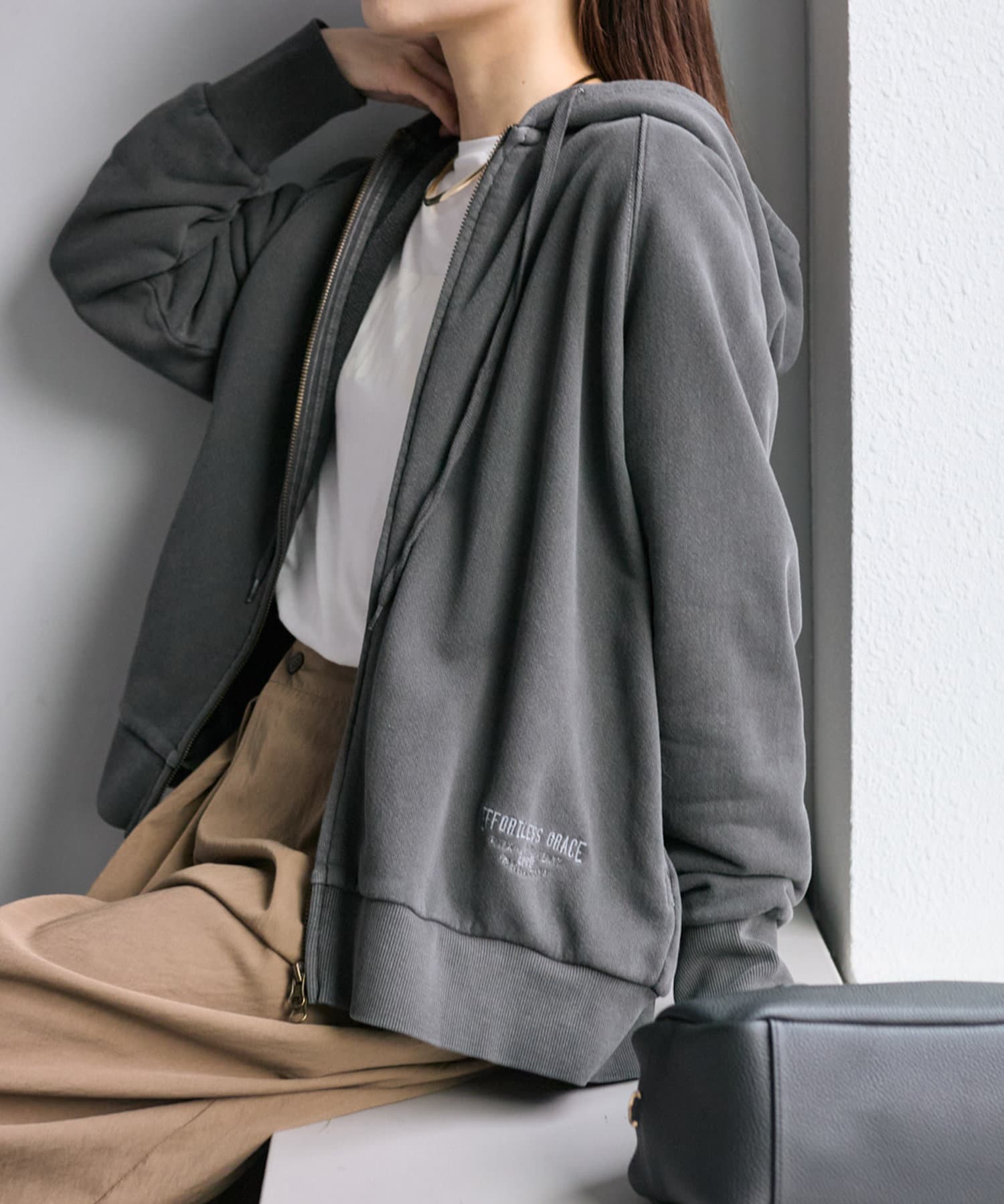 フード部分とサイド裾には「EFORTLESS GRACE」をロゴデザイン化した刺繍を施しアクセントに。