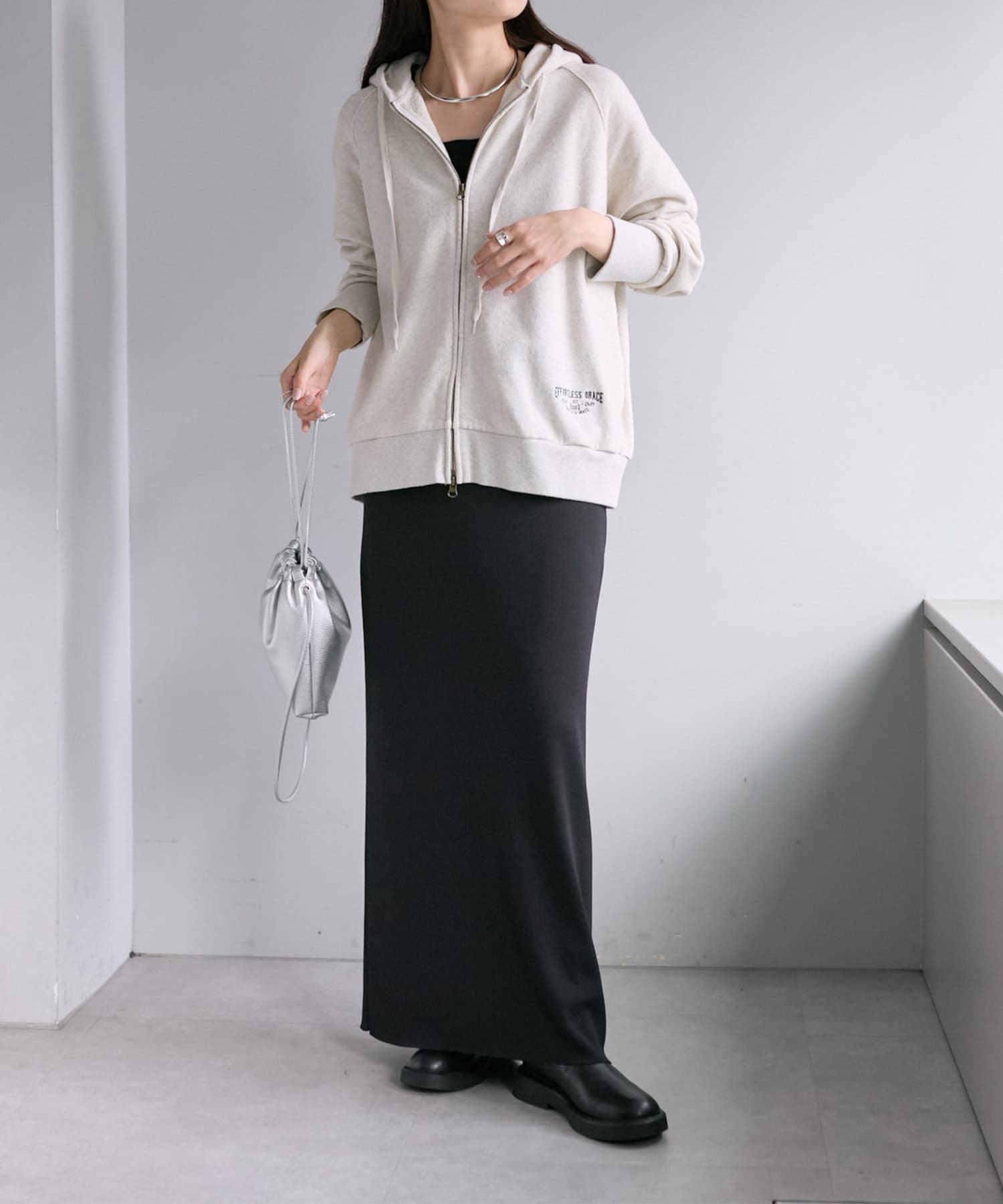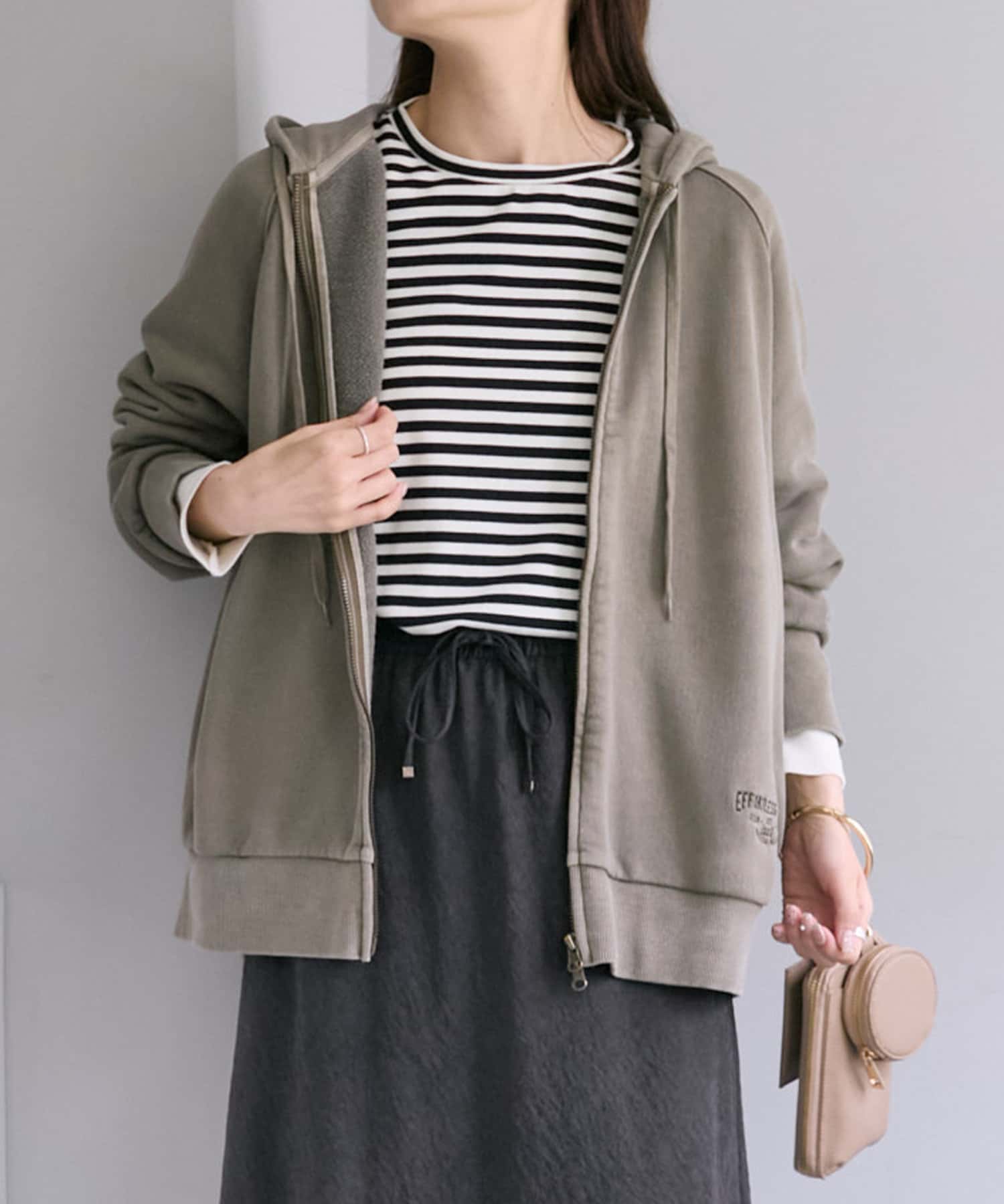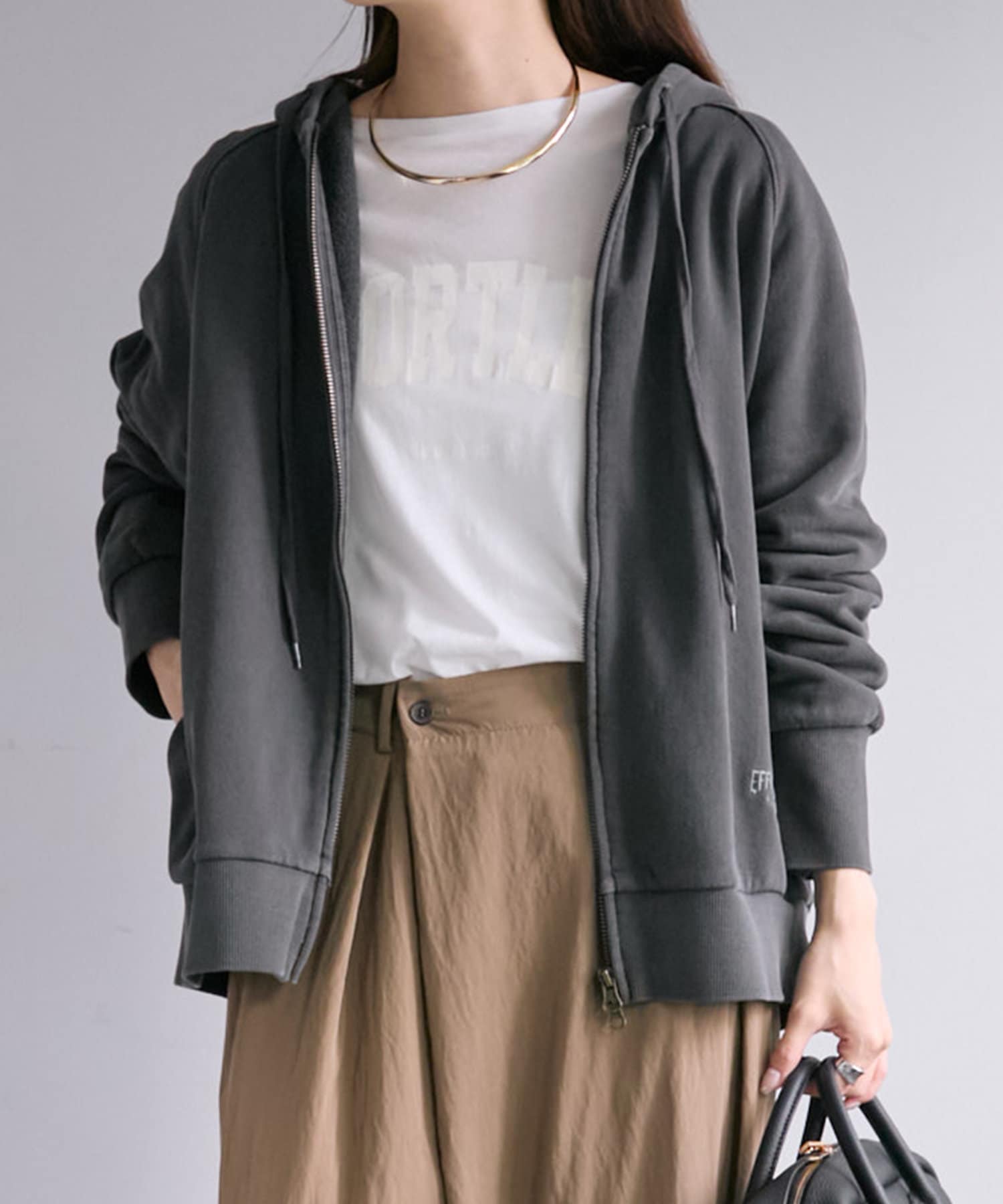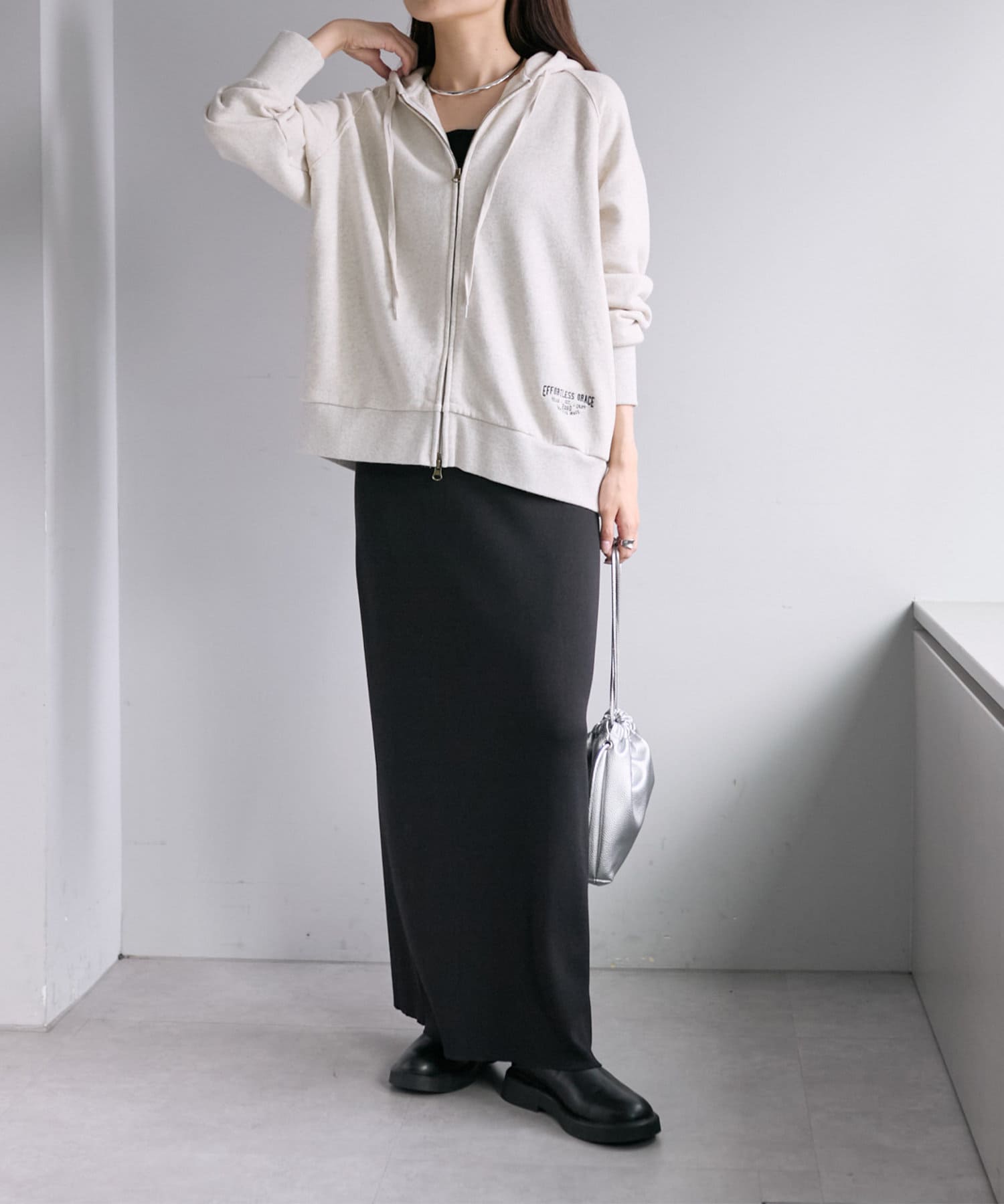 フード部分とサイド裾には「EFORTLESS GRACE」をロゴデザイン化した刺繍を施しアクセントに。
