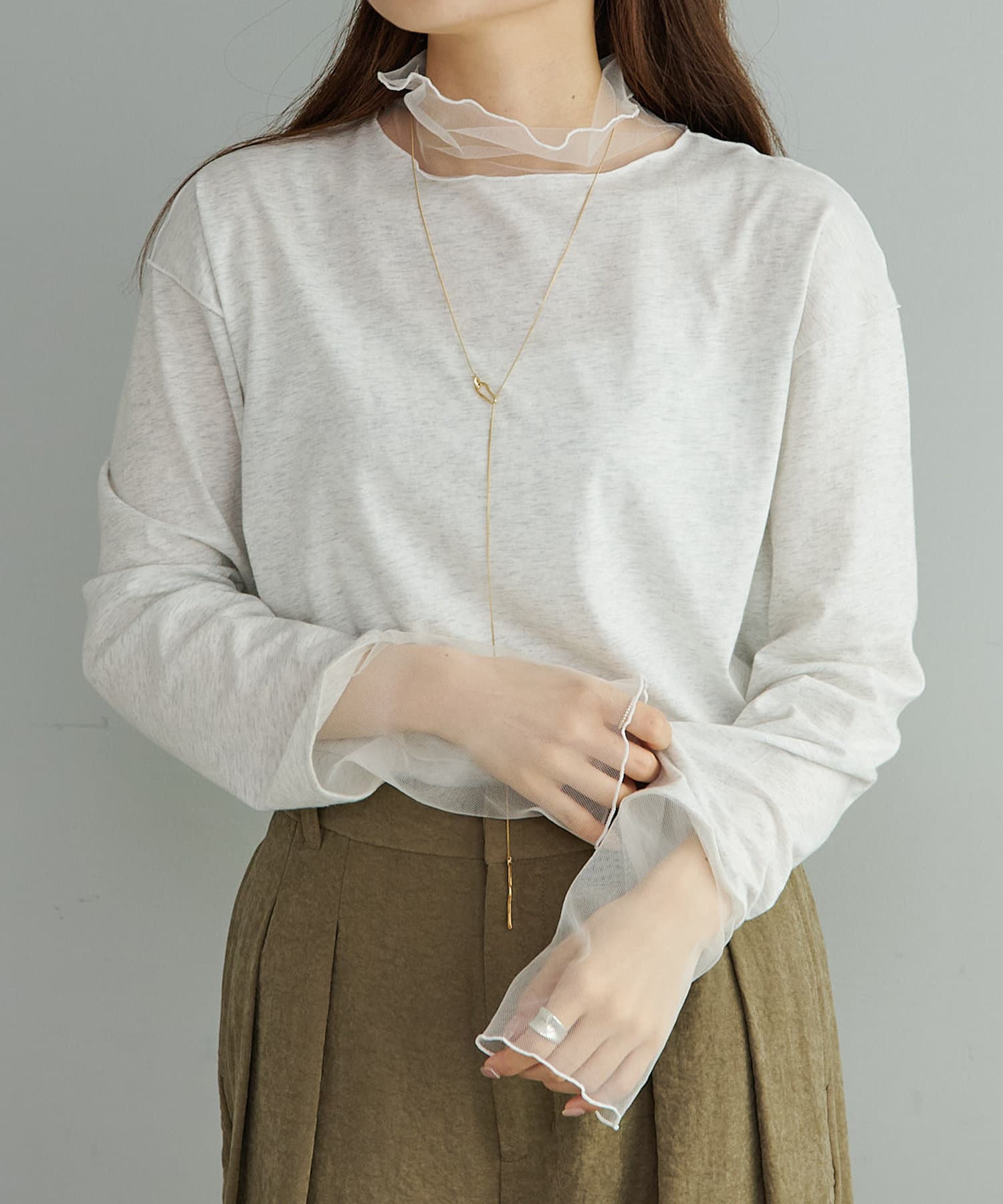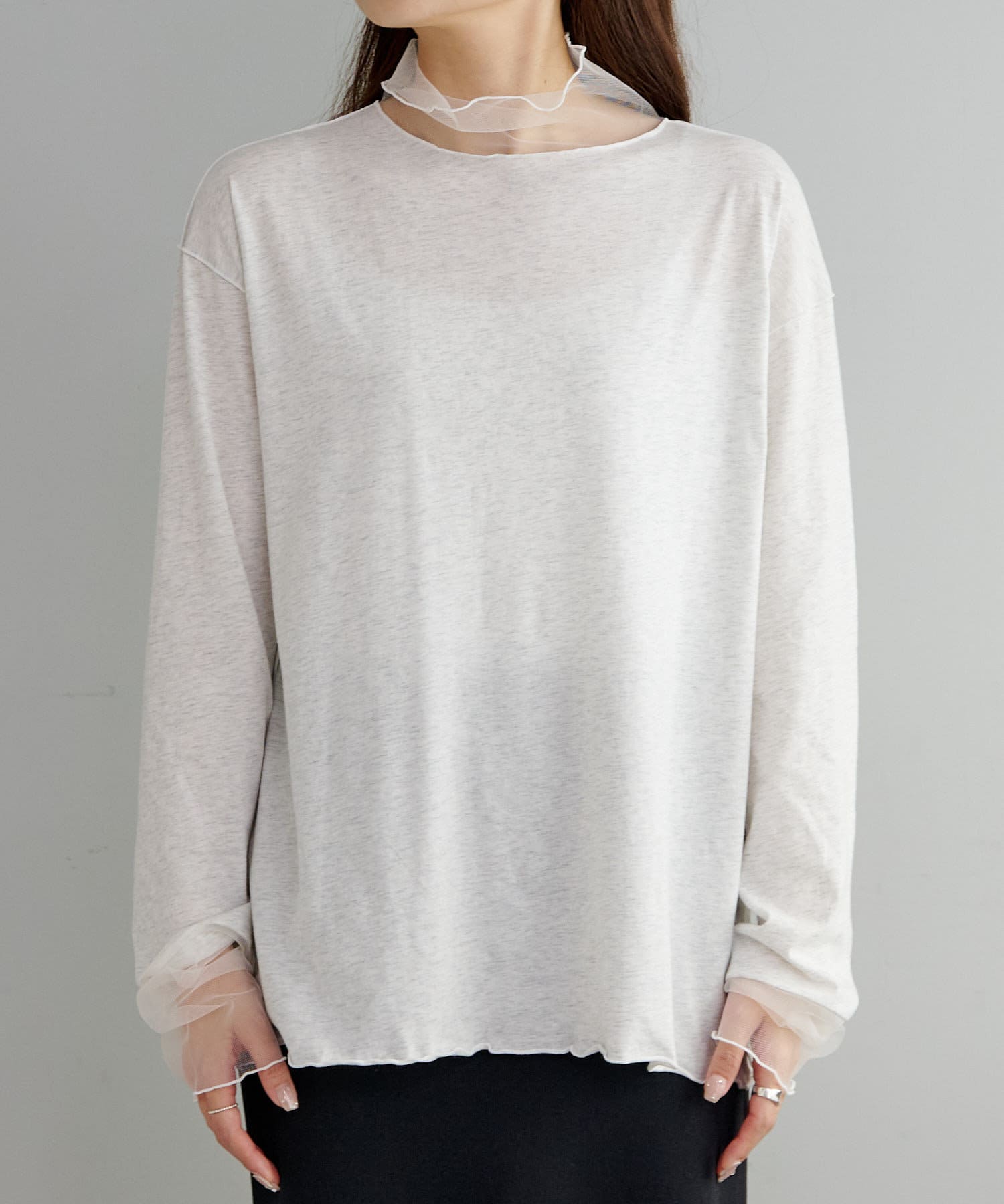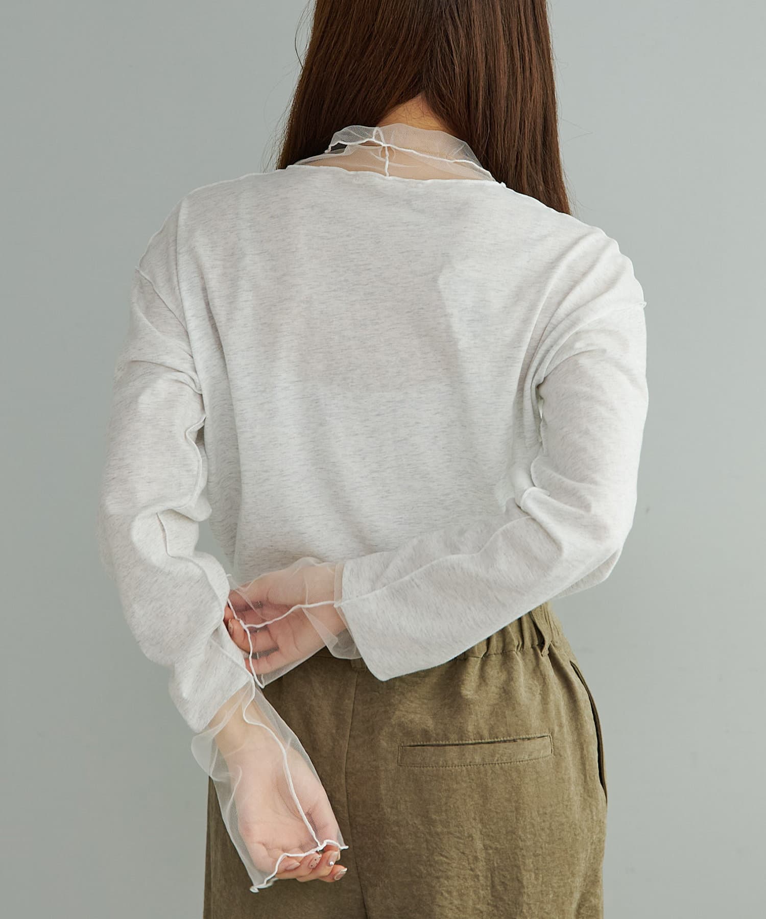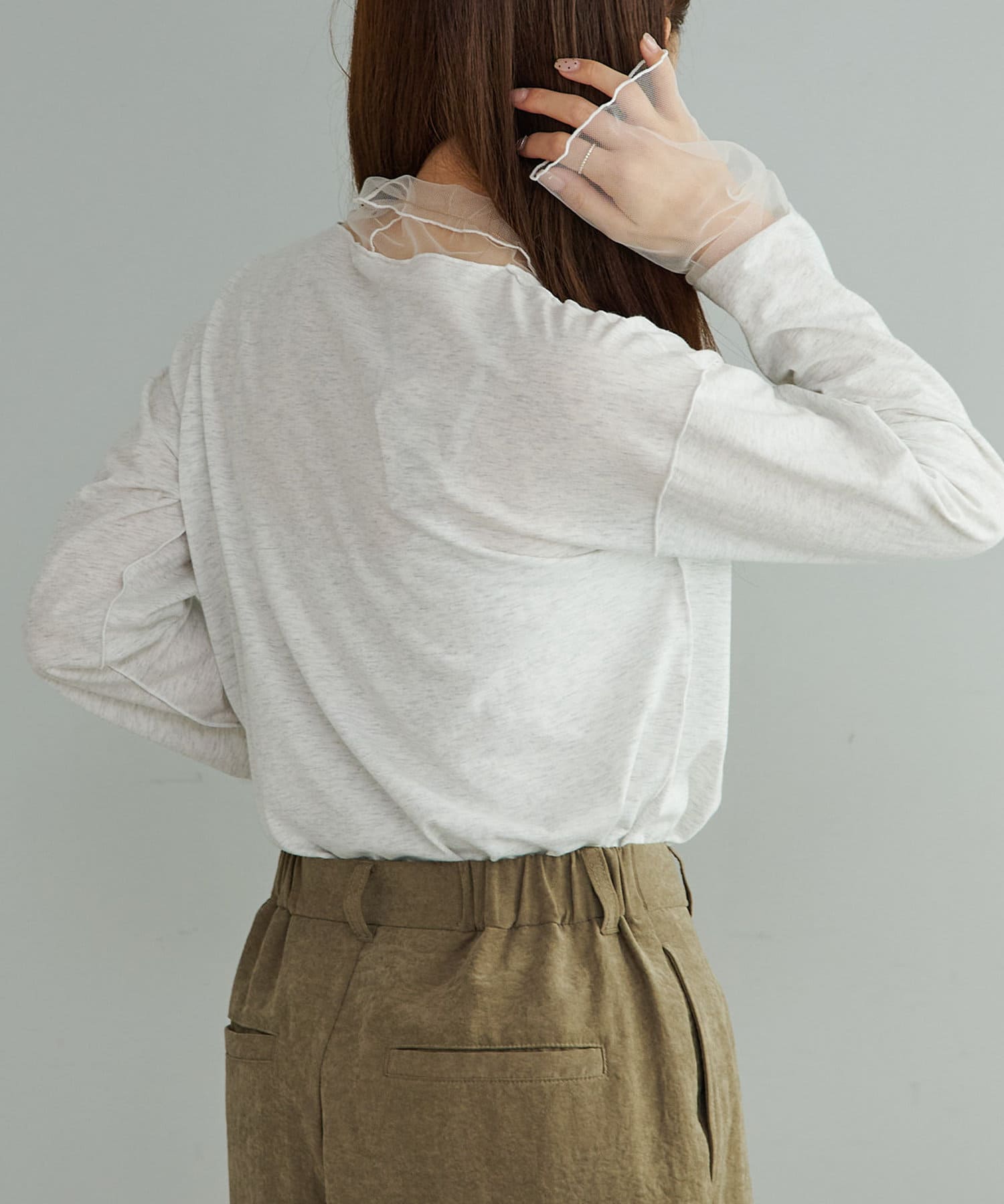首元・袖は透け感のあるチュール素材。ボディ部分は滑らかなカットソー素材。