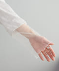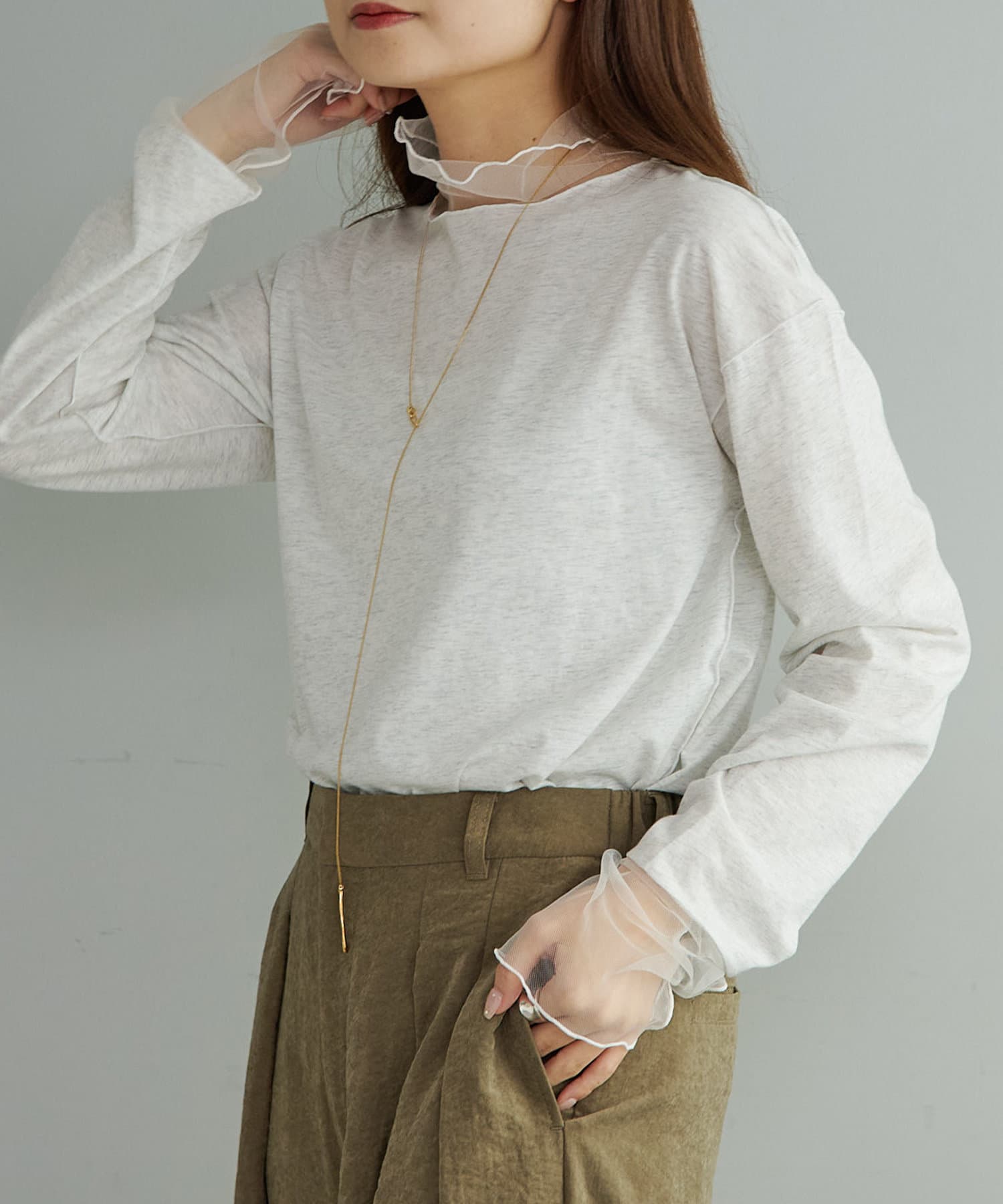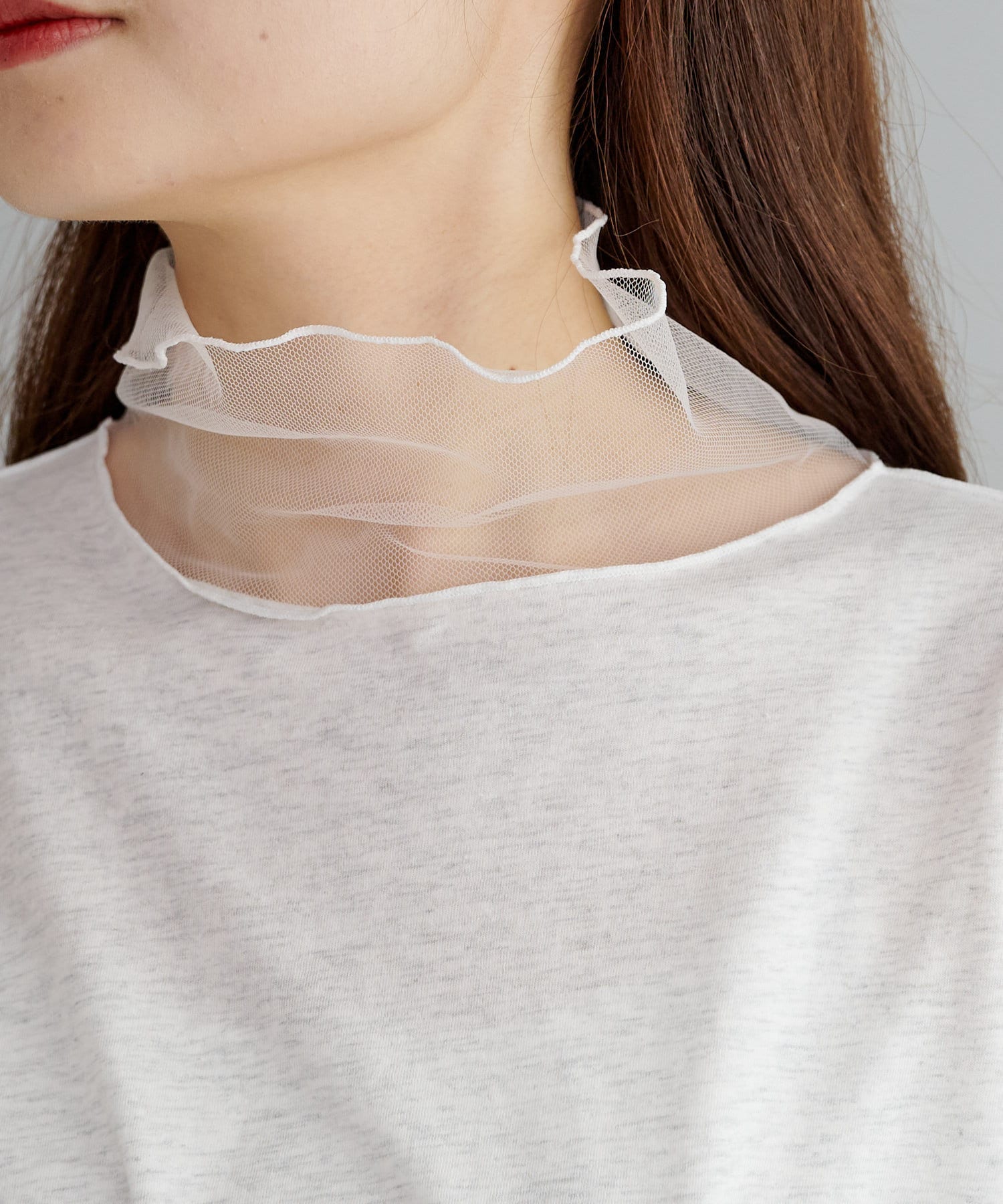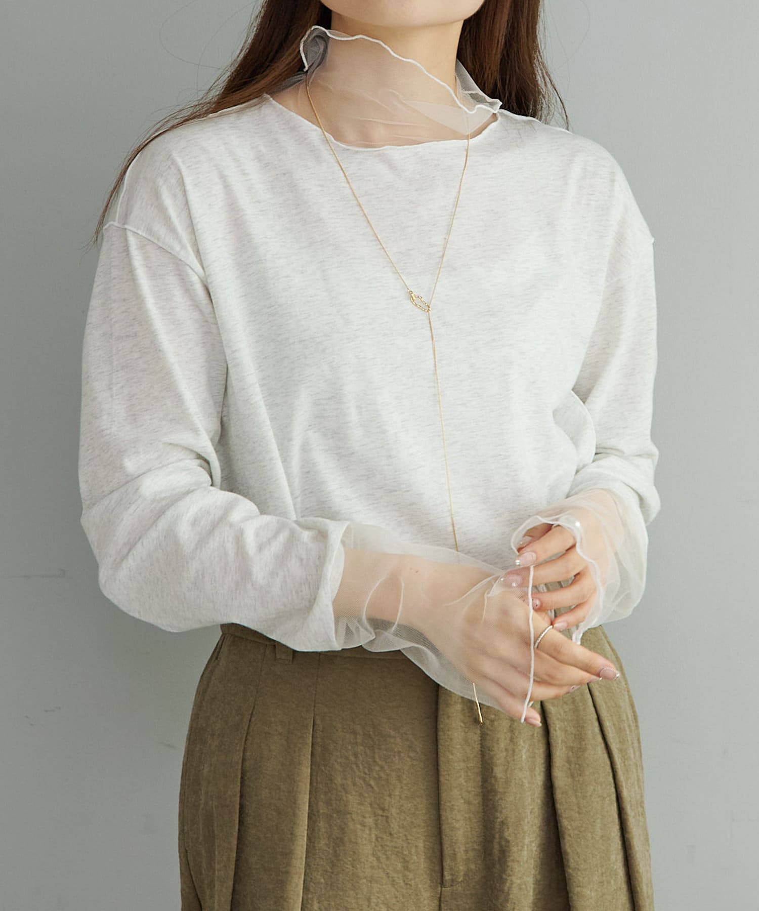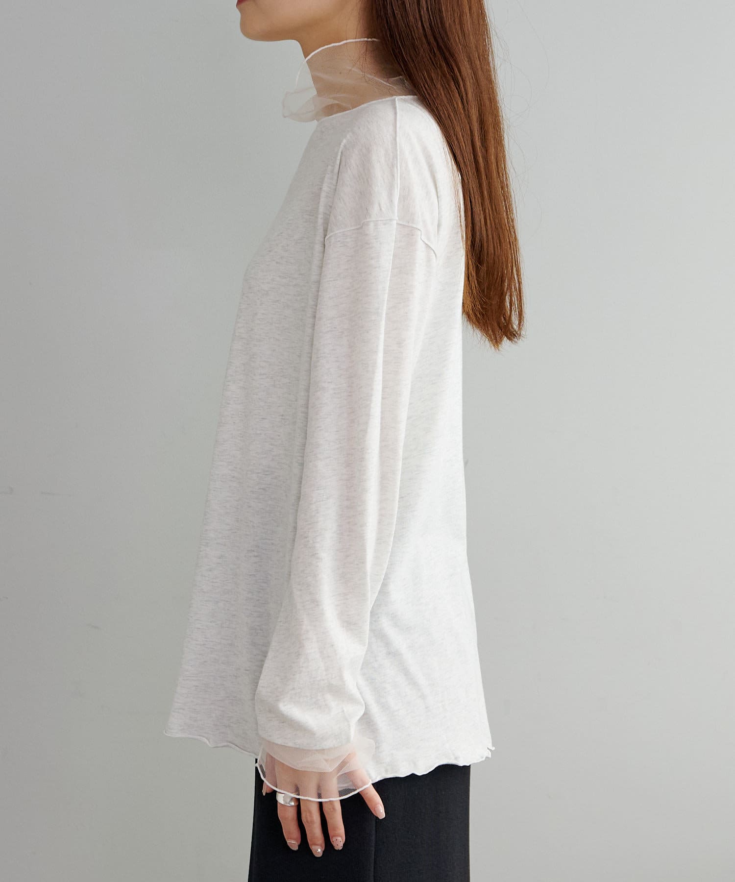 首元・袖は透け感のあるチュール素材。ボディ部分は滑らかなカットソー素材。