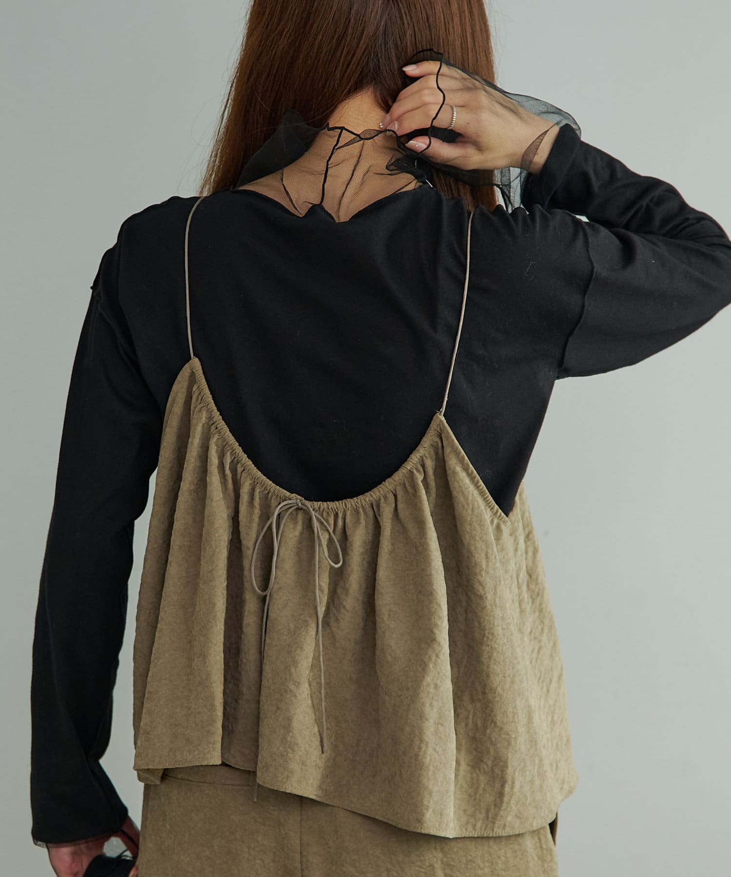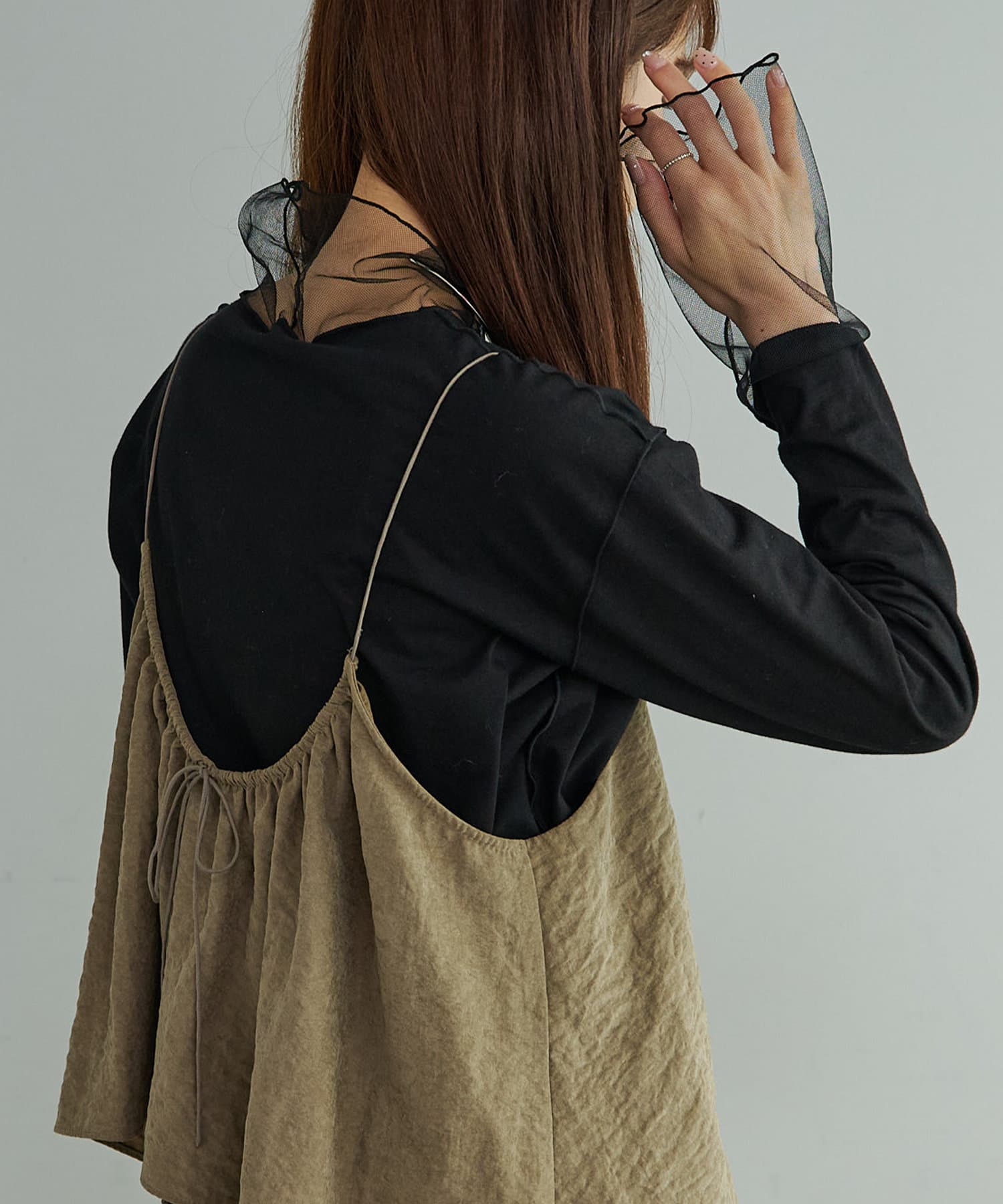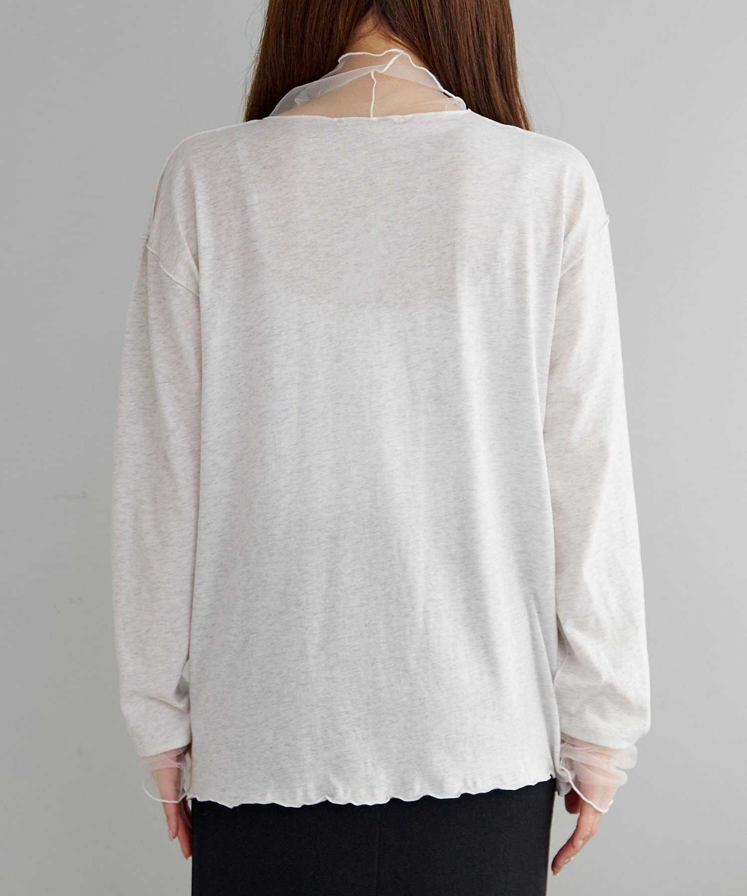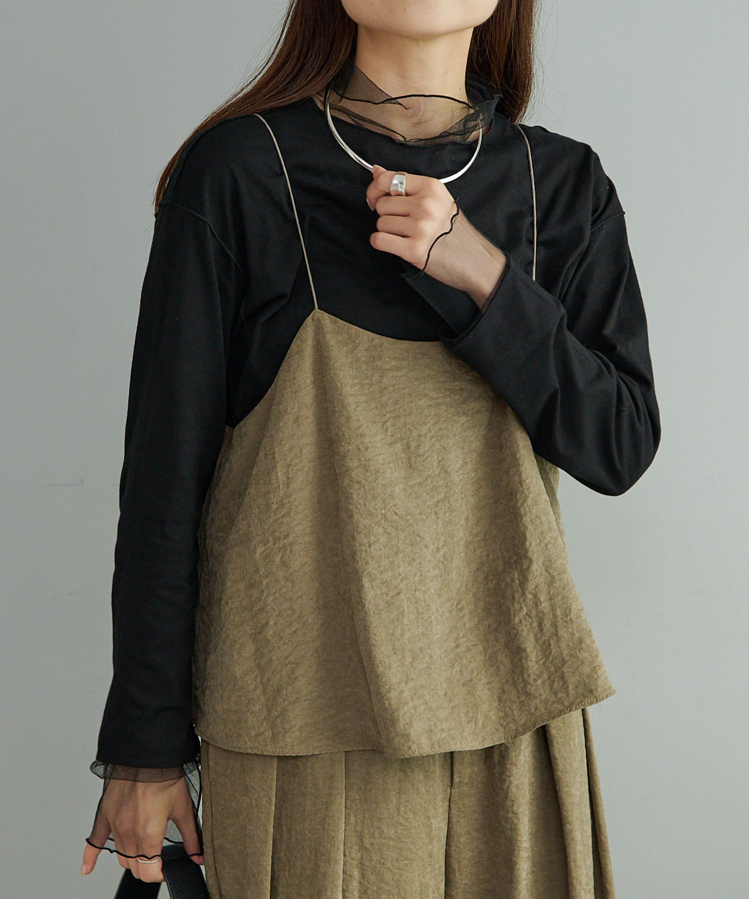 カットソー素材のボディ部分に、チュール素材を施したインナートップス。