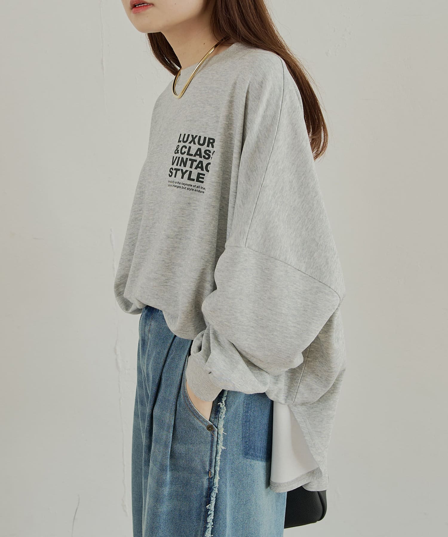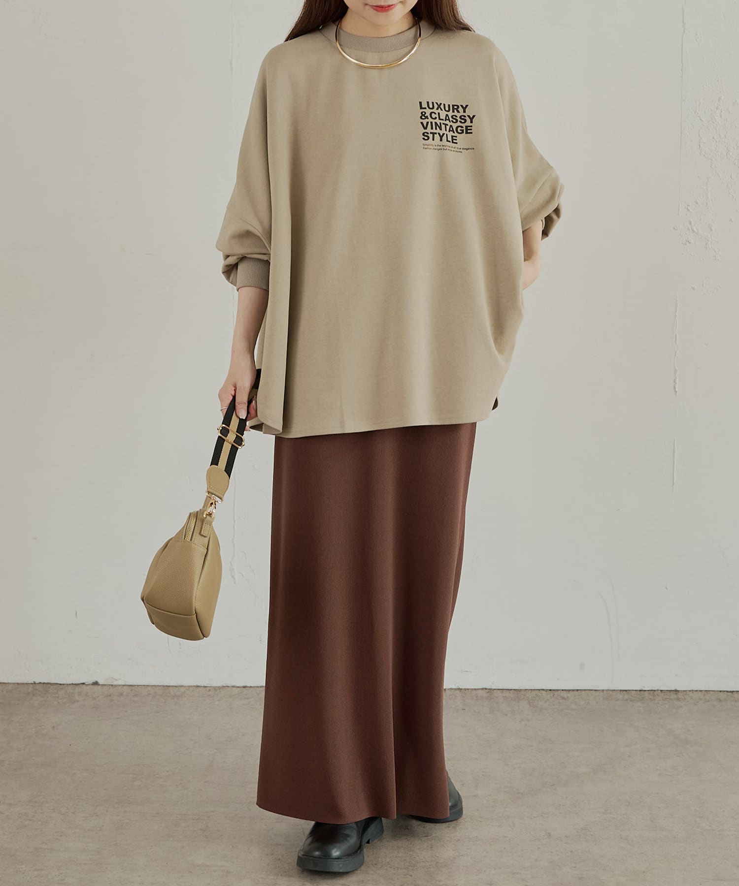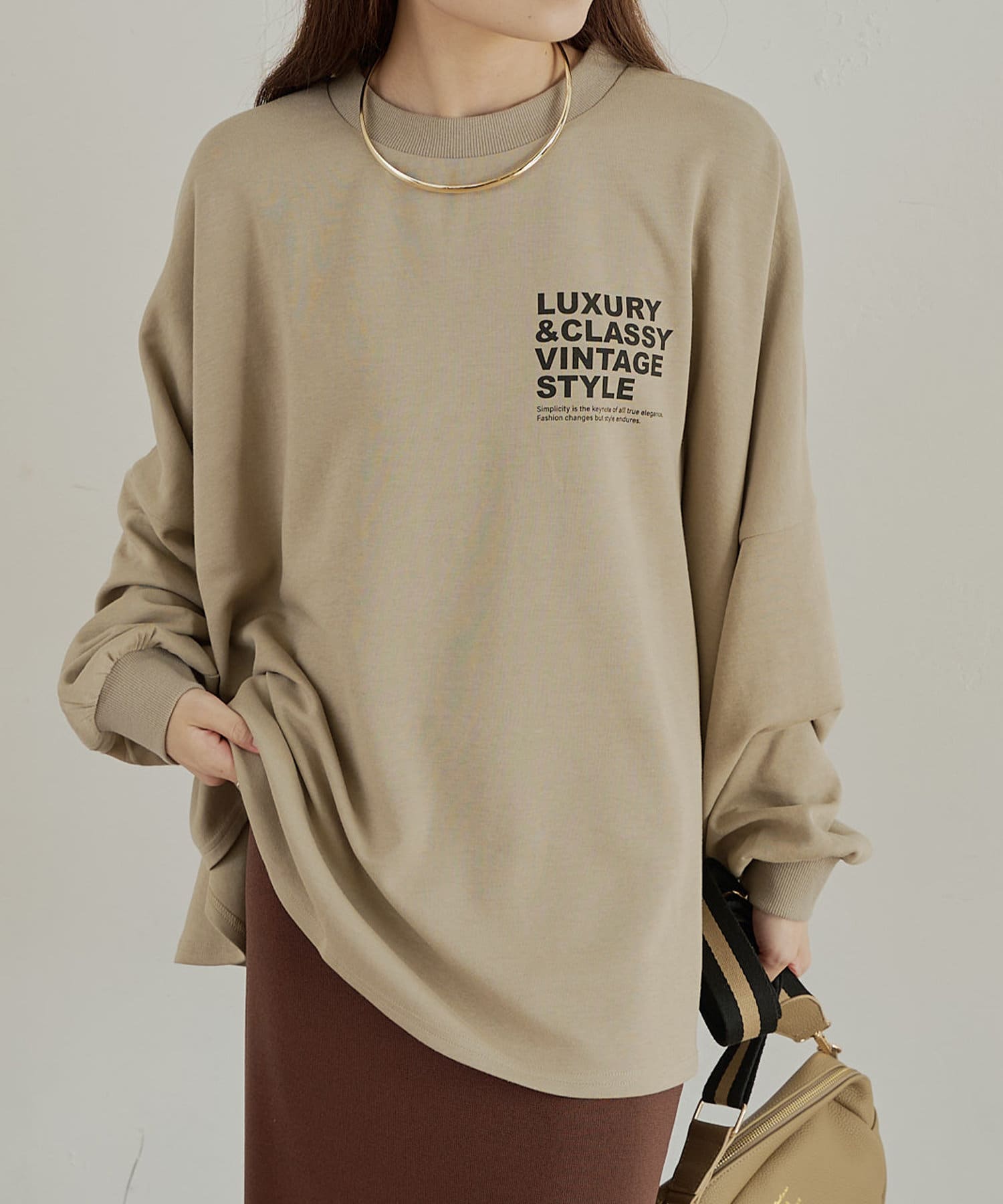 アウトスタイルもインスタイルも決まるチュニック丈は、体型カバーも叶います。