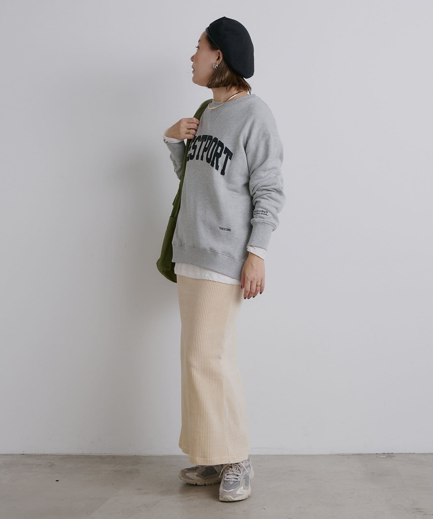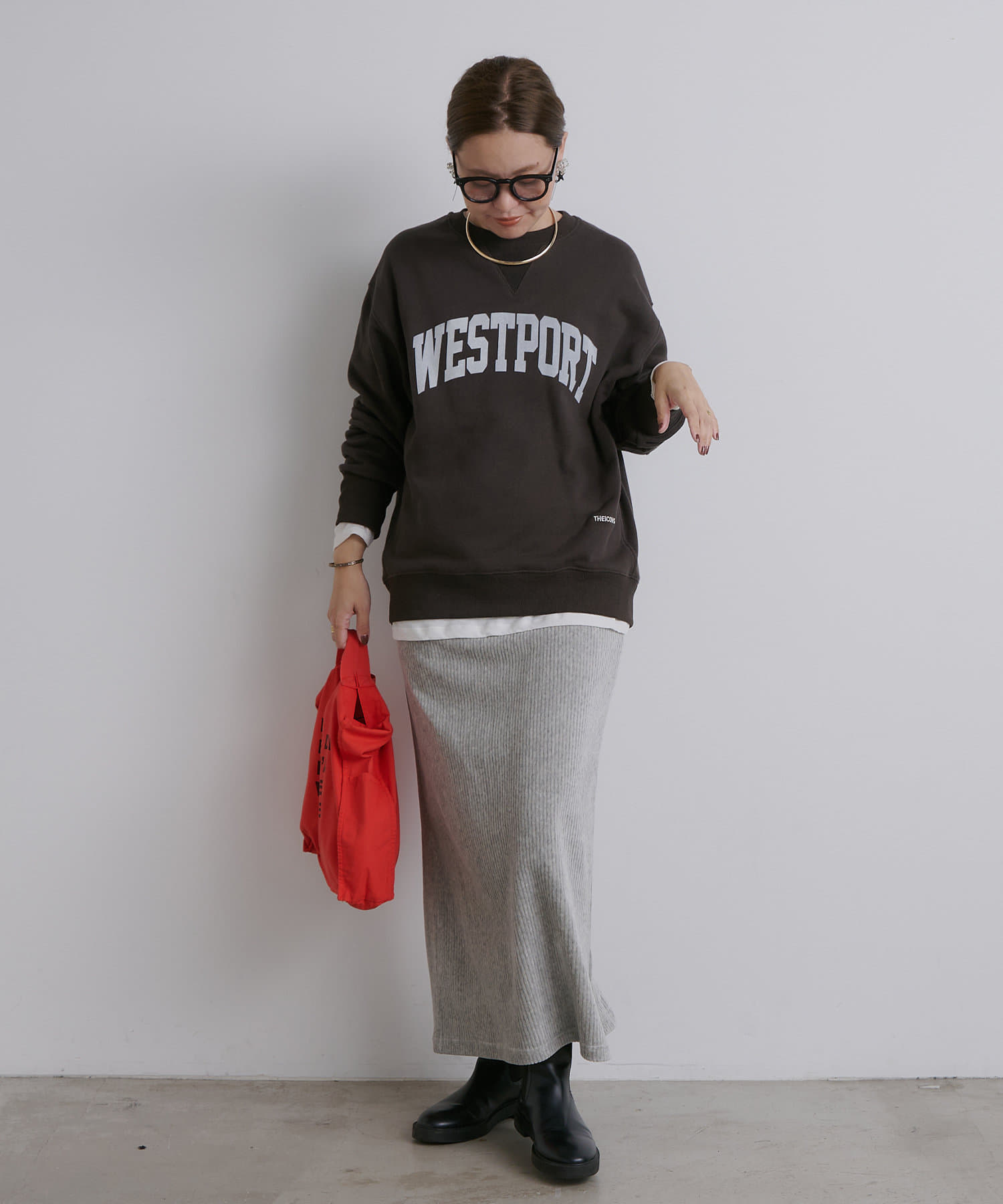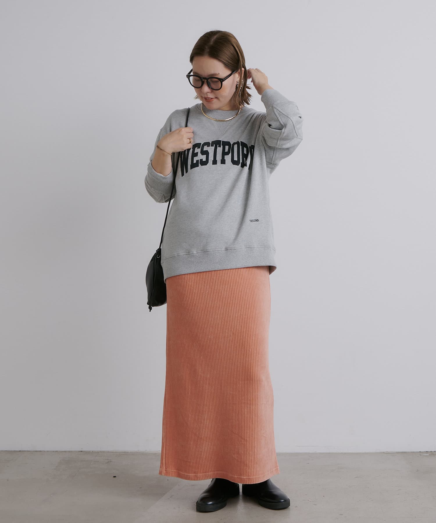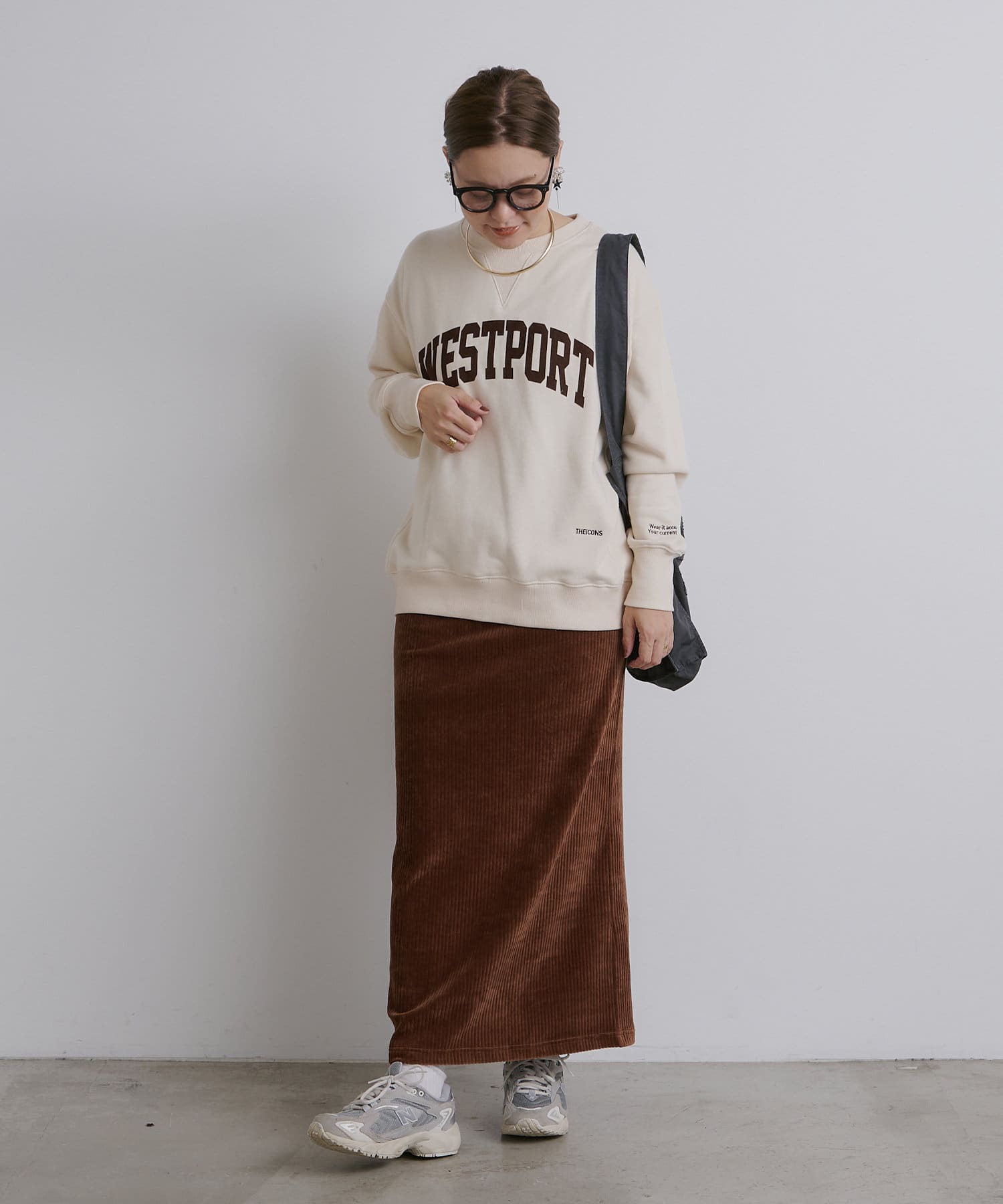 1枚で存在感を放つロゴスウェットはデニムやスラックス、ナロースカートにサッと合わせるだけで
