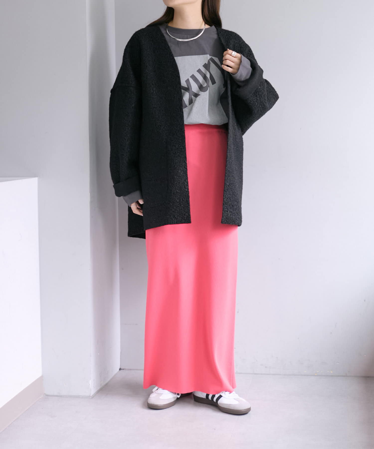 カジュアルなデニムやスラックスパンツ、レディライクなナロースカートスカートやワンピースなど、幅広いコーディネートにハマる一着。