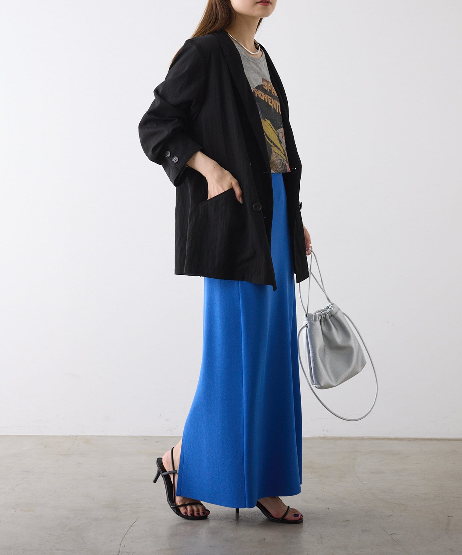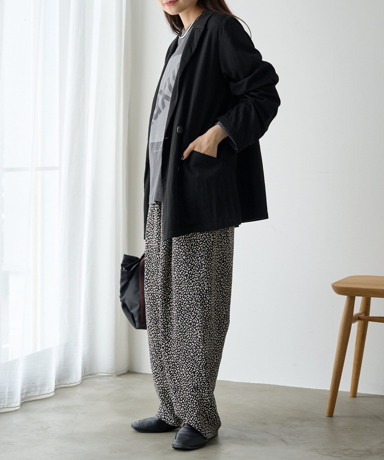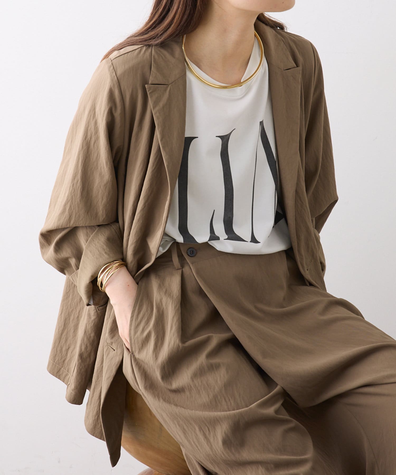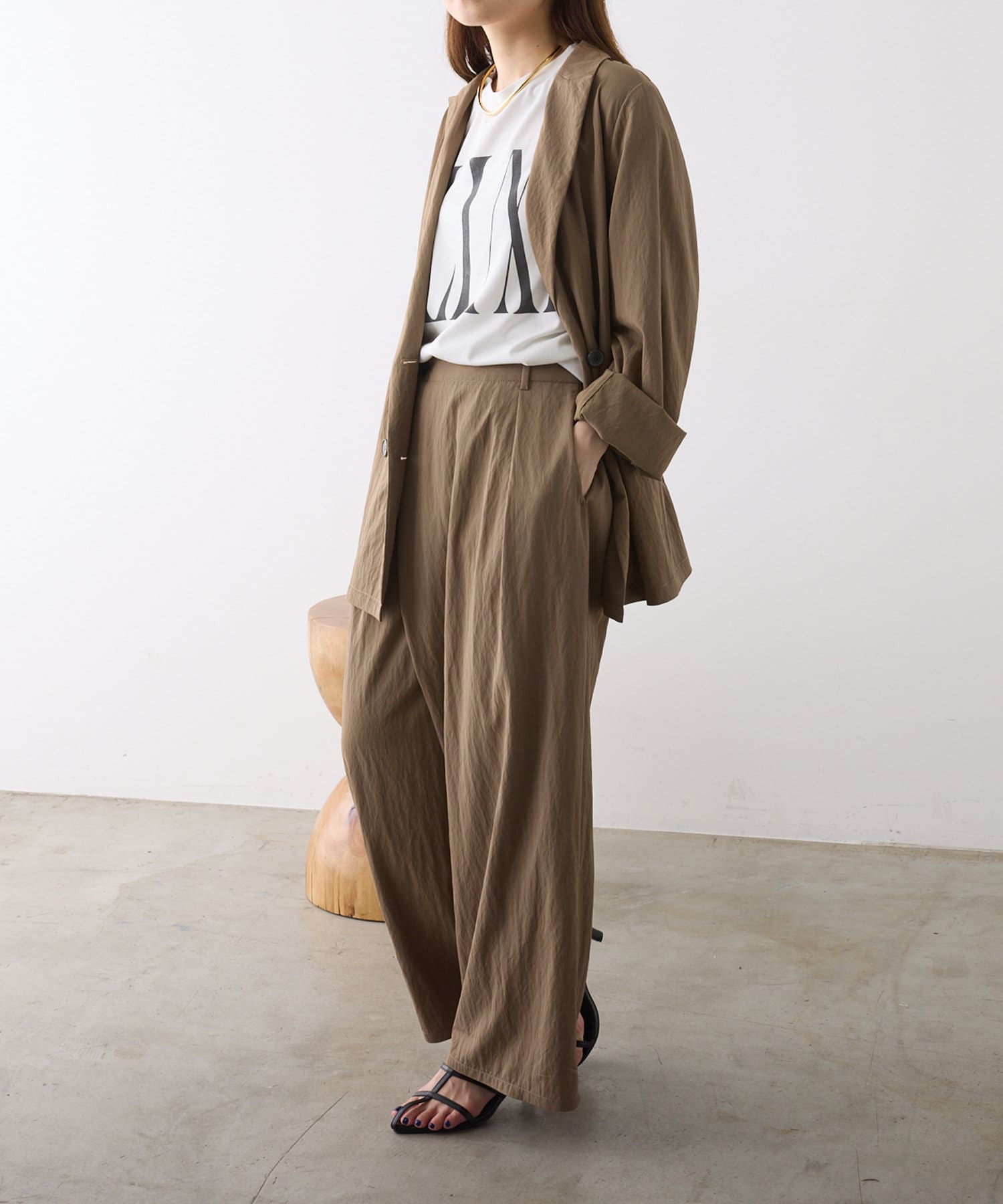 同素材のワイドパンツと合わせたセットアップでのスタイリングもおススメです。