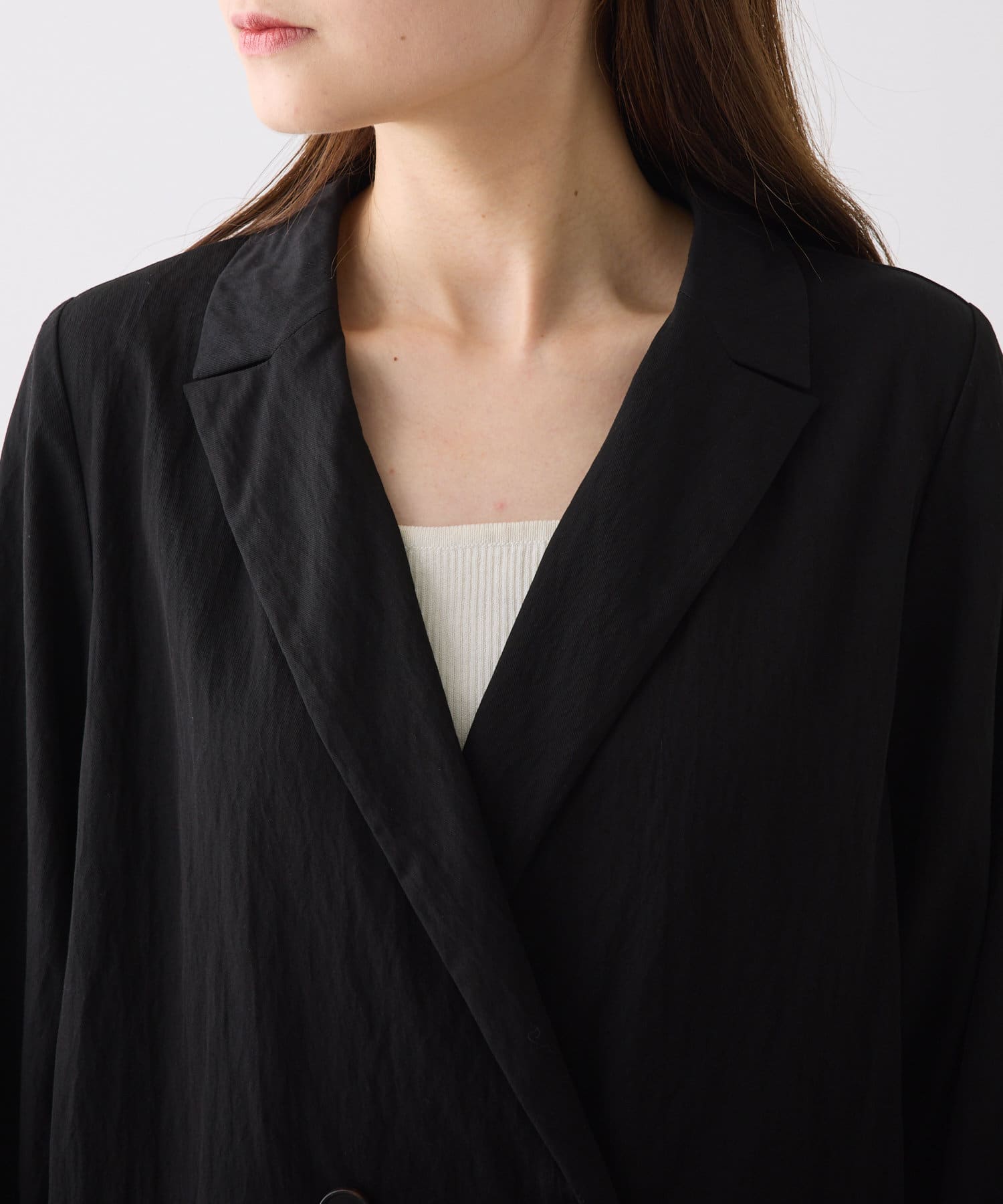 長め丈でシャープな印象のダブルテーラードジャケット。