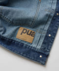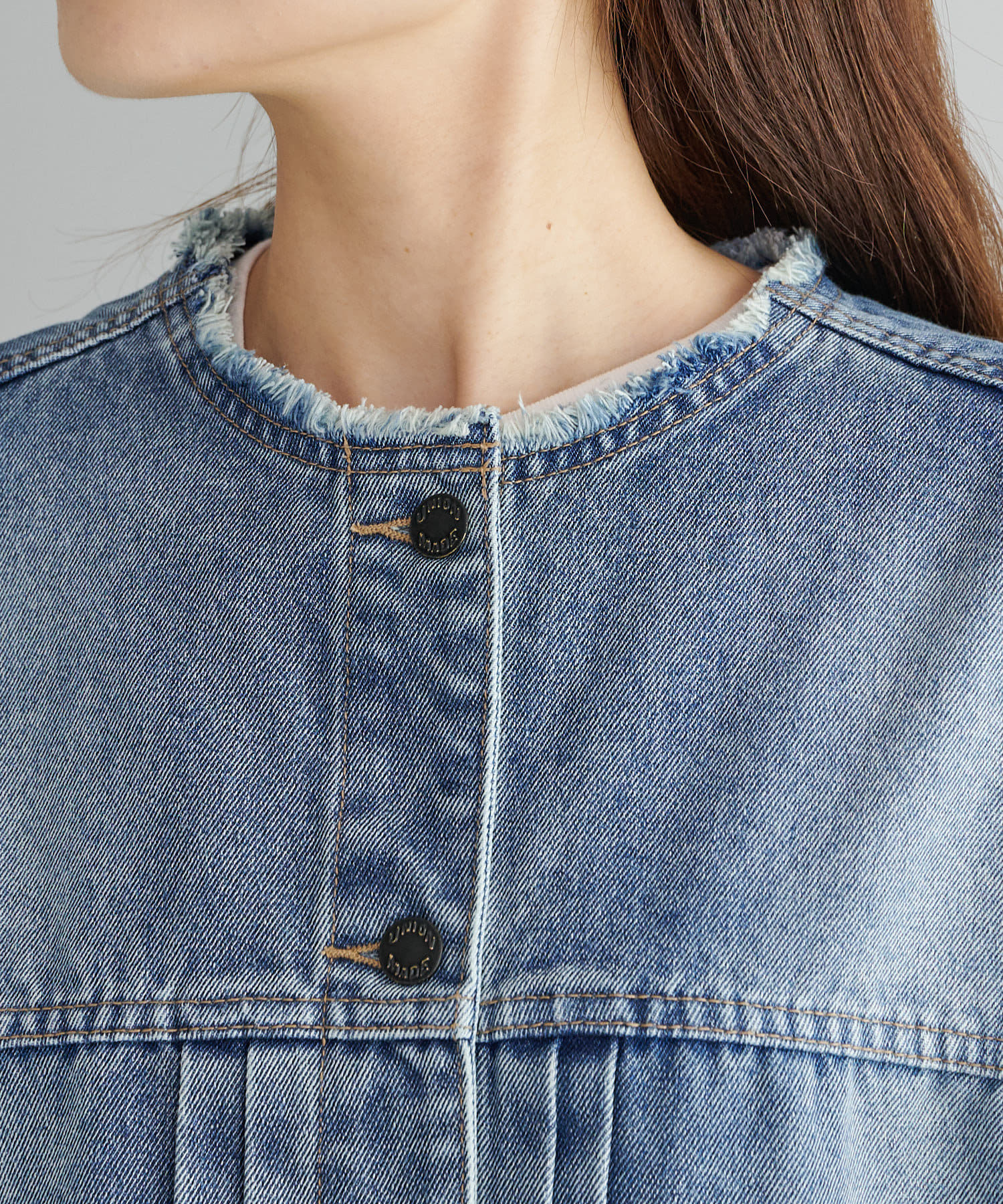 襟ぐりのフリンジや左右ポケット上にヴィンテージ感を演出する加工を施しています。