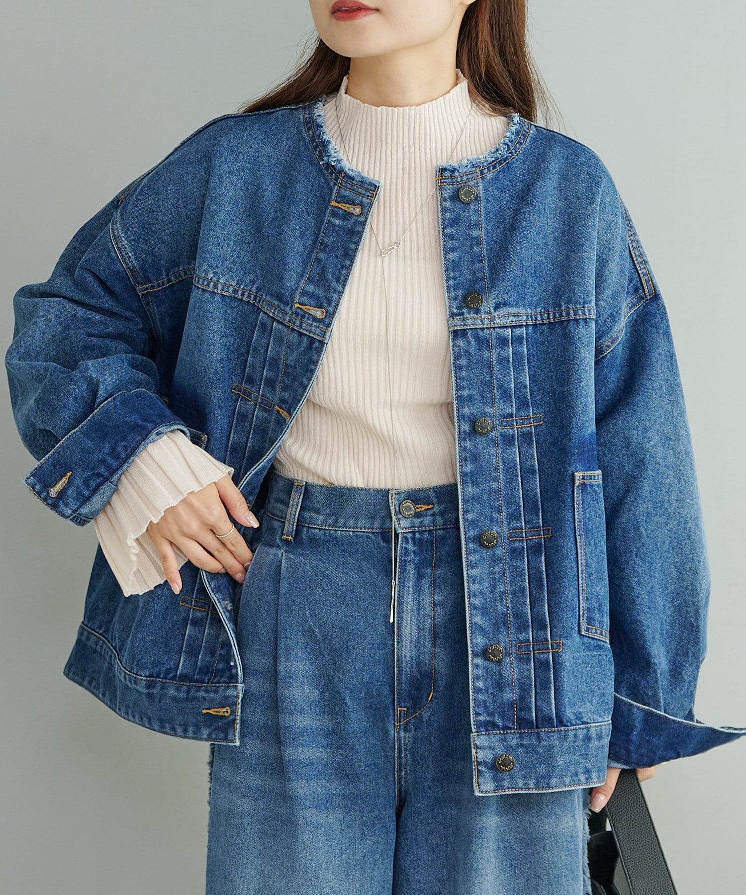 軽く羽織るだけで、こなれた大人カジュアルスタイルに仕上がるデザインのデニムジャケット。