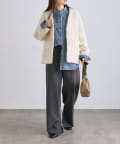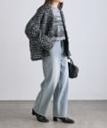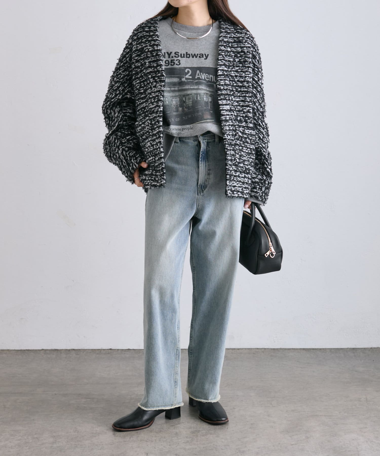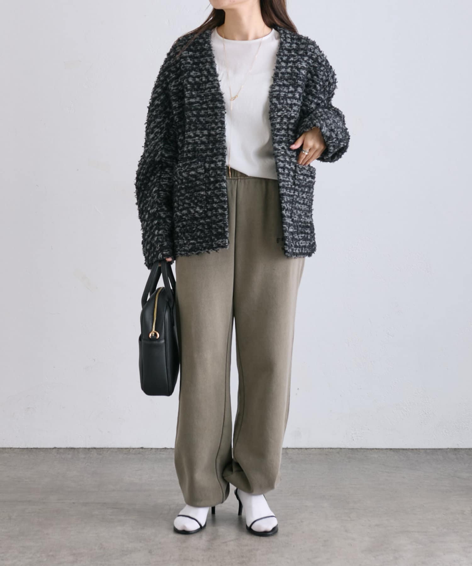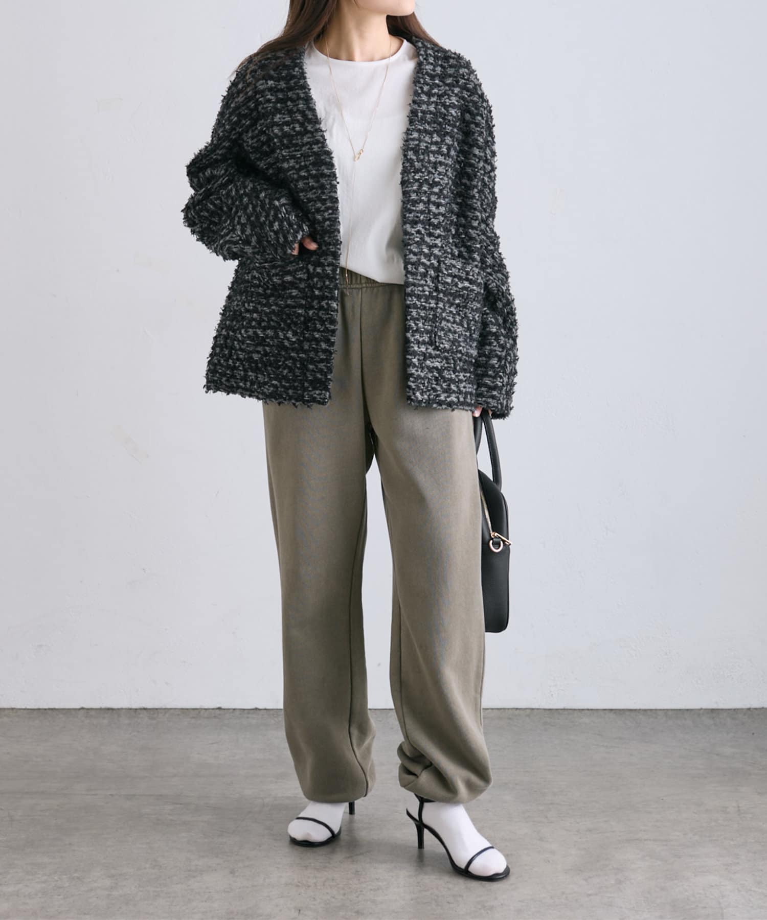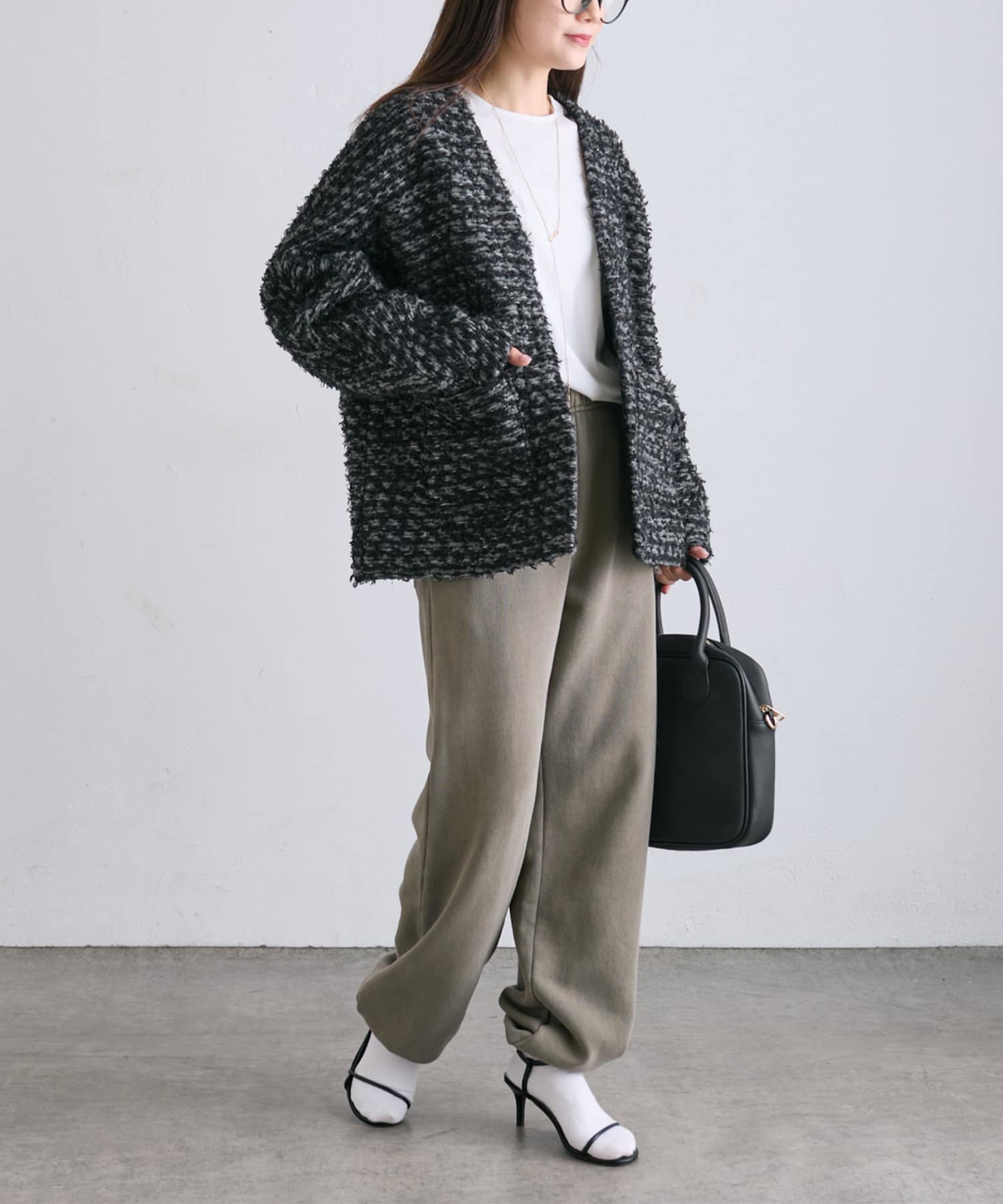 きれいめに仕上げてもサマになるツイードライクニットジャケット。