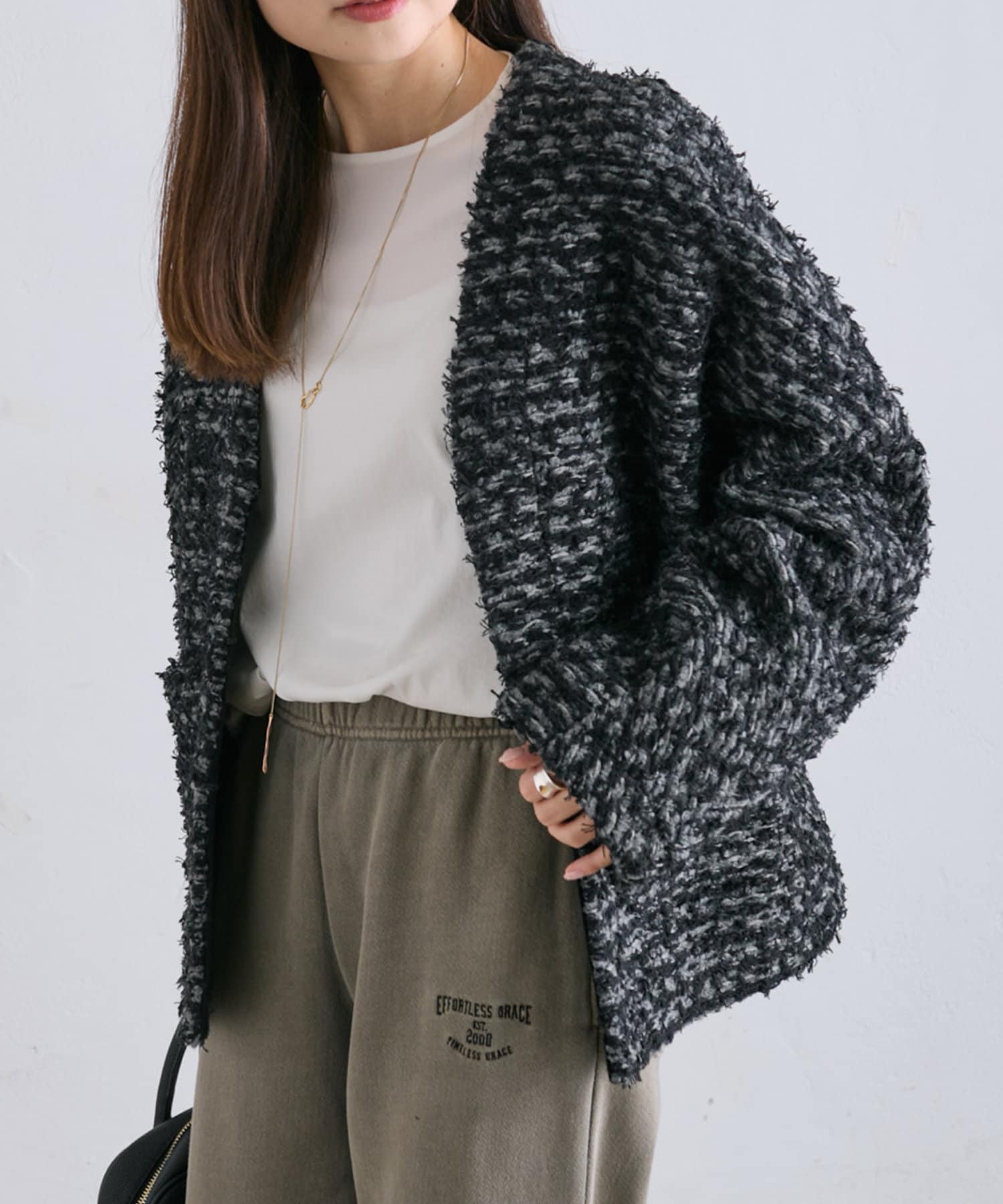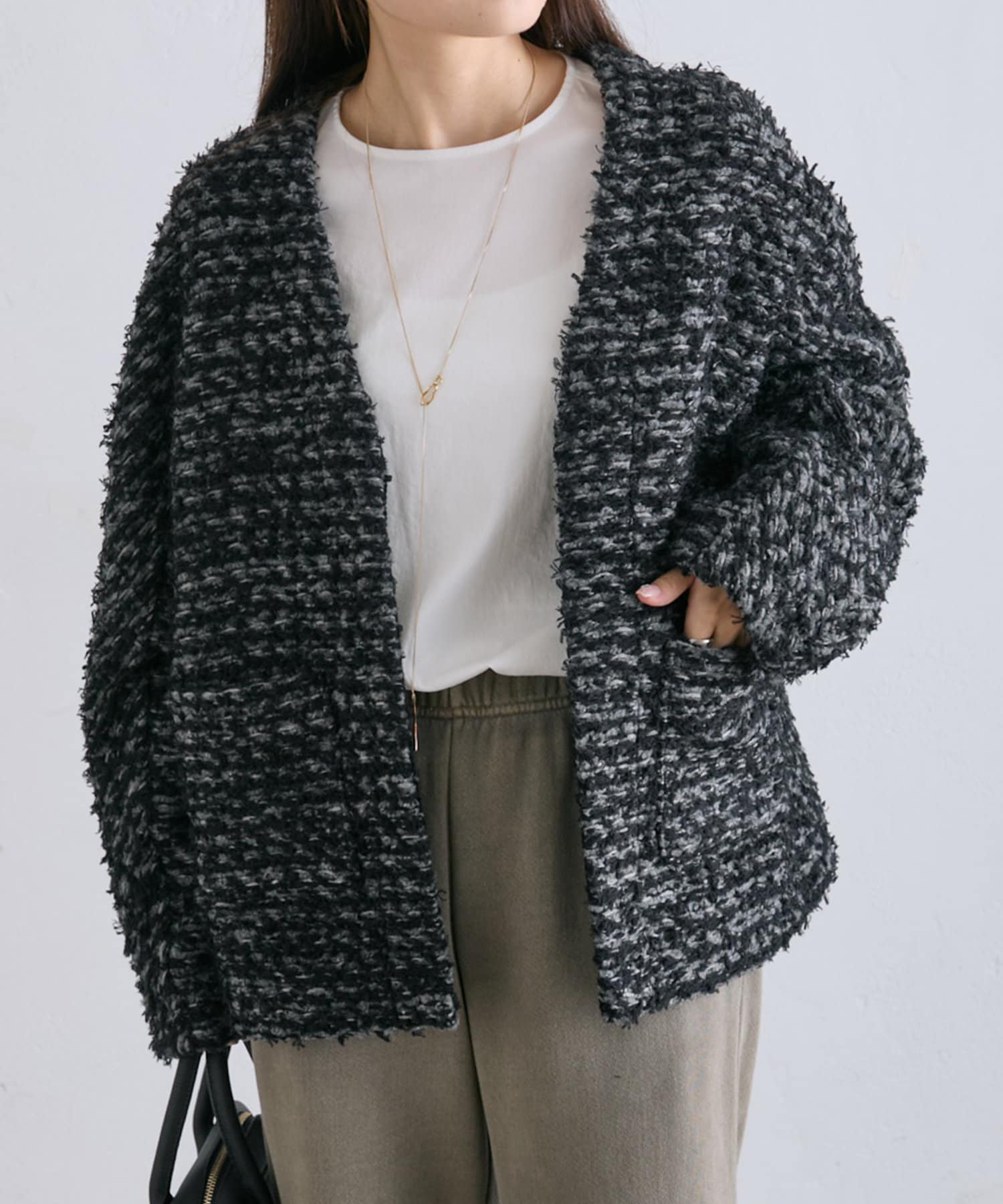 ◇綺麗見えと楽チン着心地が両立!クラシカルなツイードニットジャケット◇