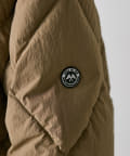 裾サイドとフード部分にはリサイクルダウンを模したデザインロゴプリントと、