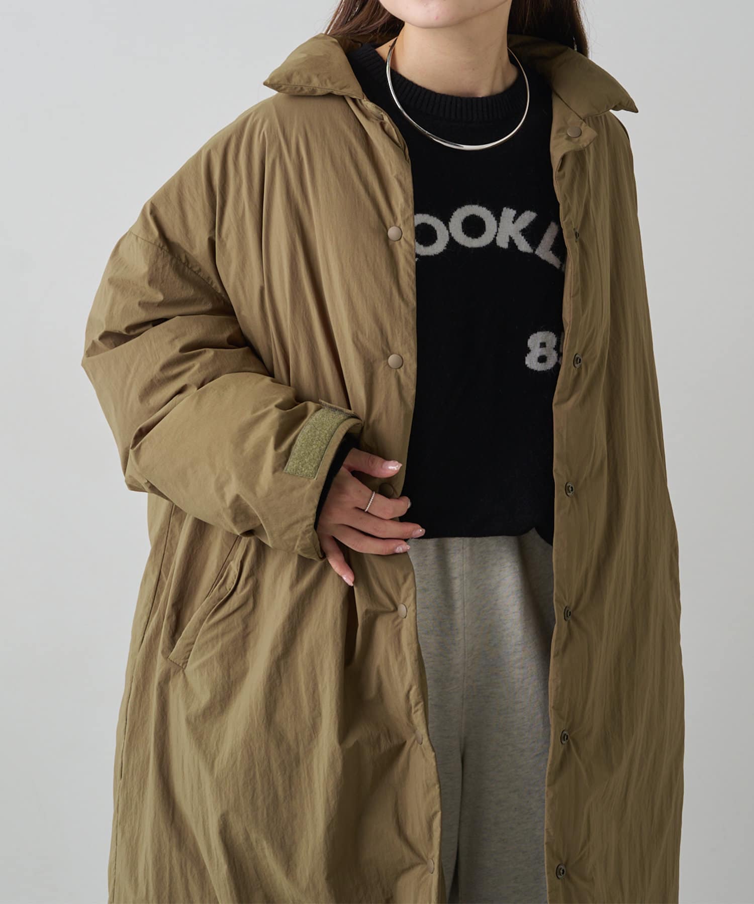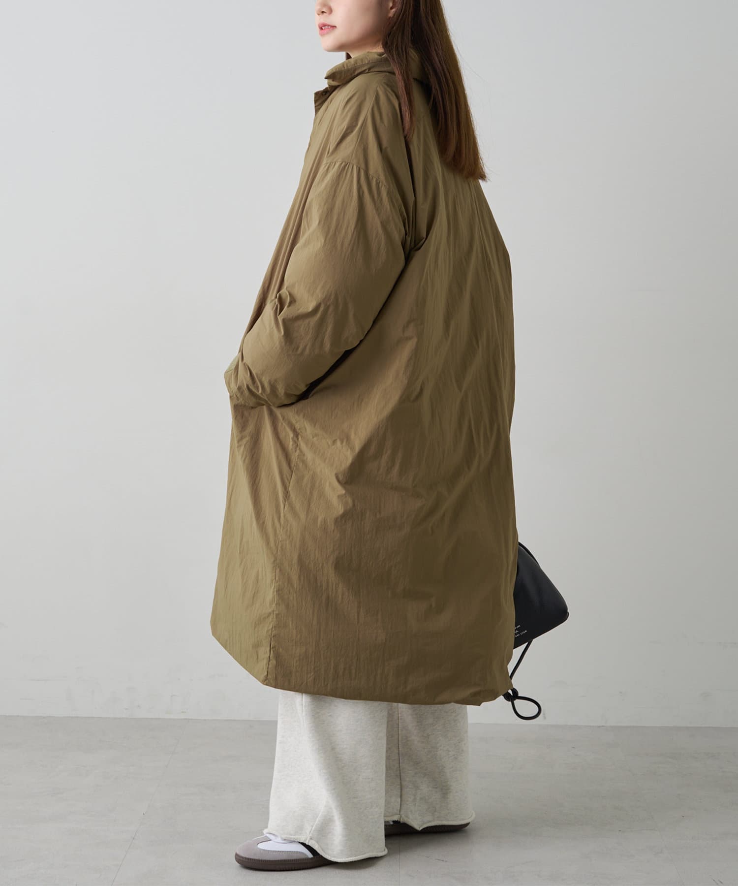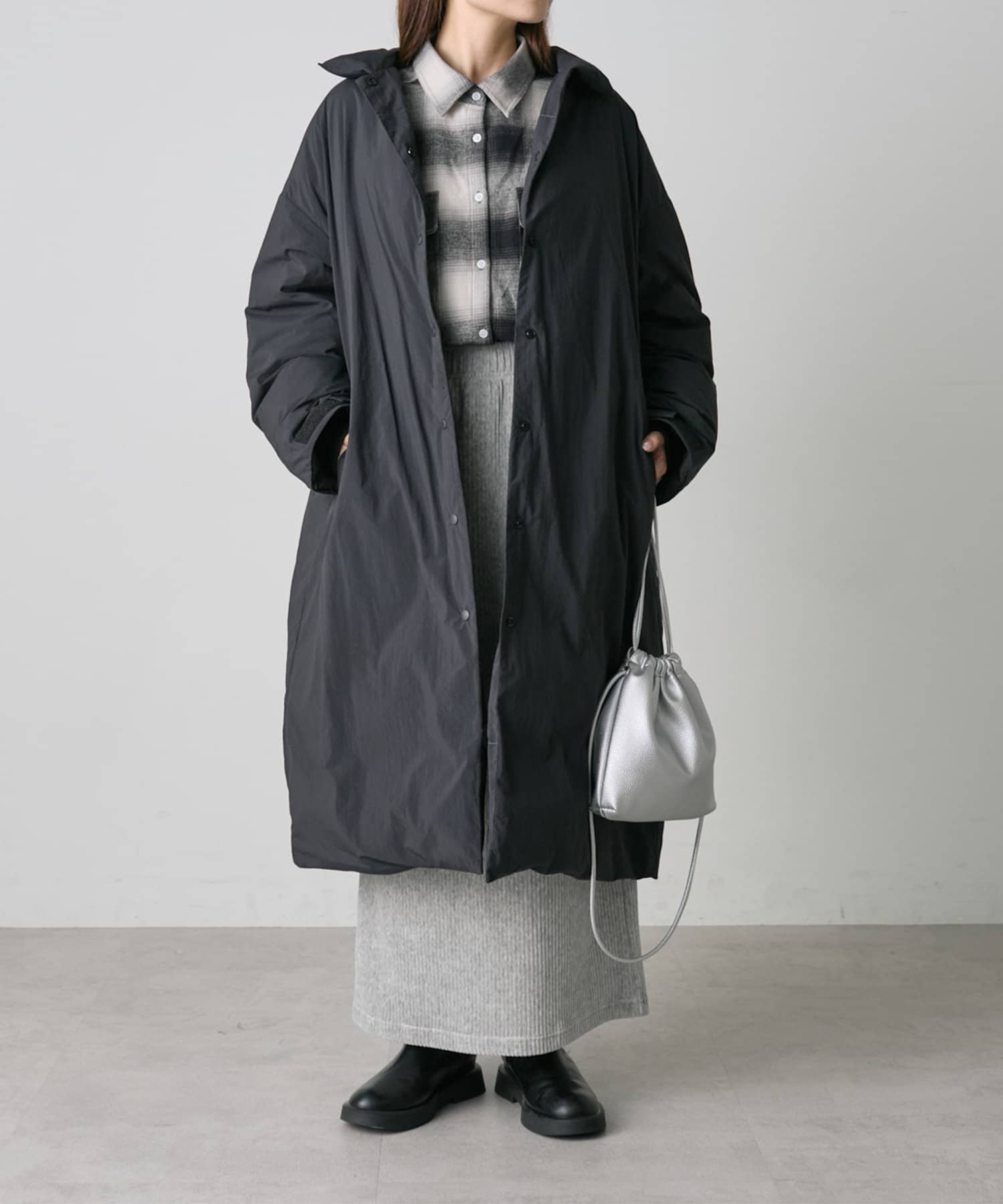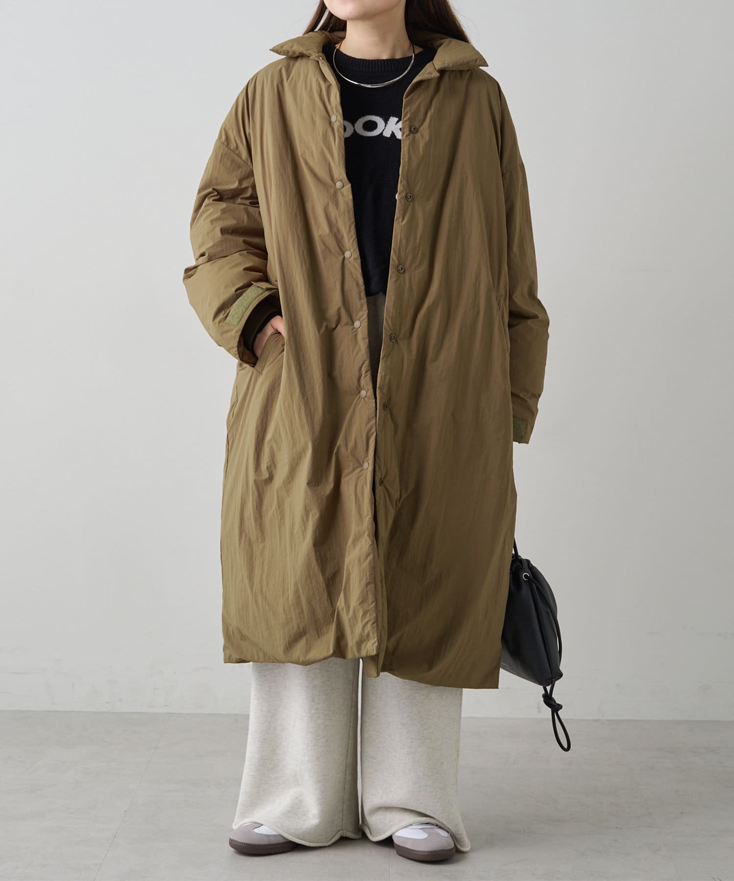 中綿のふんわりとした雰囲気が、冬らしいコーディネートにぴったりなロングコート。