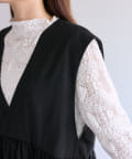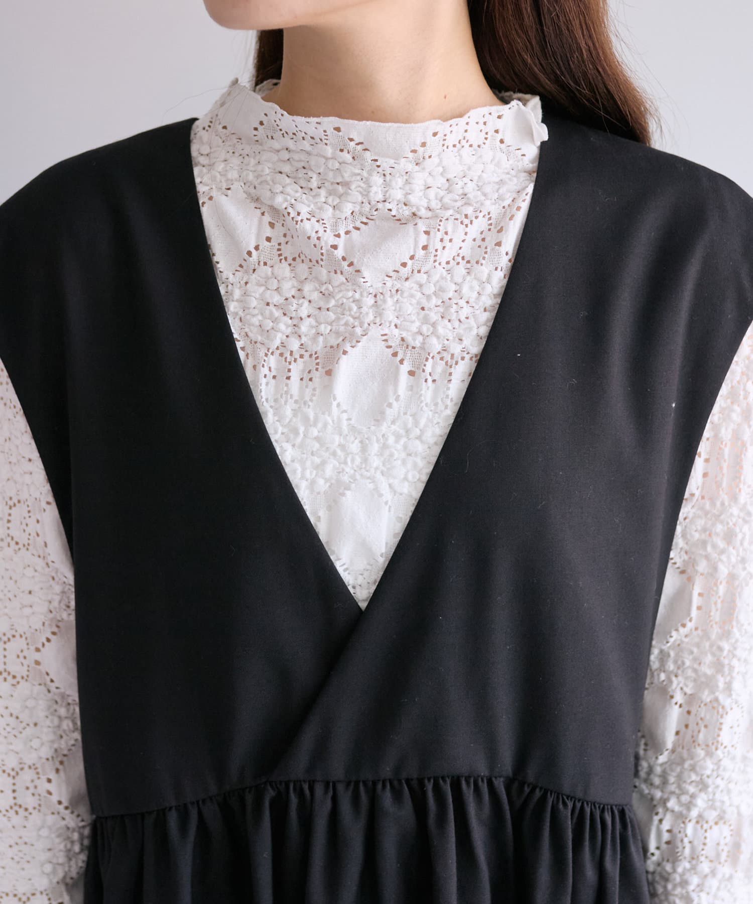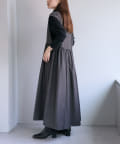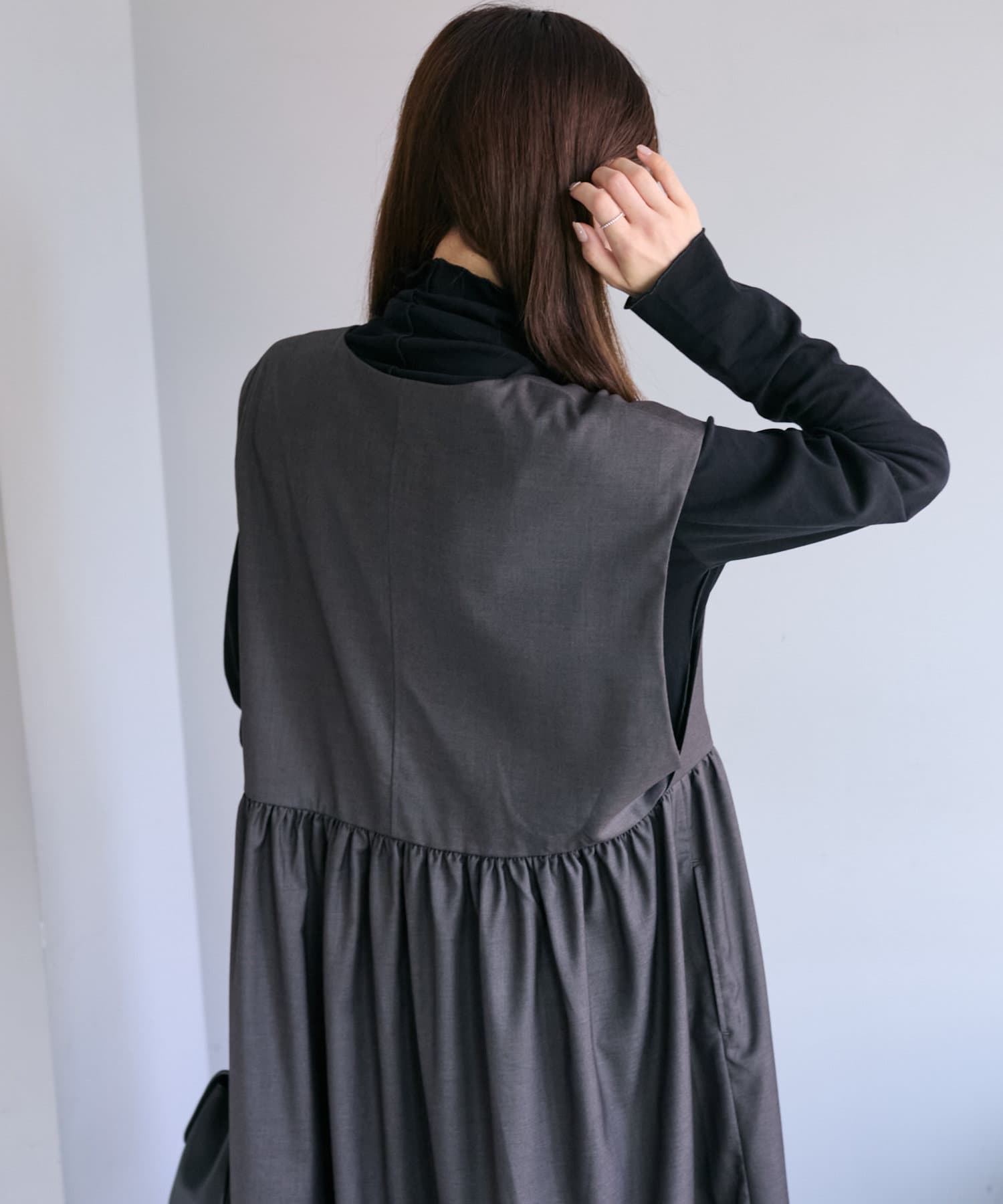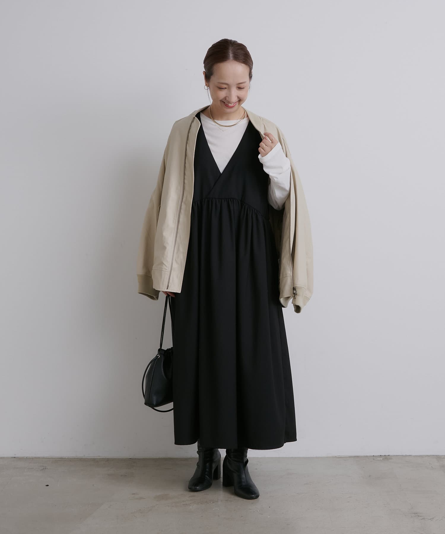 ふわりとウエストからギャザーで広がるシルエットに深Vネックのデザインを添えたことで、