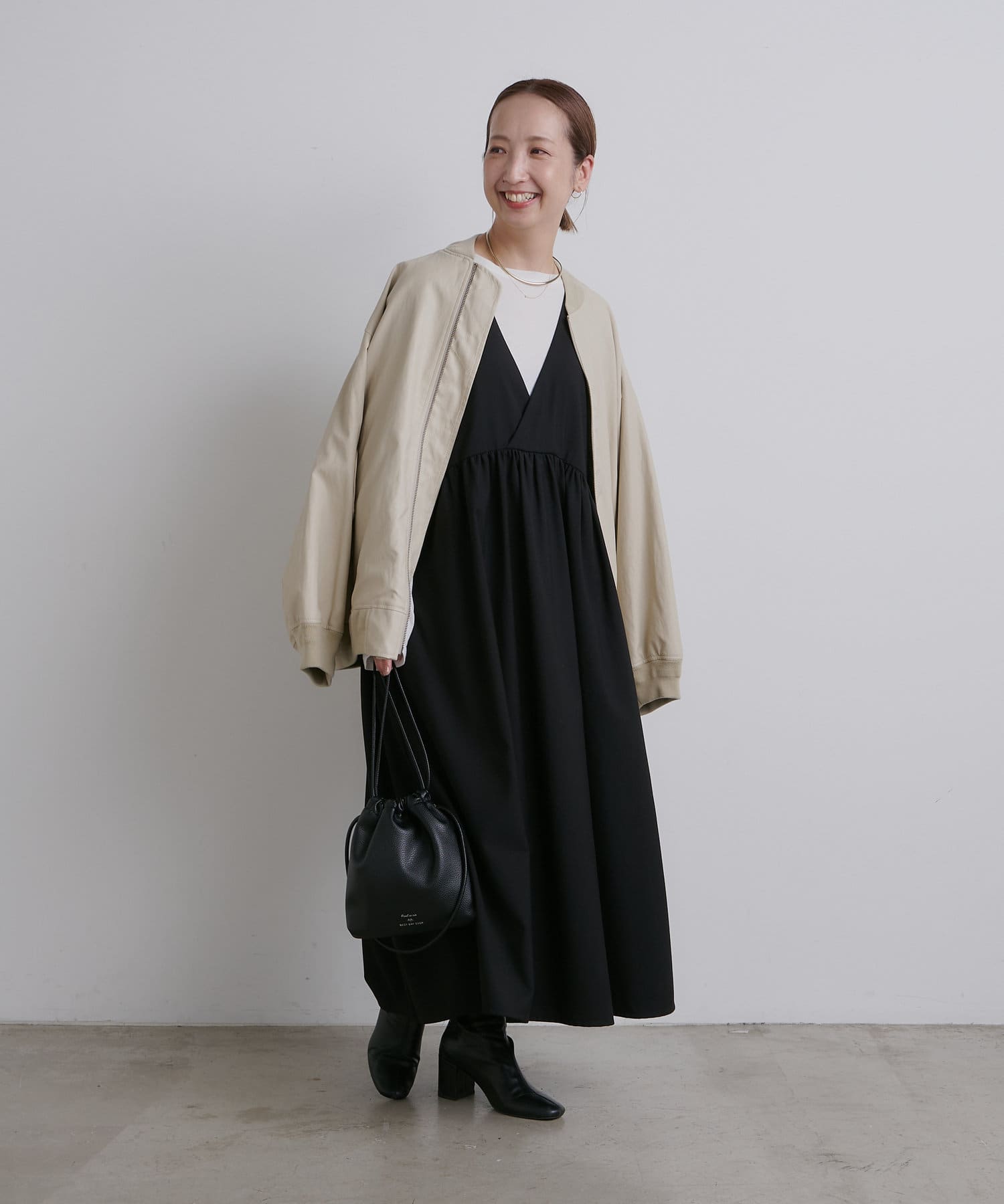 サイズ感:胸周り・肩幅のゆとりがあり、ロンTやブラウスなどを重ねやすいサイジングです。