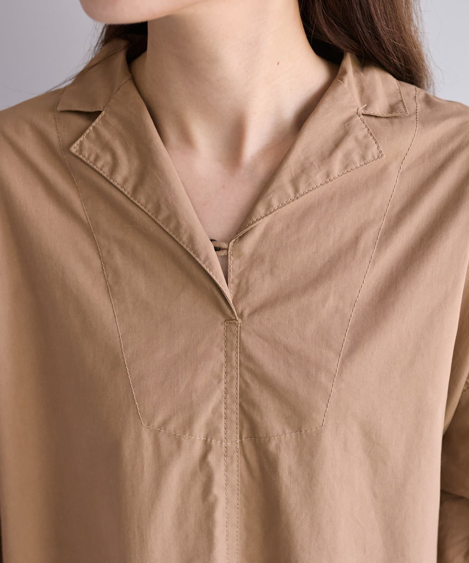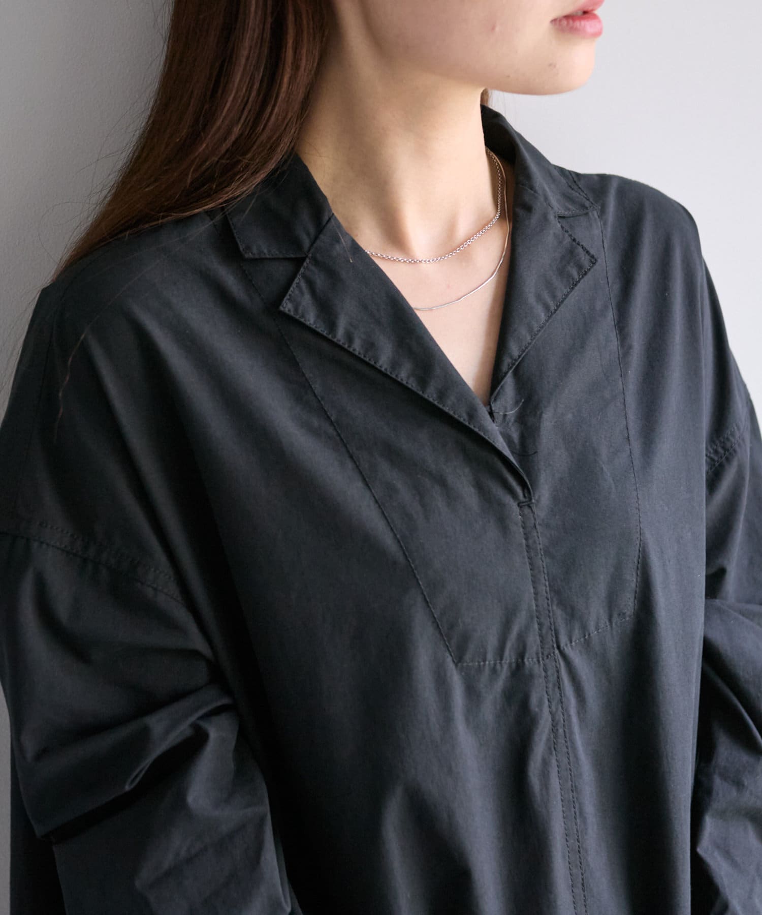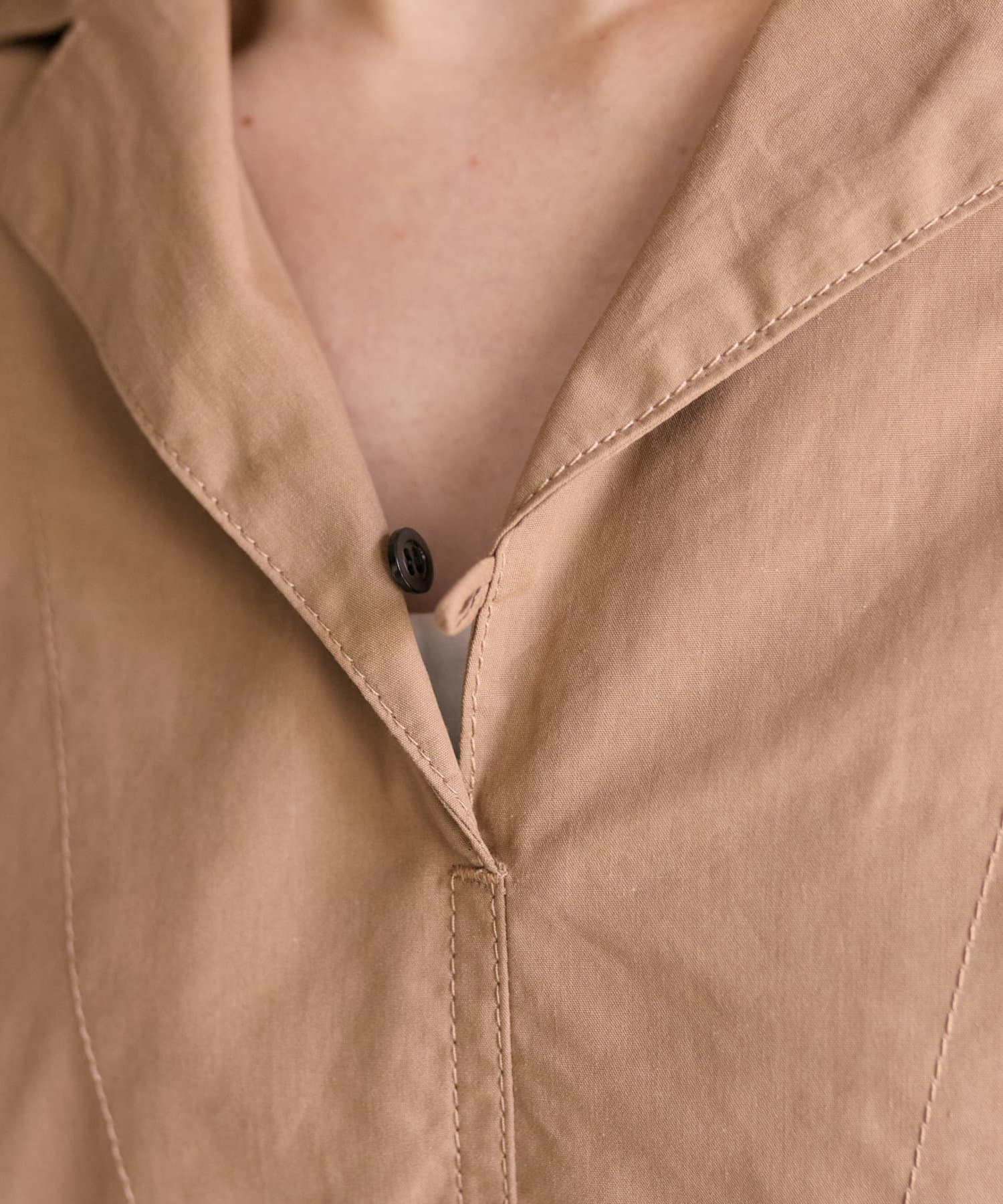 襟は抜け感のあるオープンカラーにすることで上品なカジュアルさを演出。