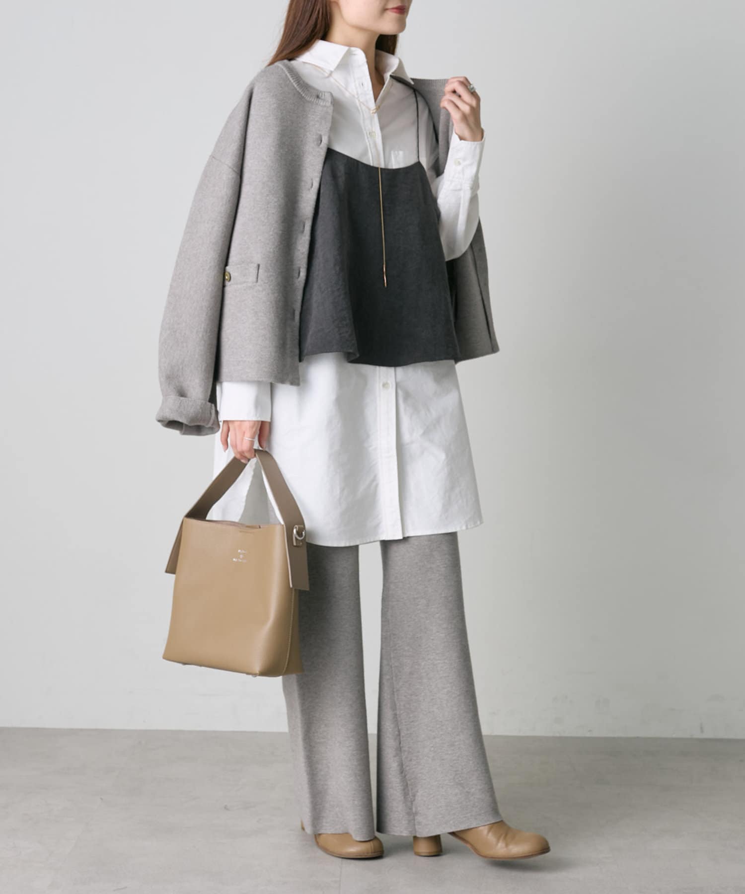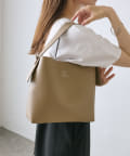 底マチがあることで、長財布や500mlのペットボトル、メイクポーチなどがすっぽりと入る収納力を備え、さらに自立する底鋲付きで実用性高く仕上げました。