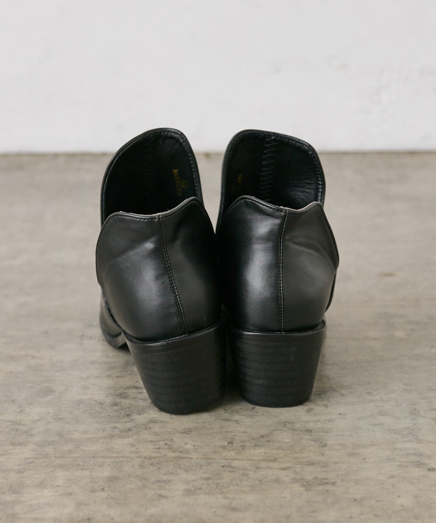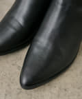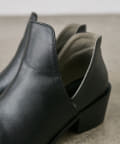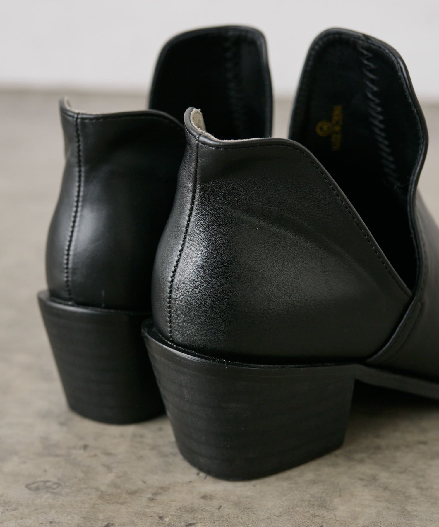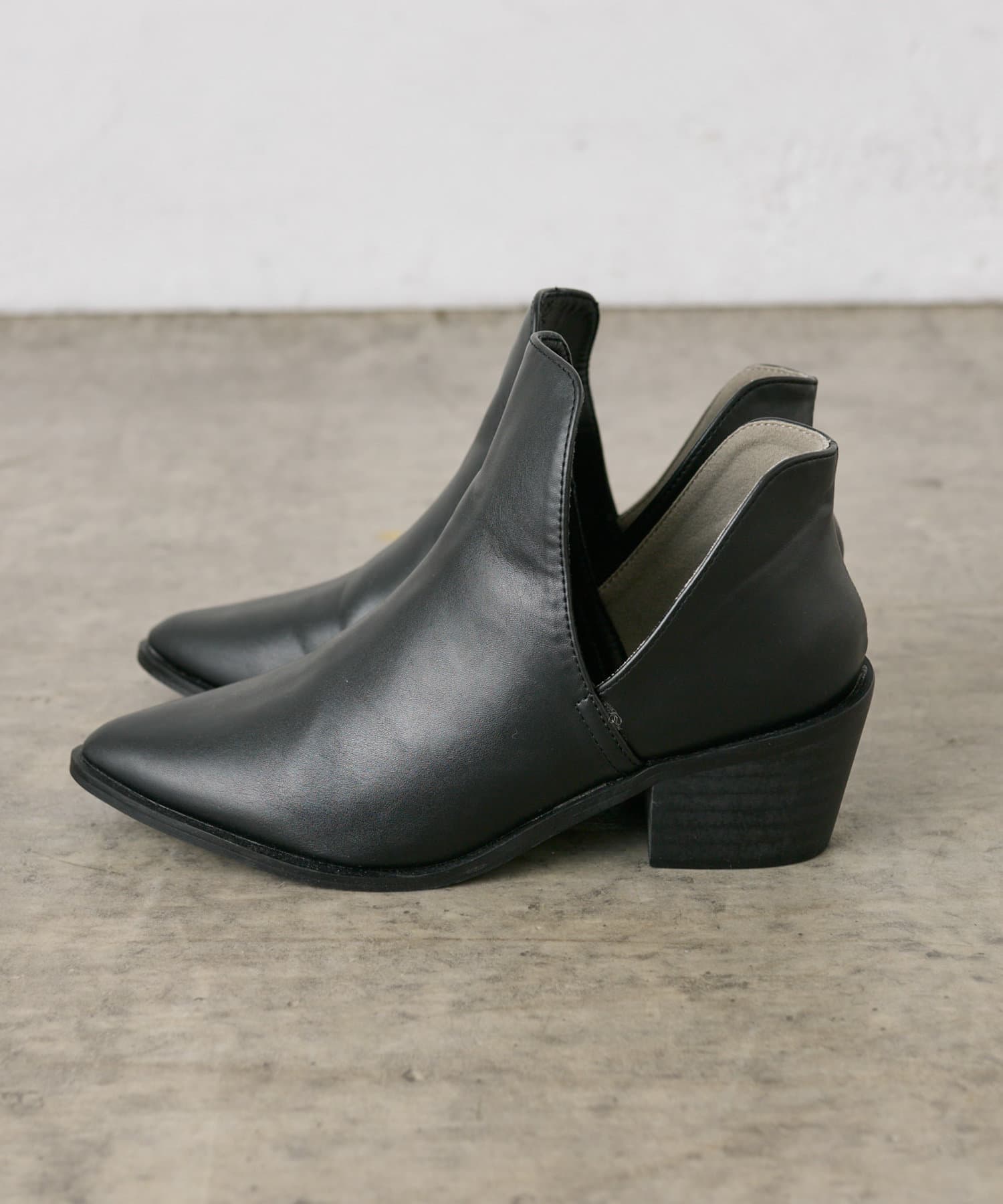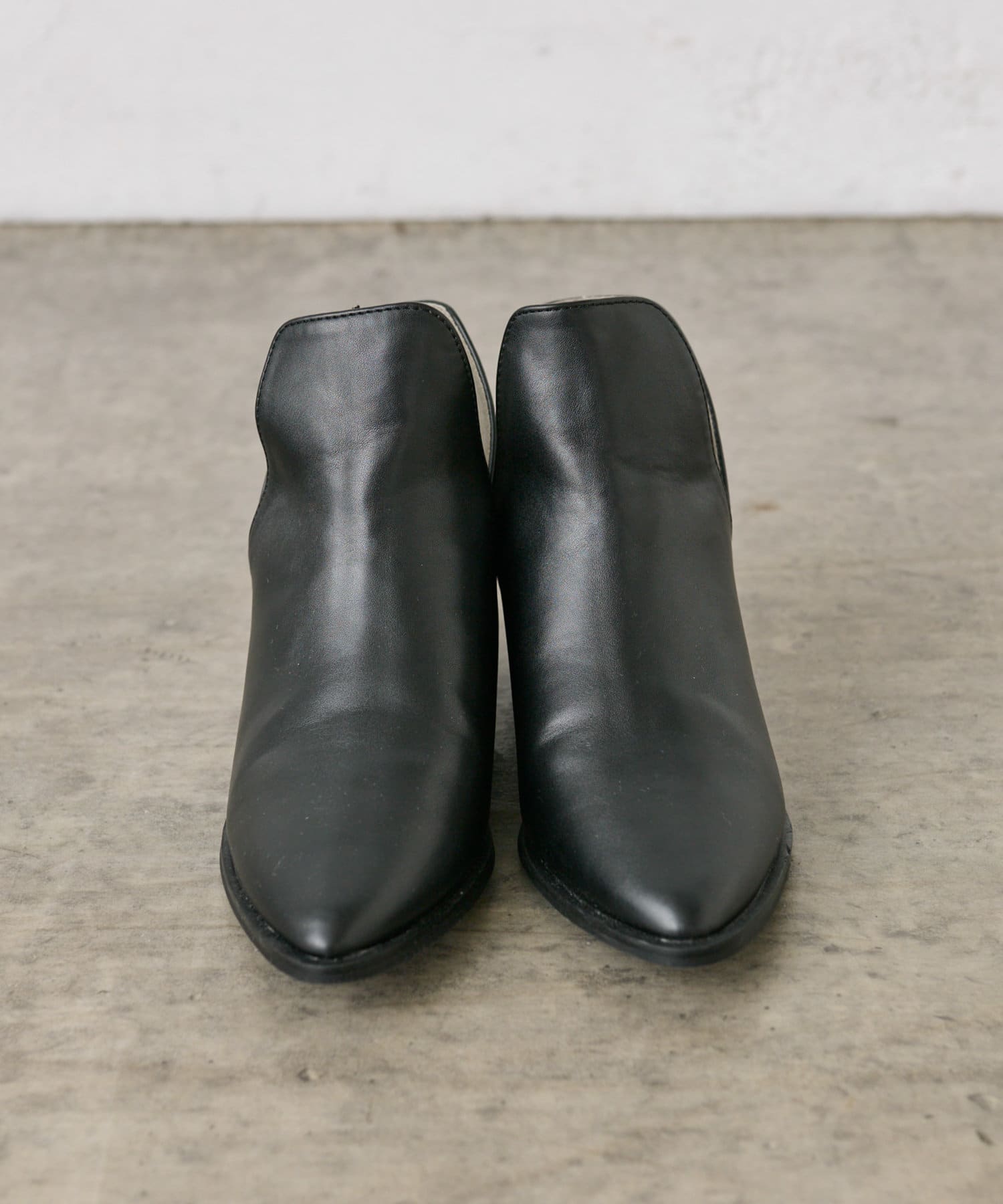 サイドVカットデザインとスタイリッシュなポインテッドトゥが特徴で、様々なコーディネートに合わせやすいブーティー。