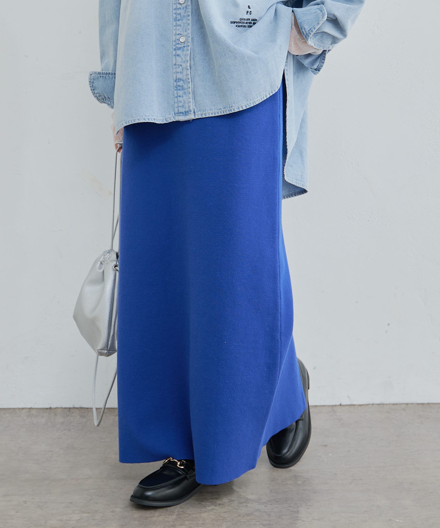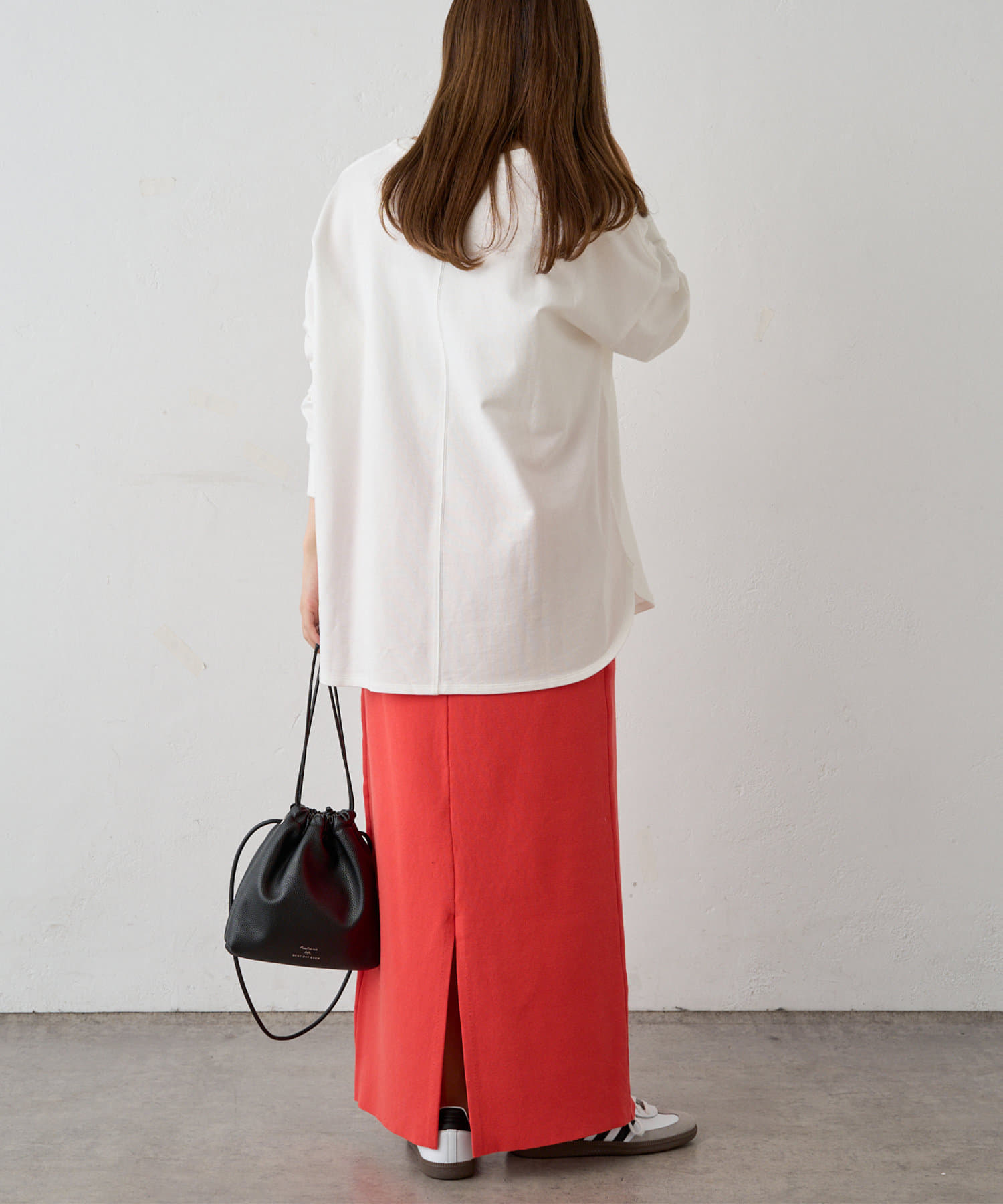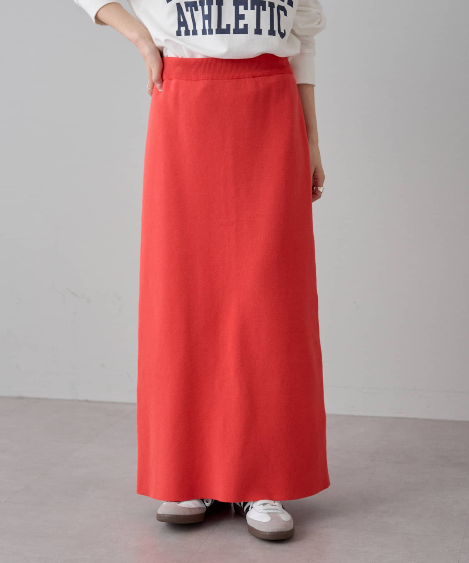様々なコーディネートに合わせやすいナローシルエットのスカート。