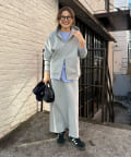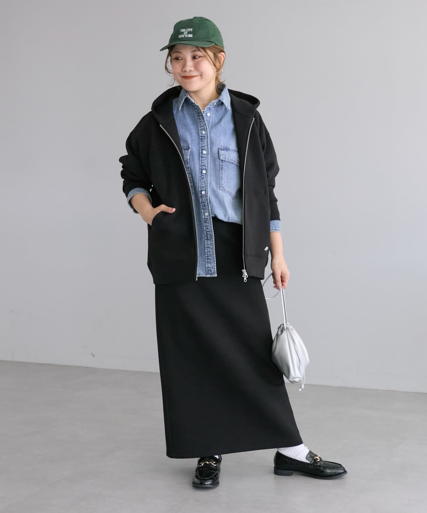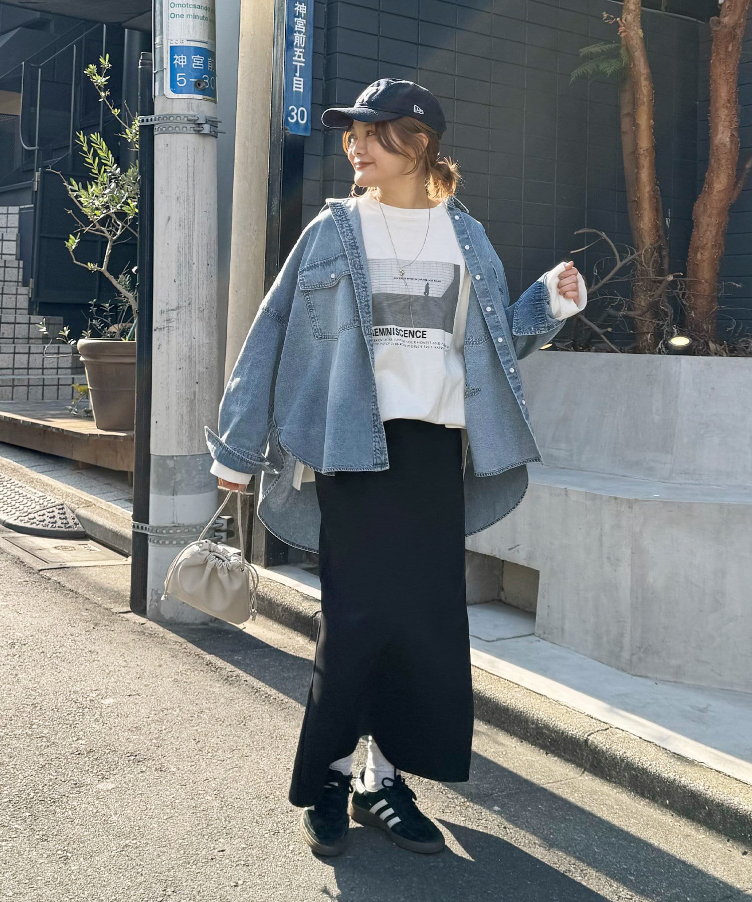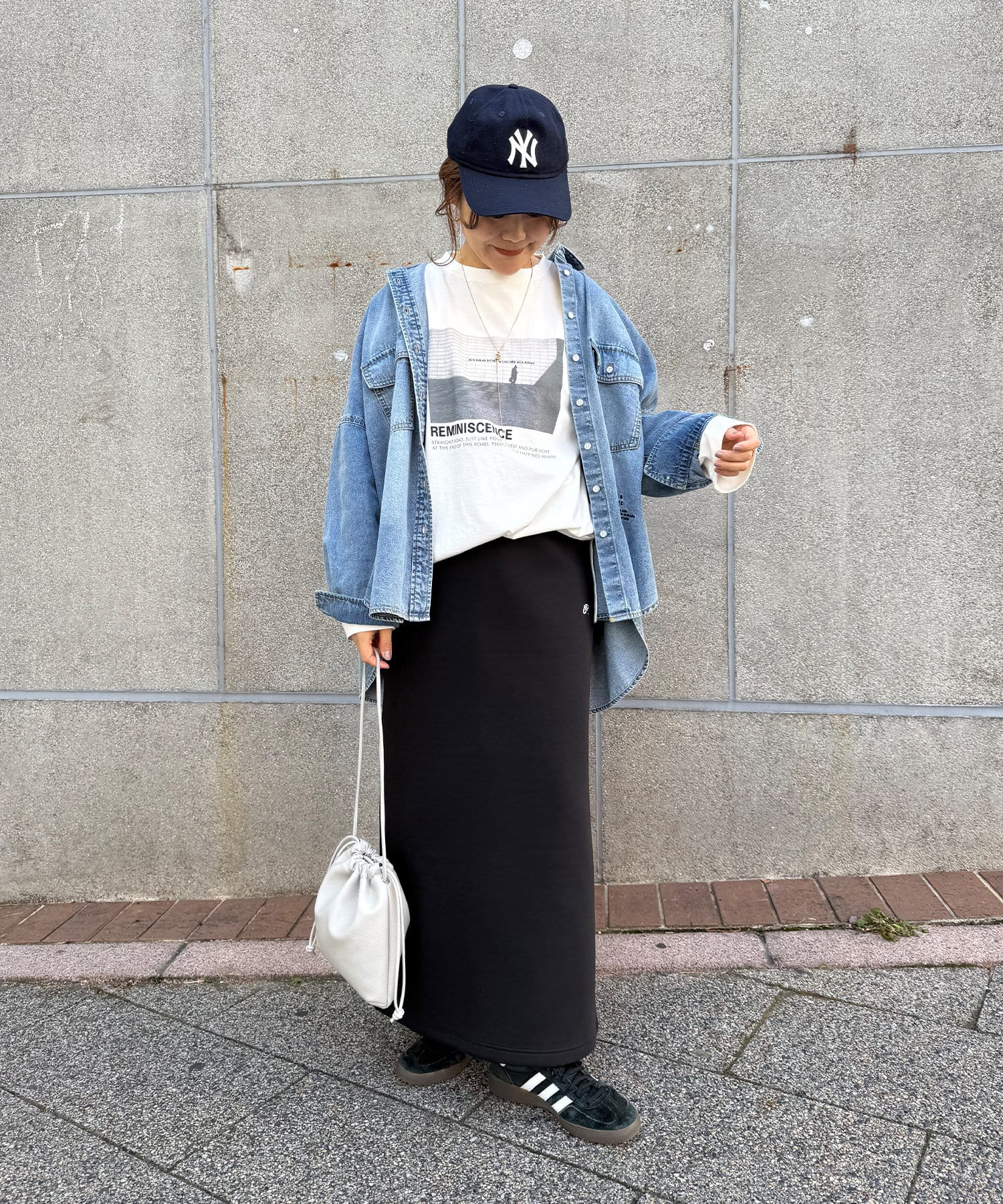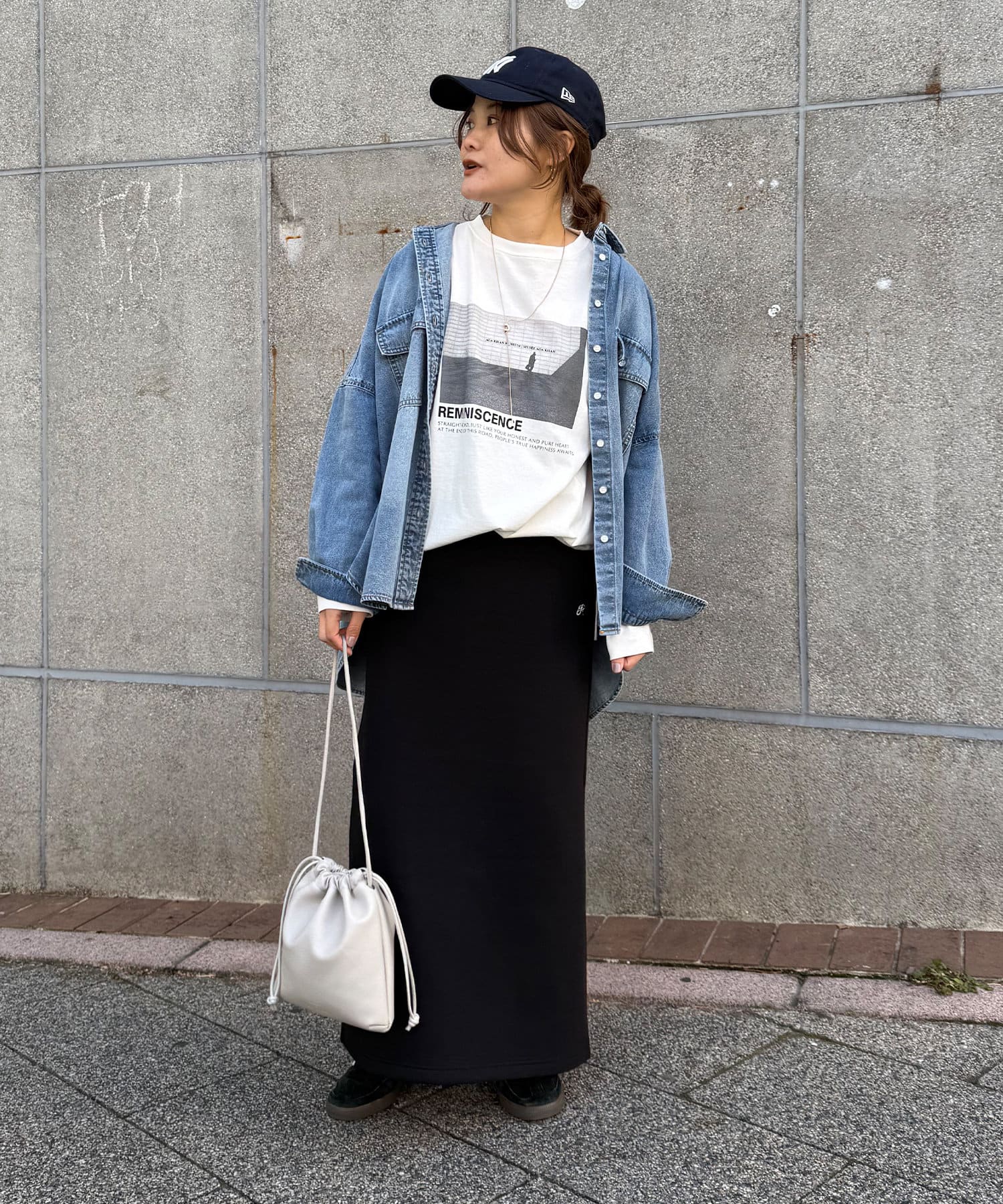 Iラインシルエットのため、ゆったりとした身幅のあるトップスと合わせるとメリハリのついたコーディネートになります。