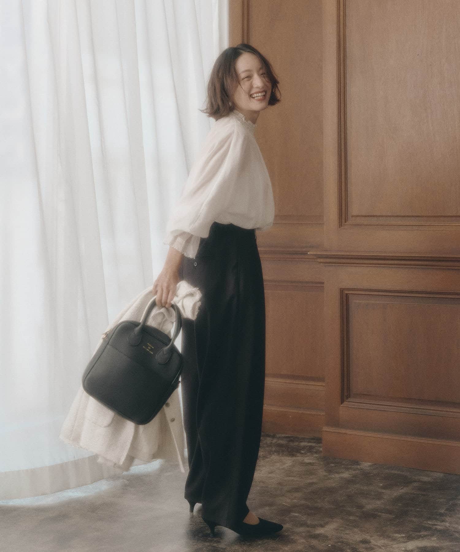 華やかなブラウスを合わせると、更にきちんと感を演出した着こなしが叶います。
