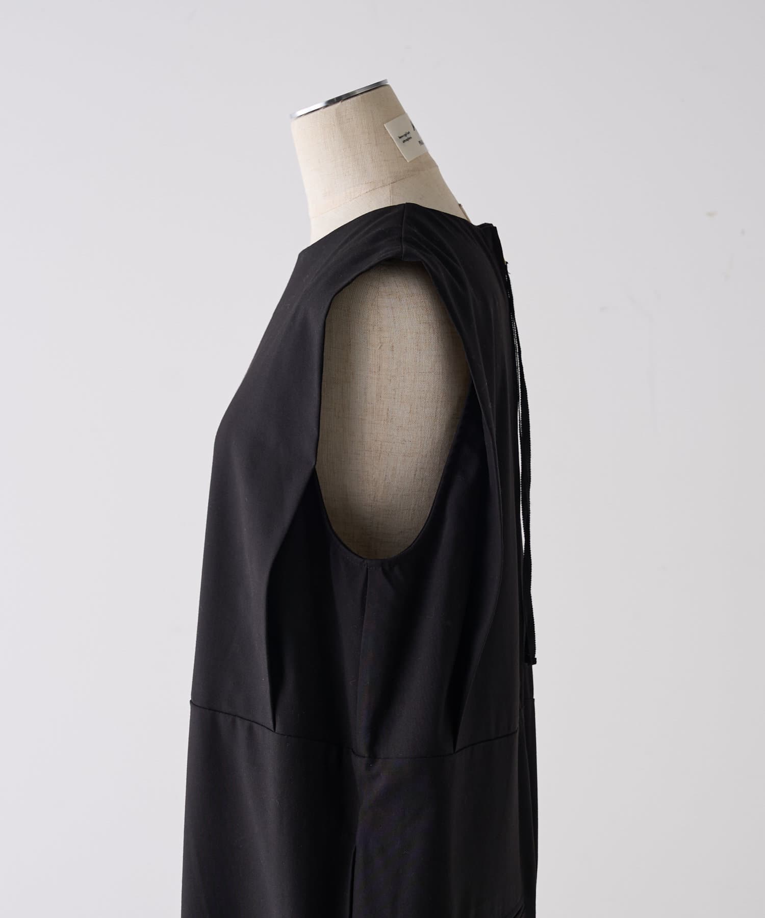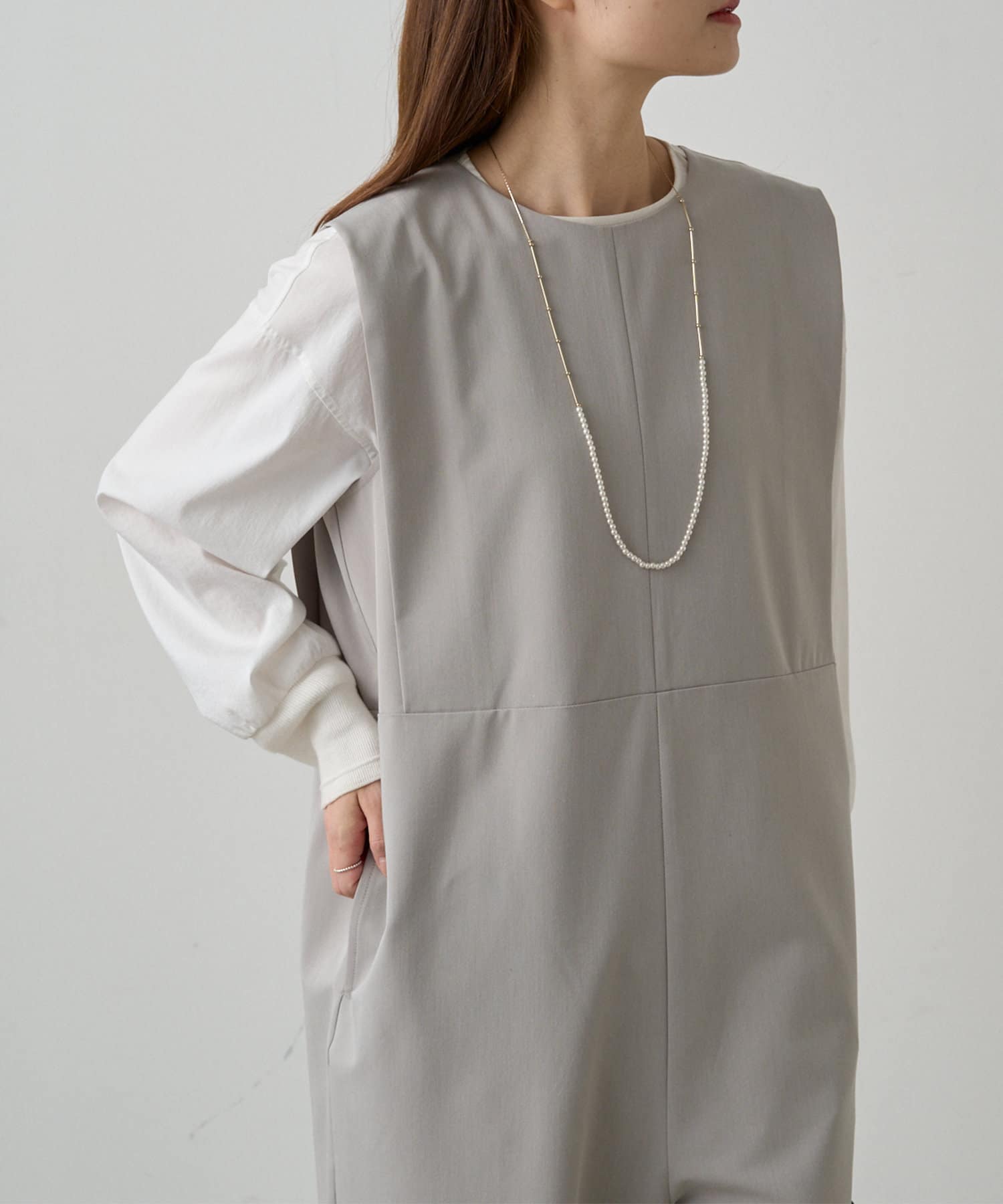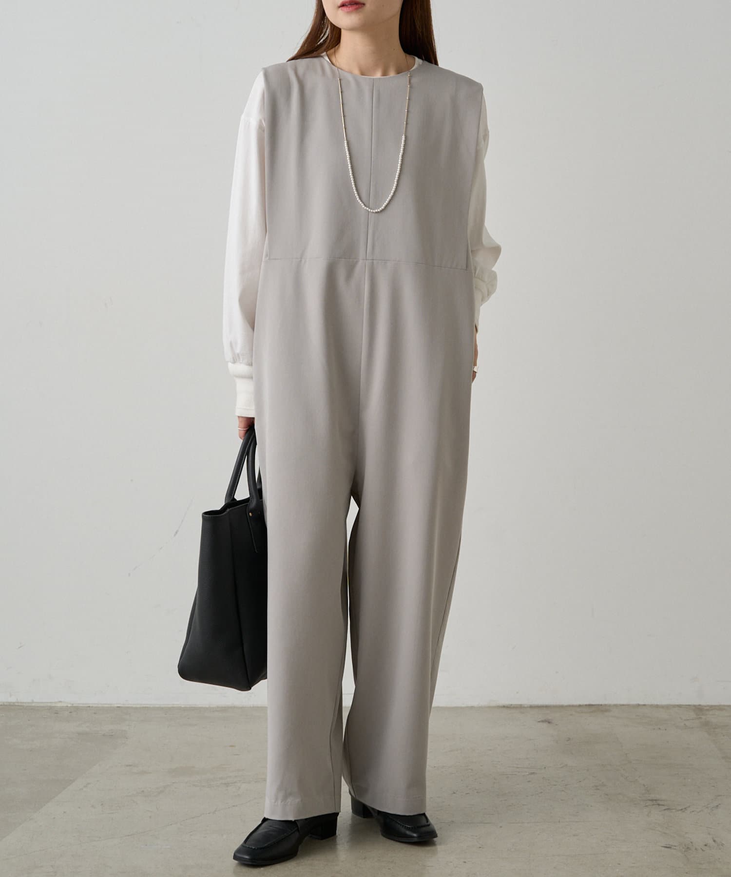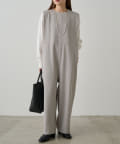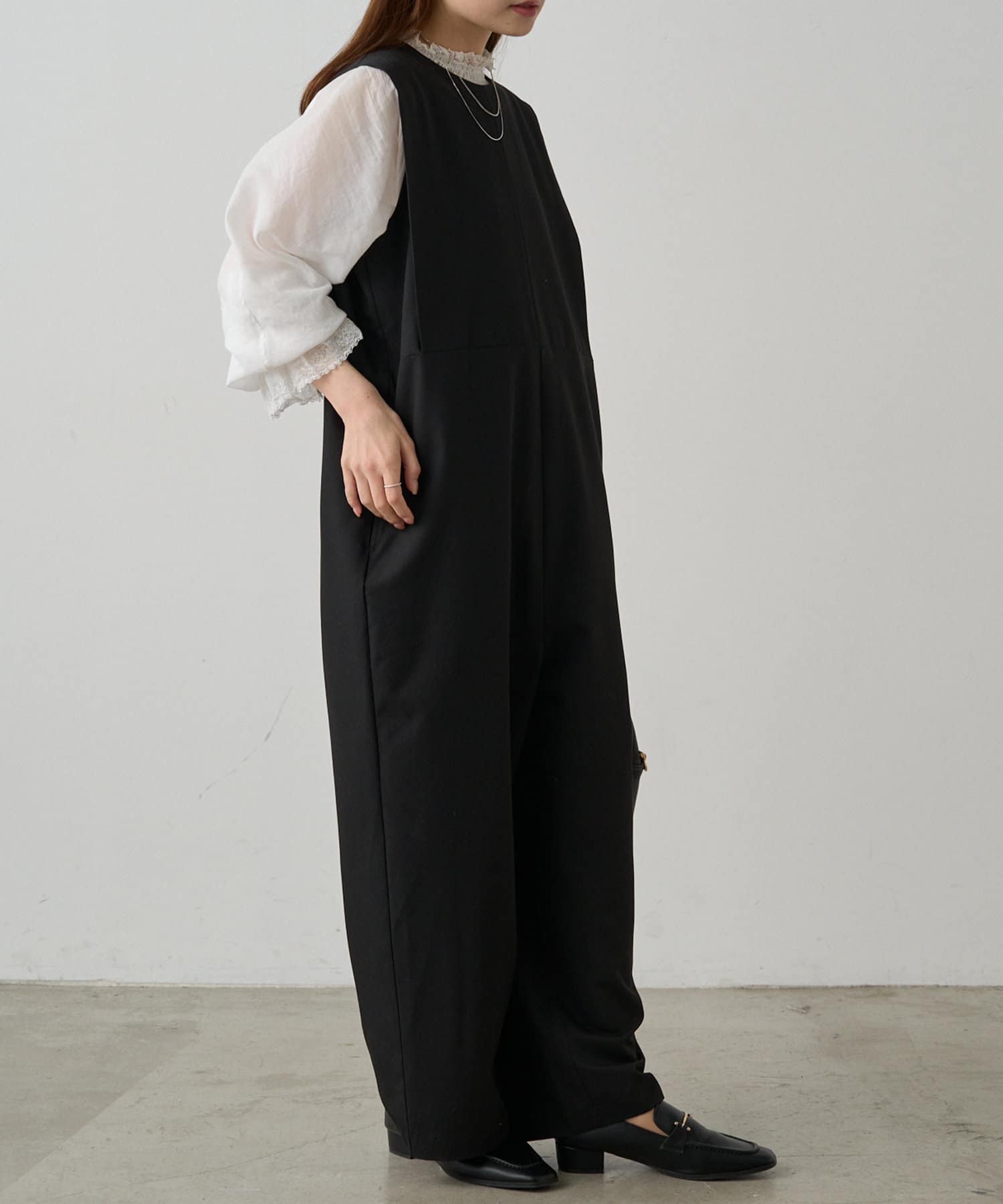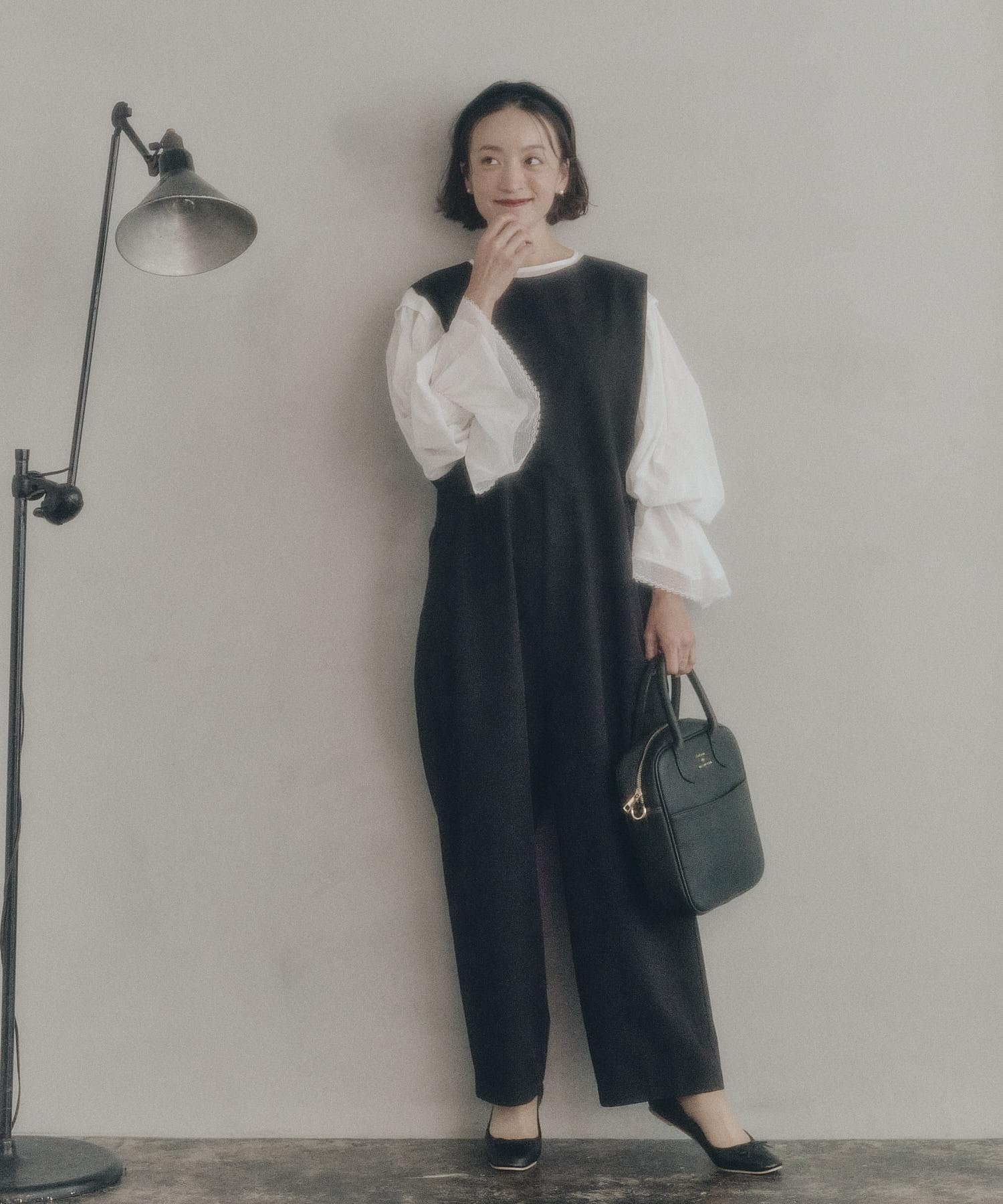 腰回りに膨らみをもたせたコクーンシルエットのオールインワン。