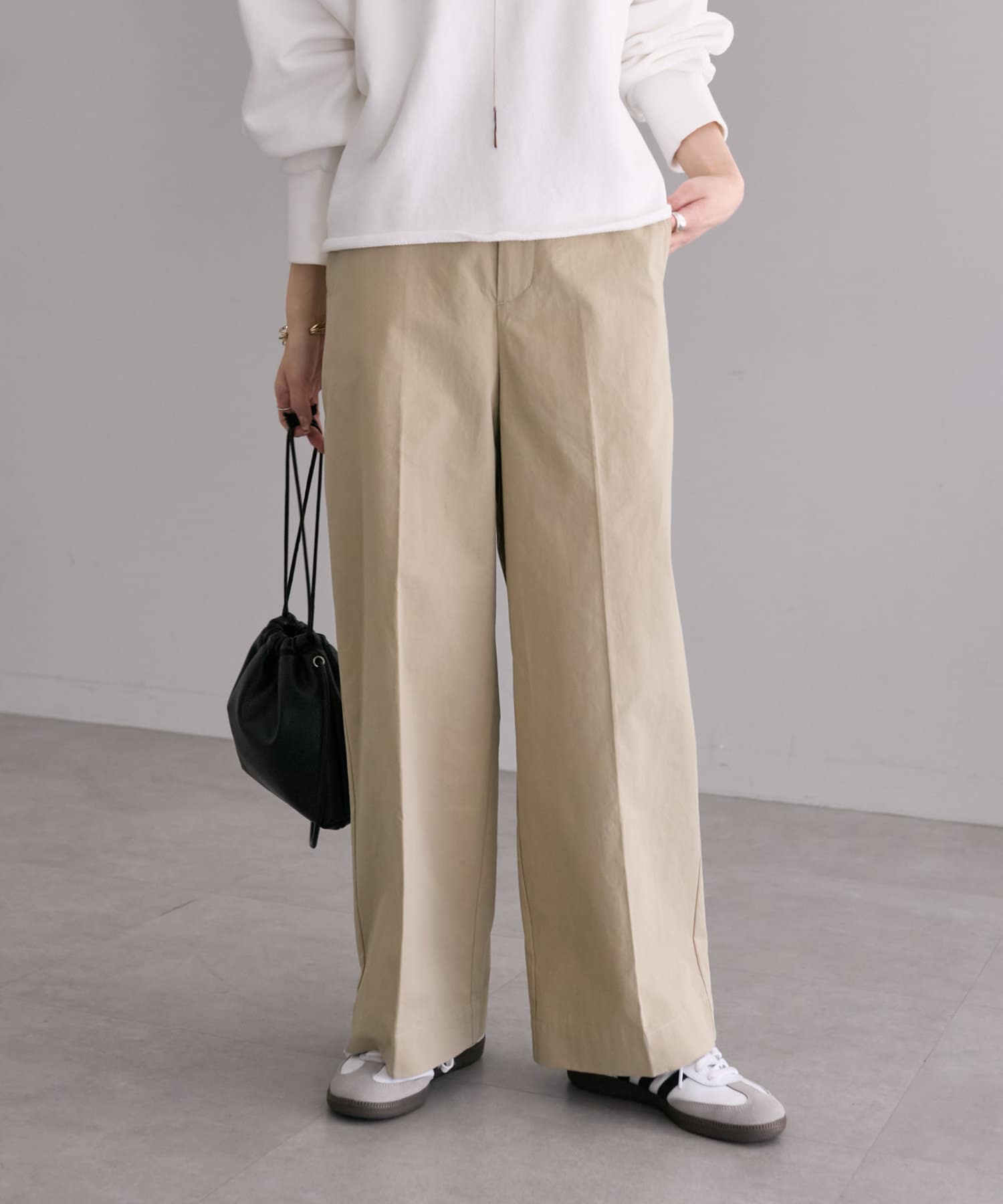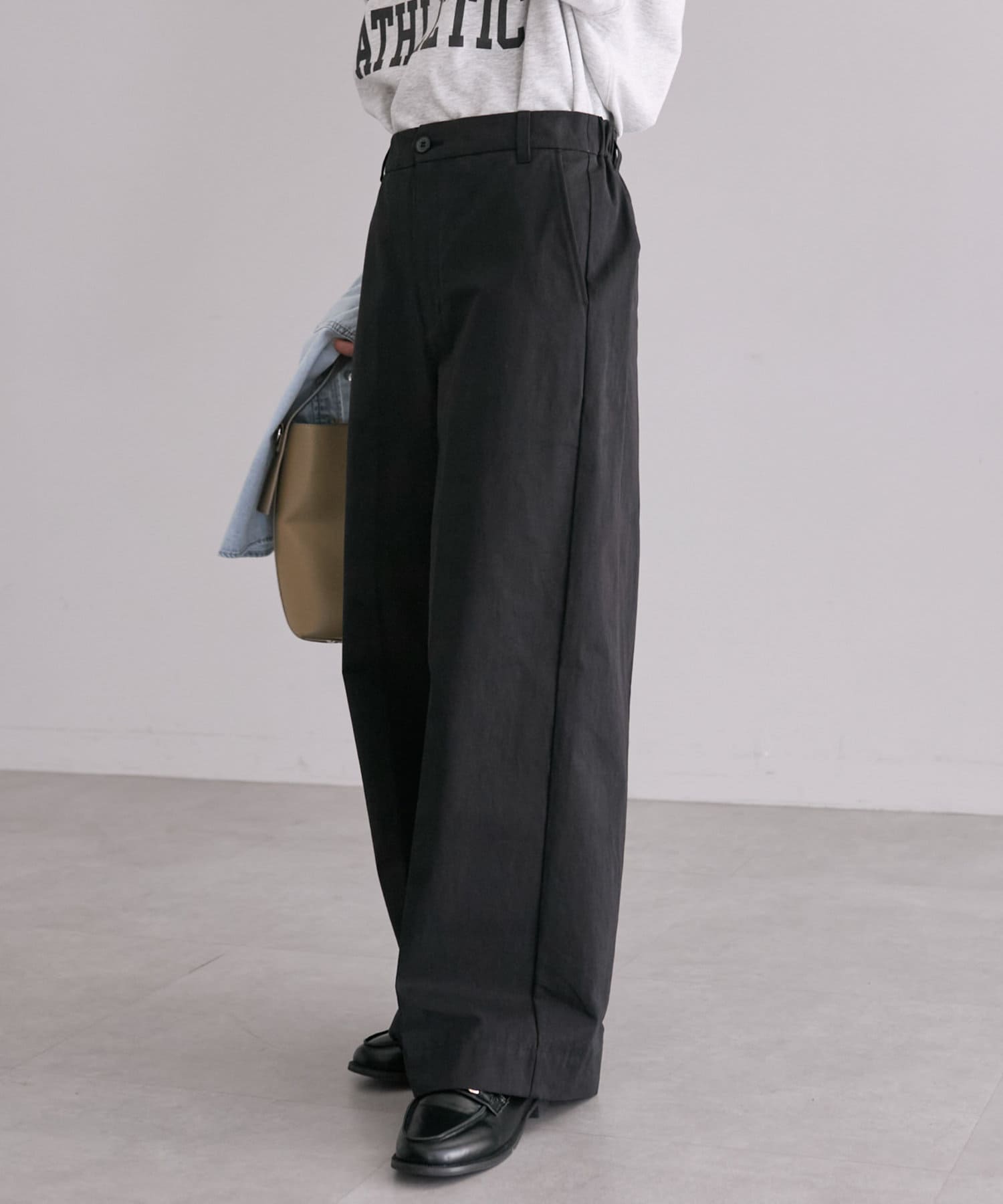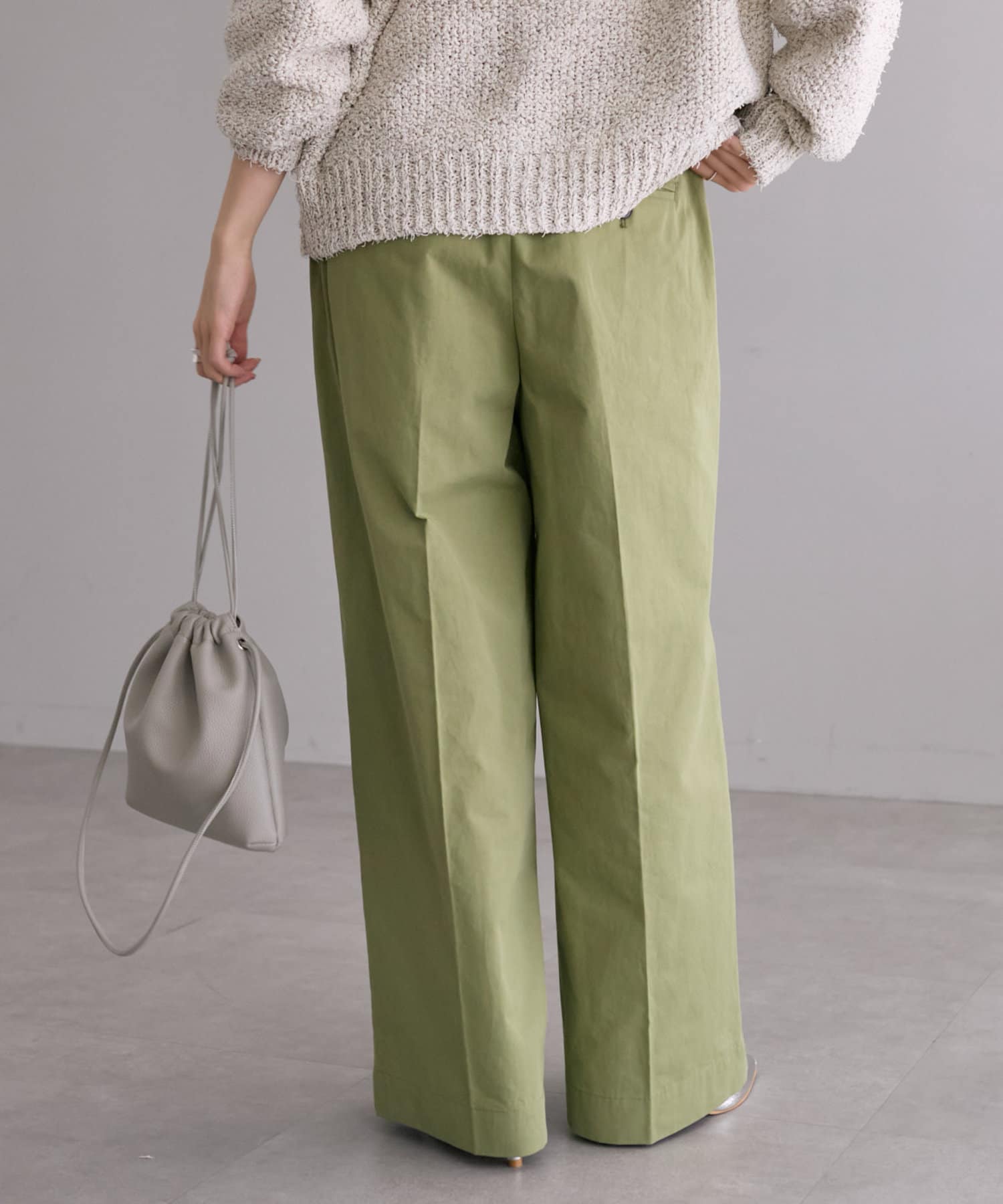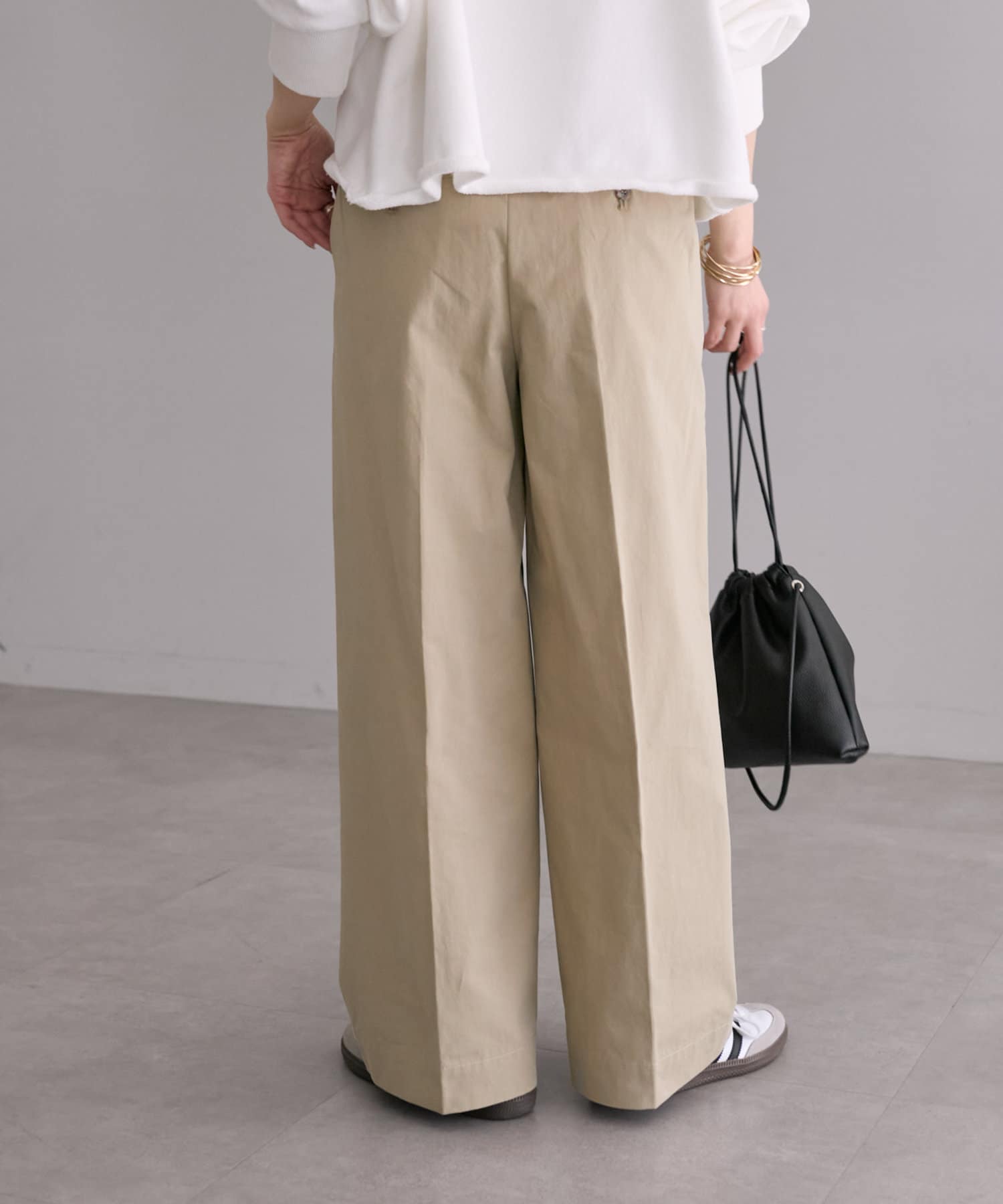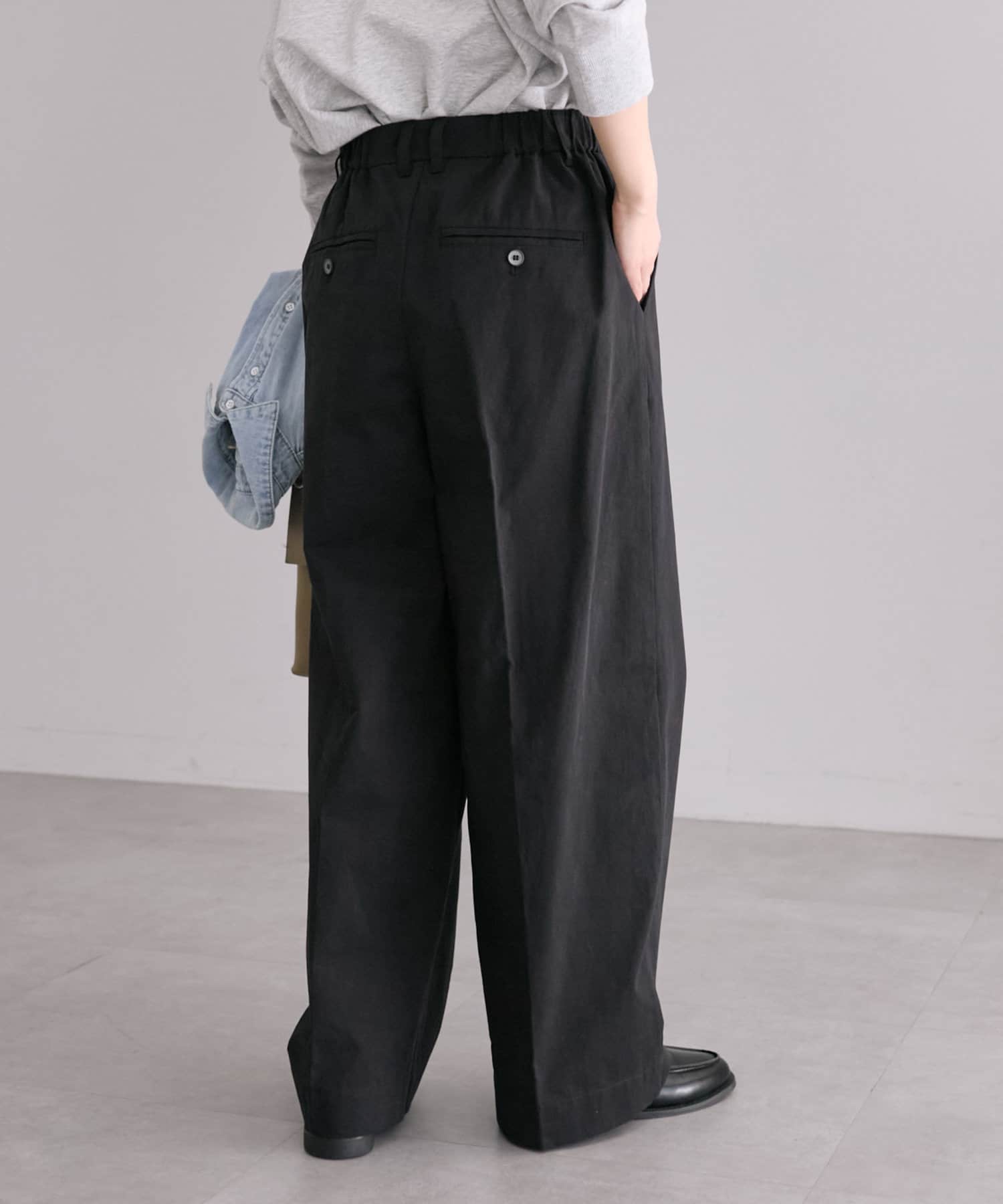 見た目以上にゆとりを感じる幅感とウエストサイドのゴムでラフな穿き心地。